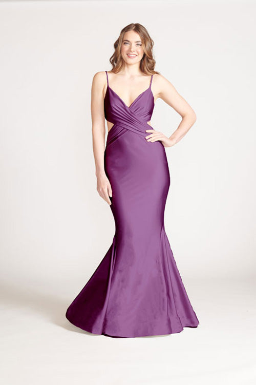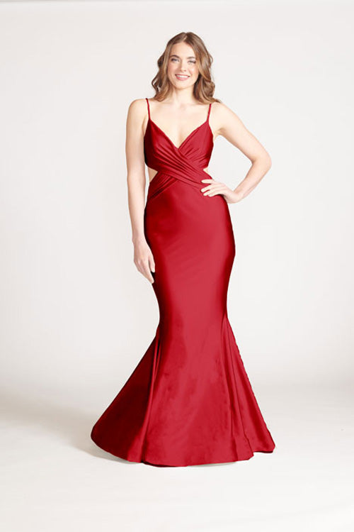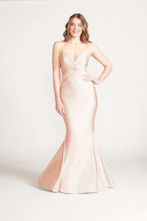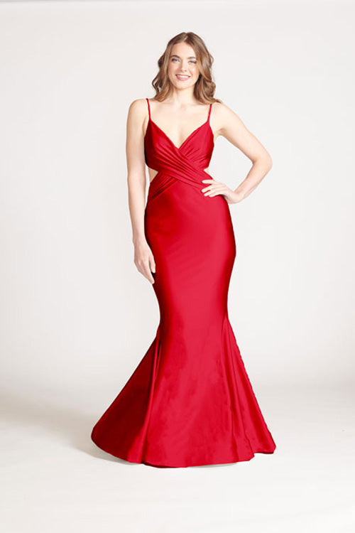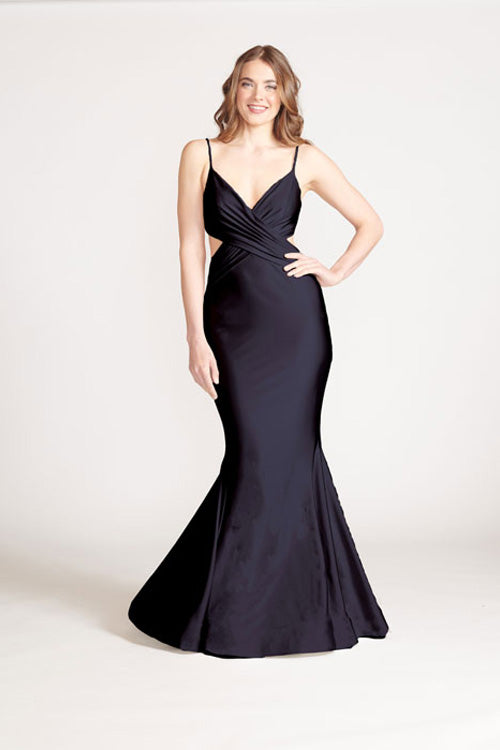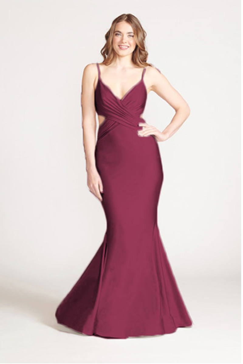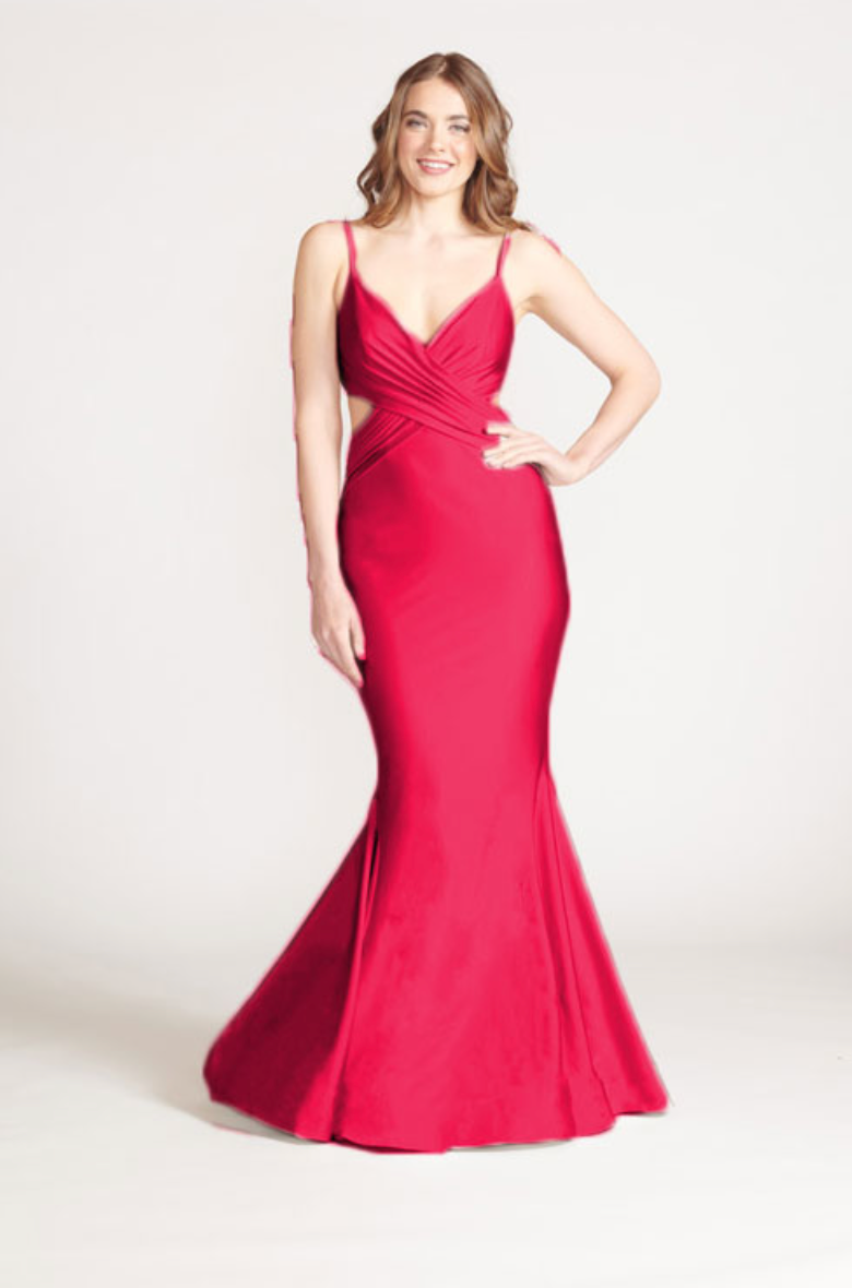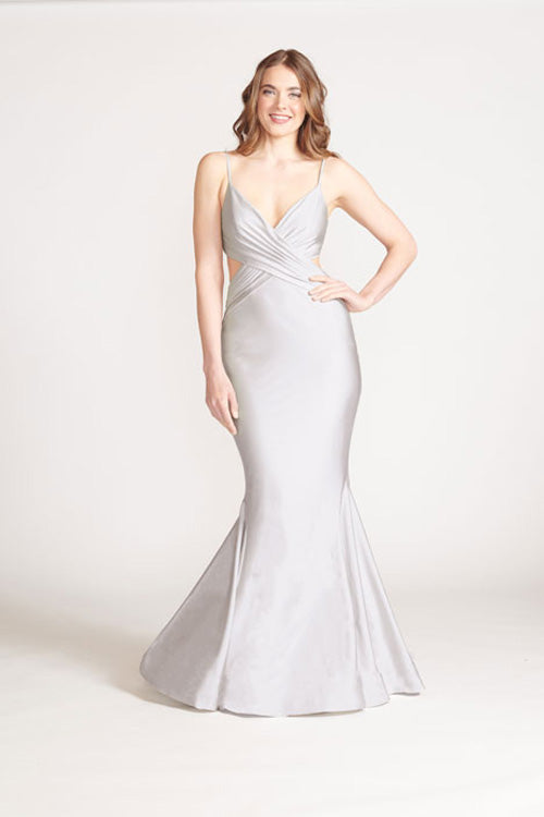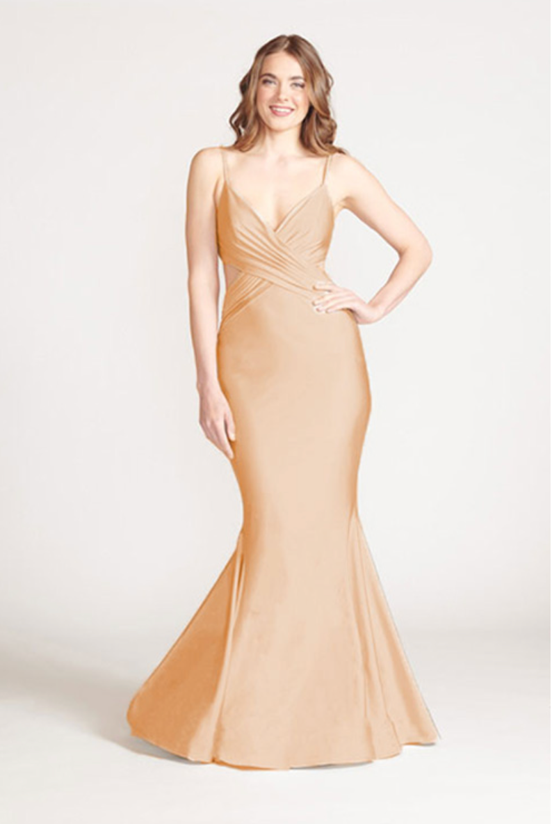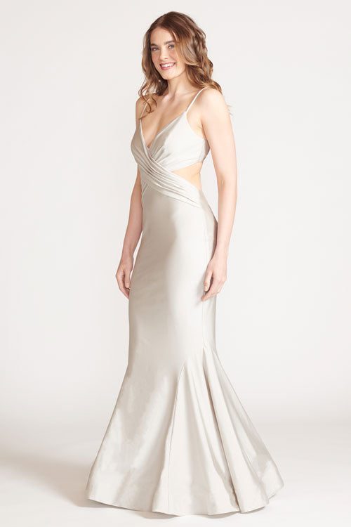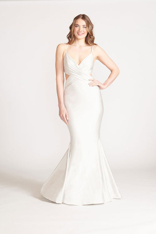V-neck horsehair mermaid lux gown with criss-cross bodice draping, side cut outs and bralette style back