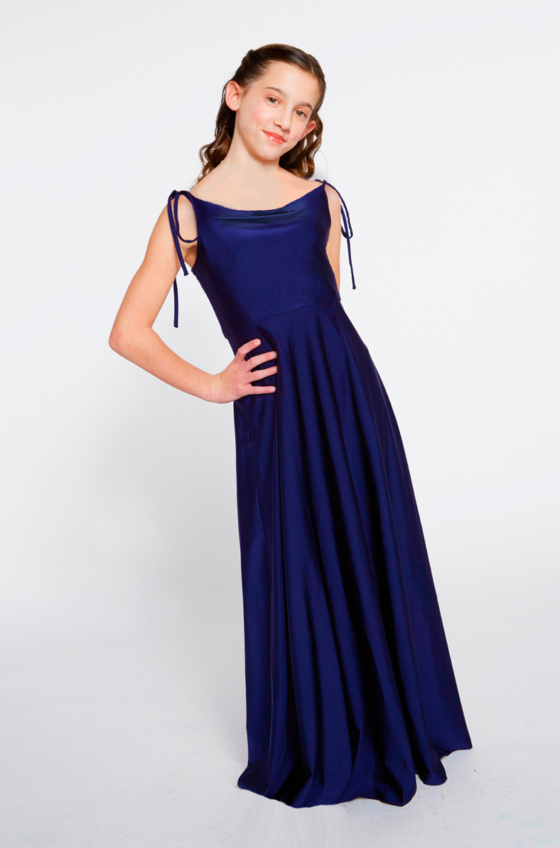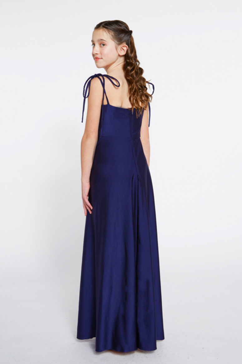 Bari Jay Bridesmaid Dress 2251-JR. Adjustable tie straps to a cowl bodice and wrap ball skirt. The colors displayed on our website may vary from screen to screen and will differ from the actual fabric color.