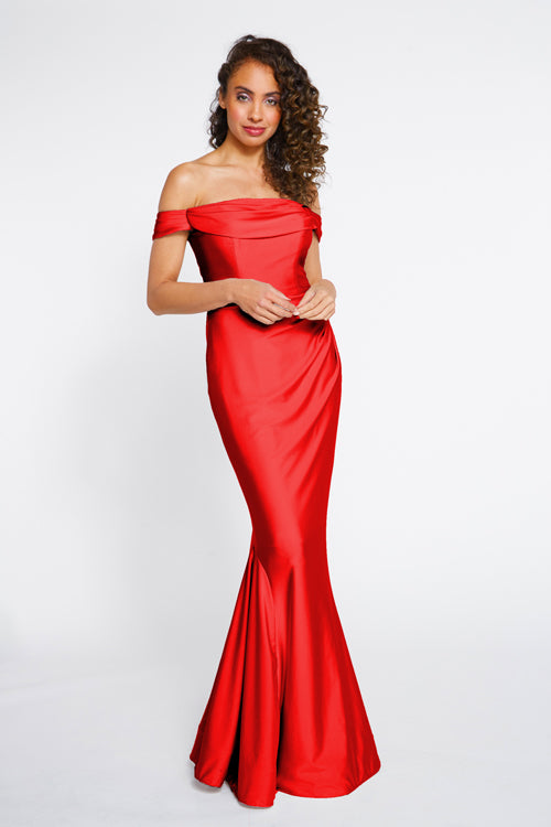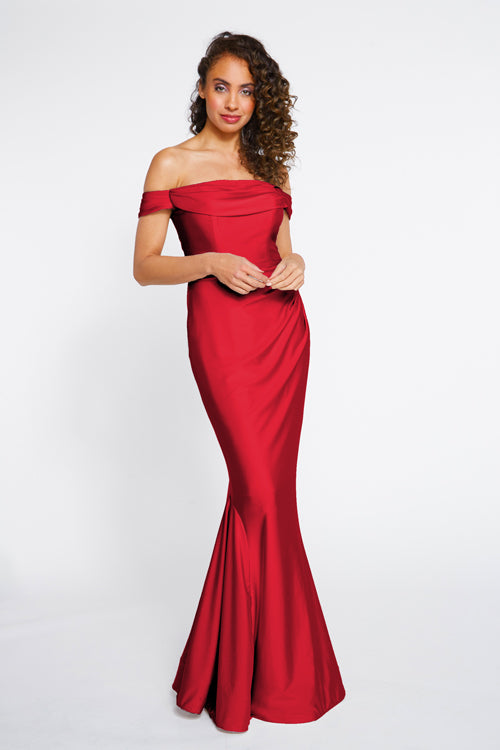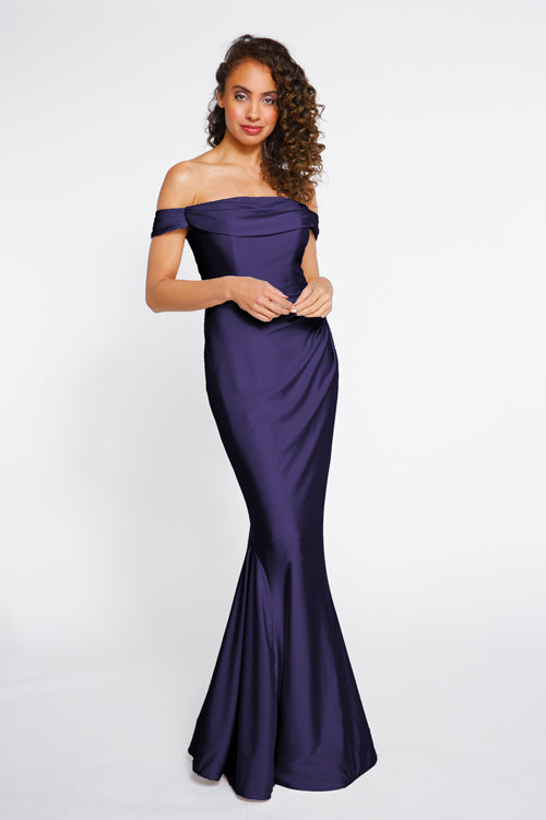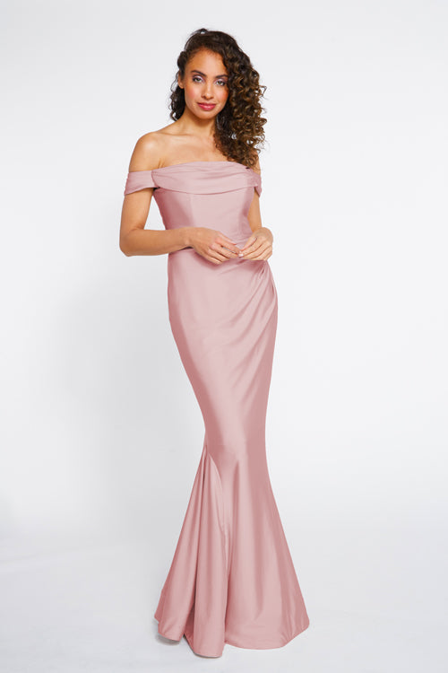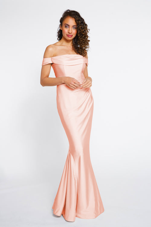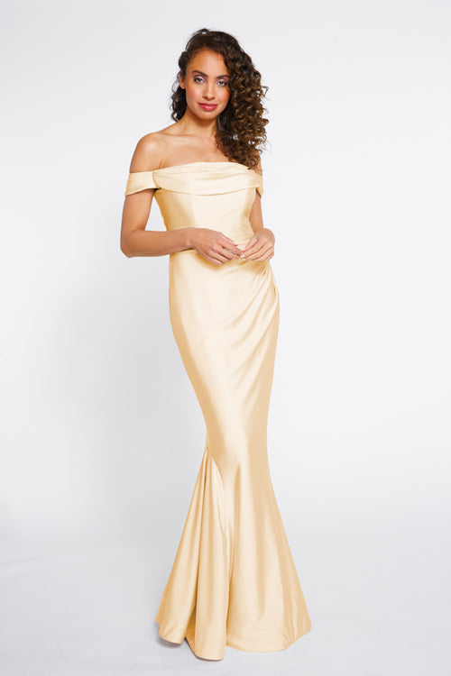 Bari Jay Bridesmaid Dress 2255. Off the shoulder cowl draped bodice with pleated horsehair hem skirt. The colors displayed on our website may vary from screen to screen and will differ from the actual fabric color.