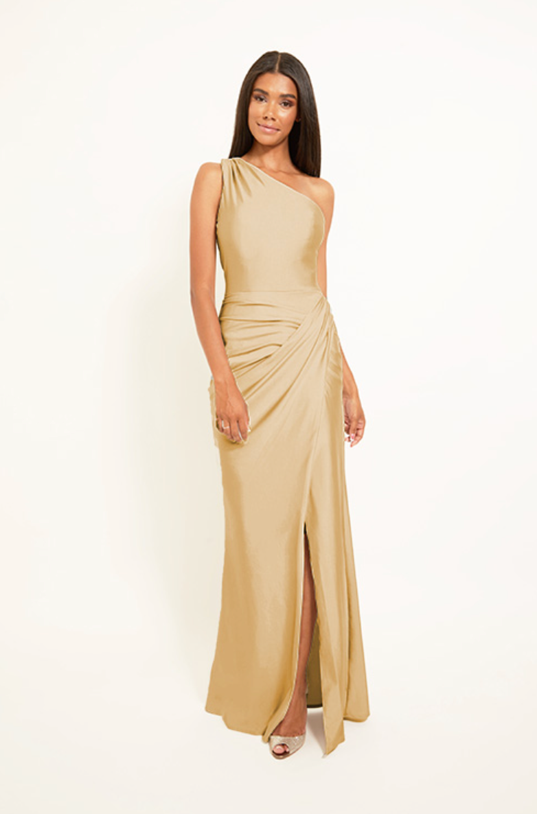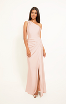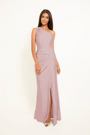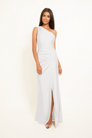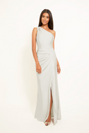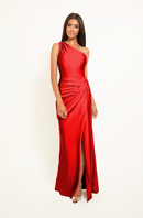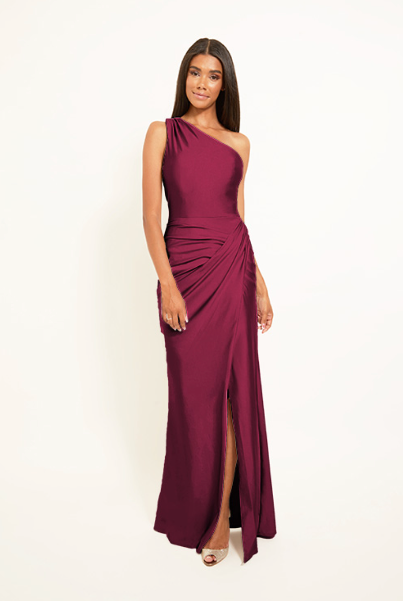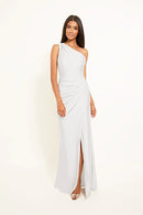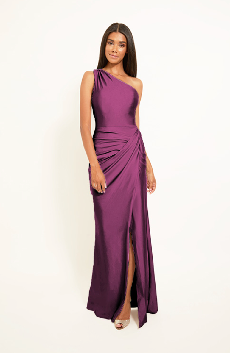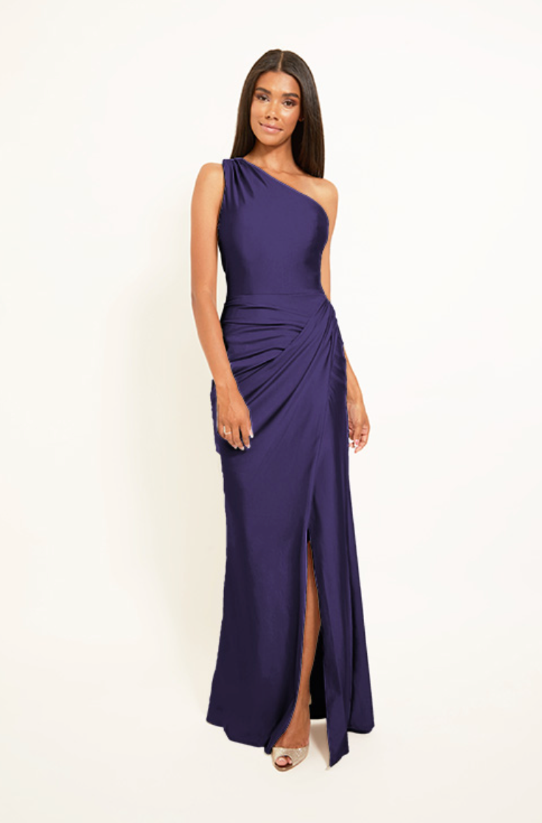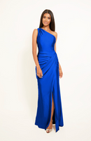 Lux stretch gathered one shoulder dress with draped skirt and a slit.