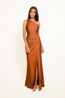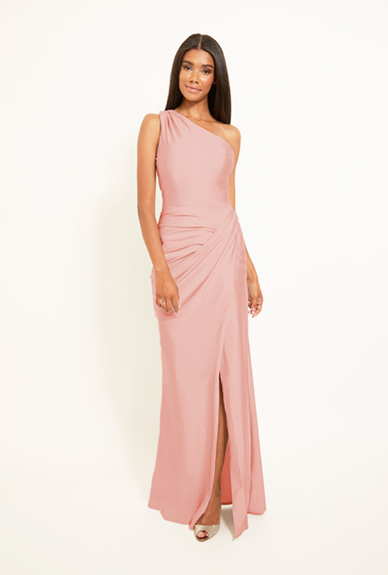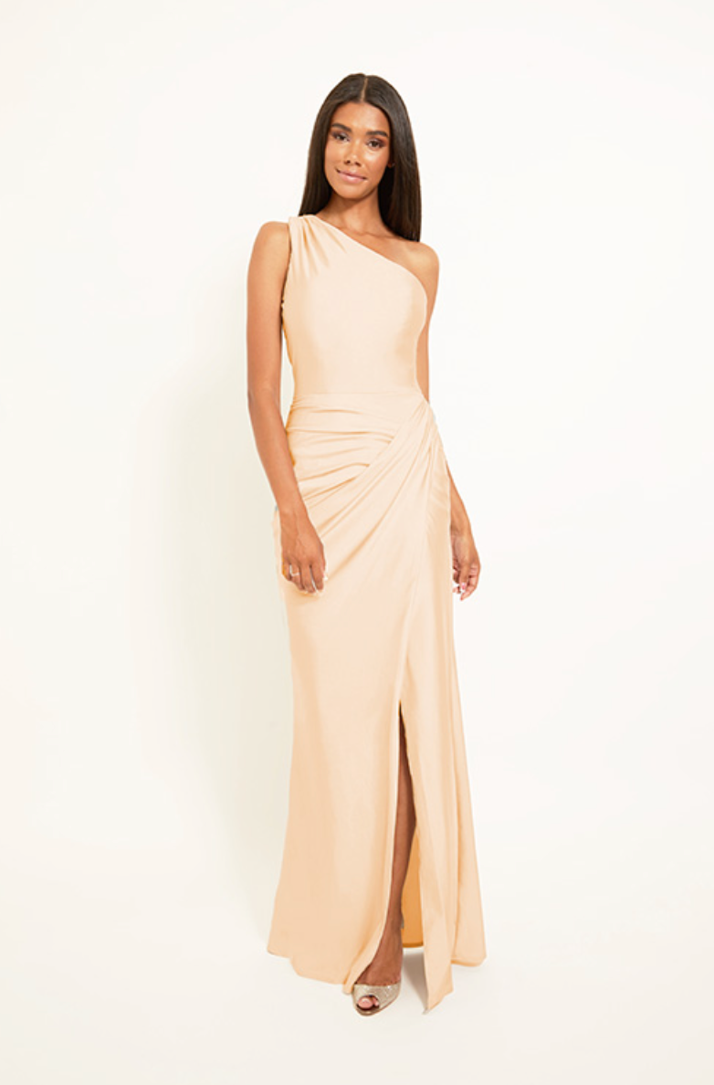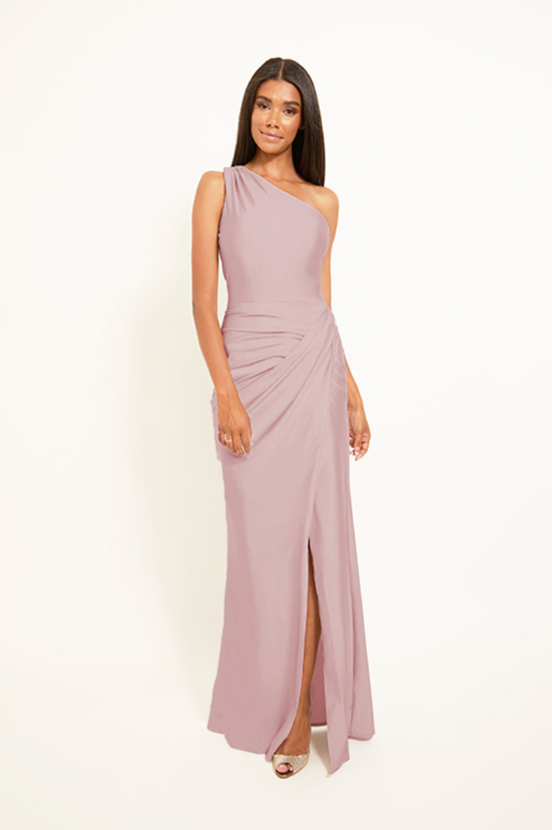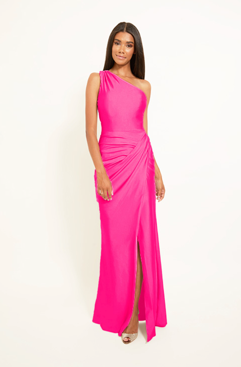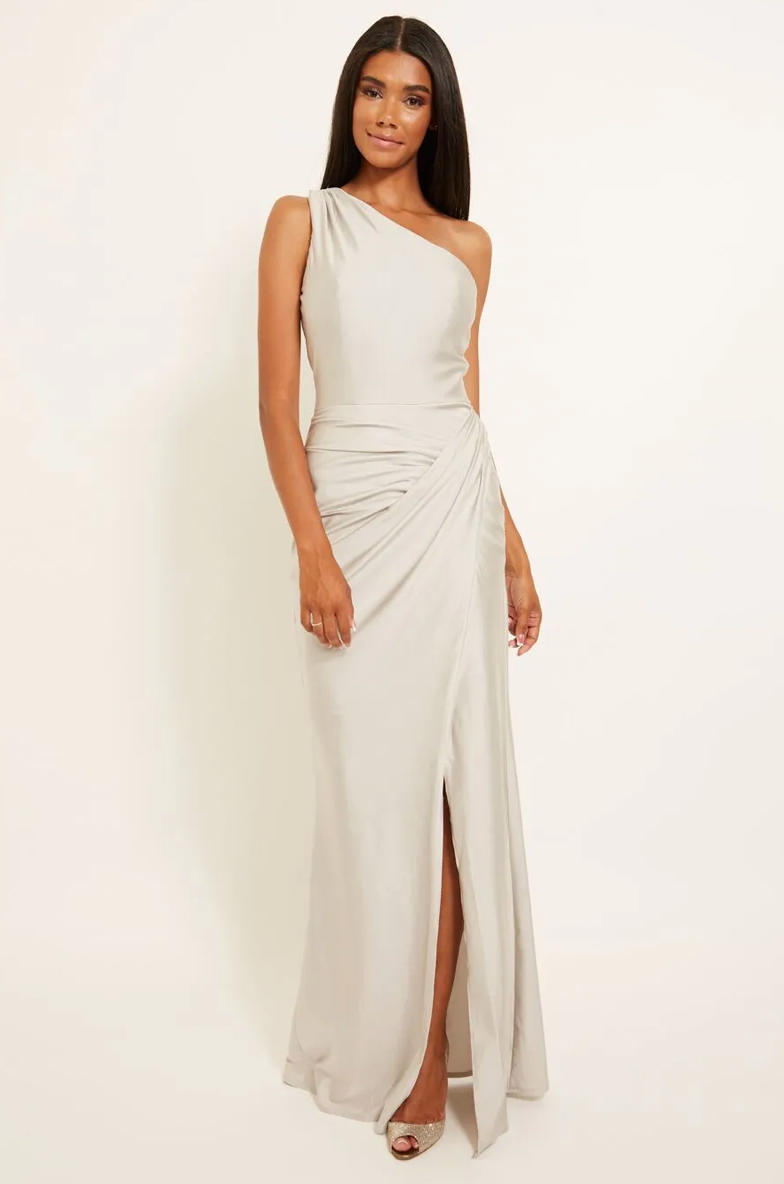 Lux stretch gathered one shoulder dress with draped skirt and a slit.