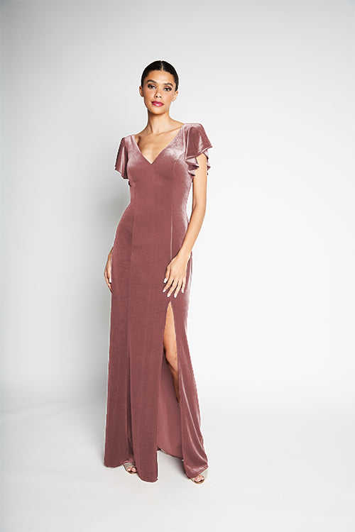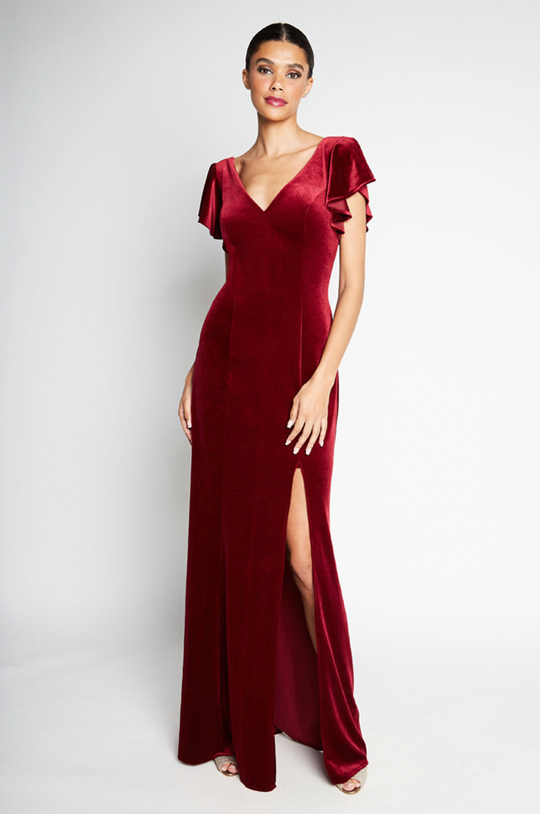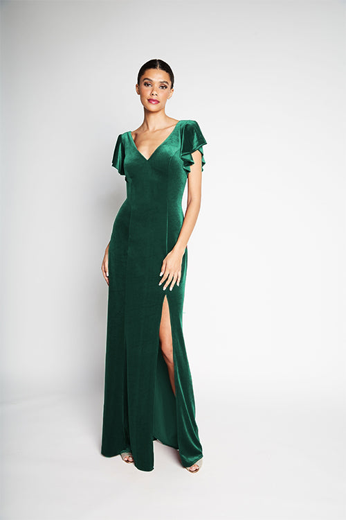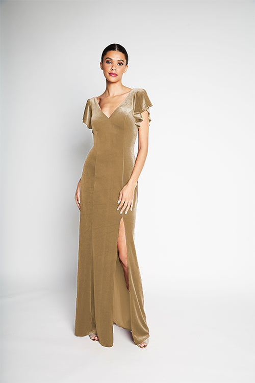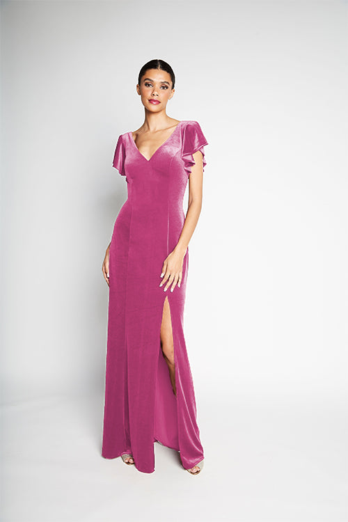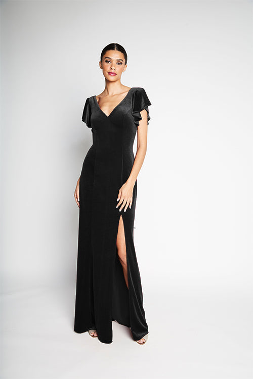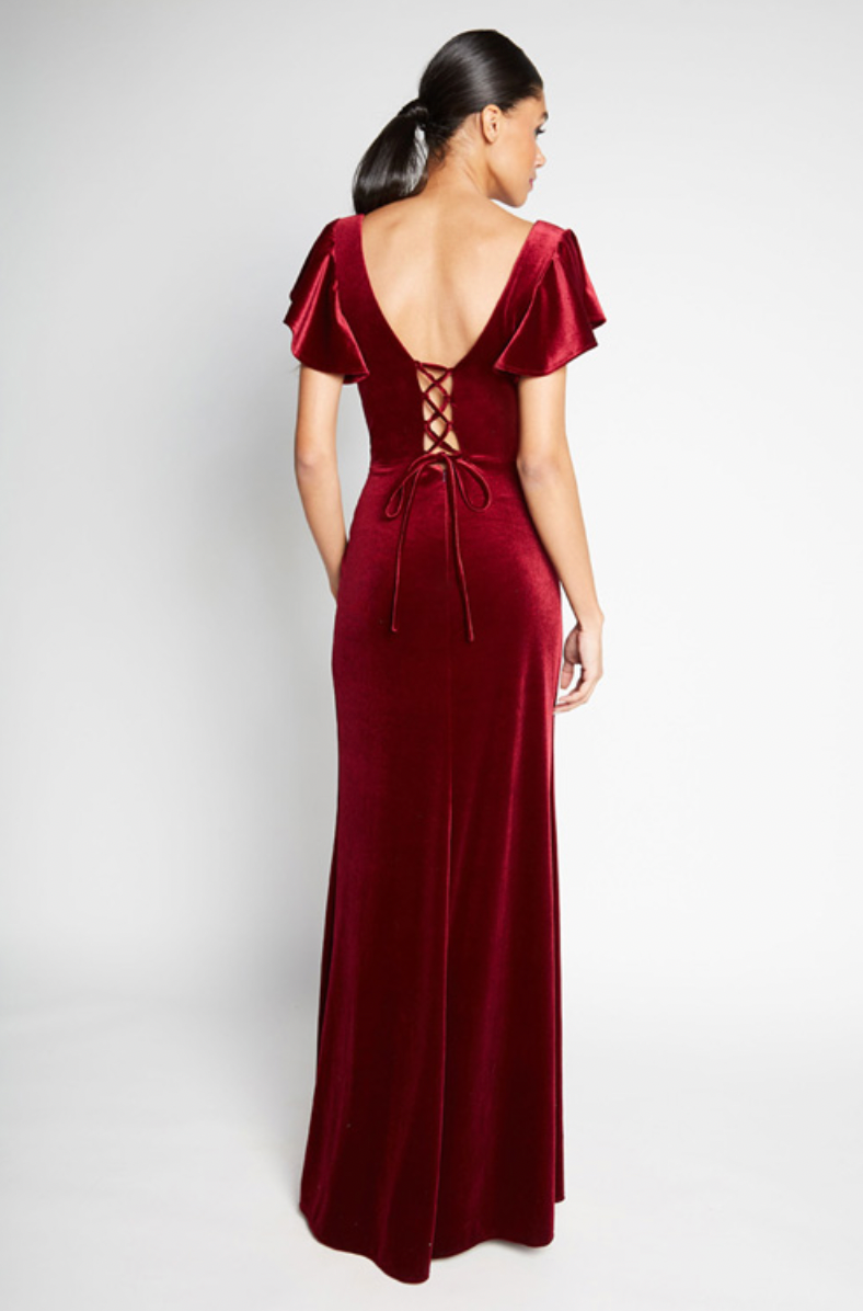 V-neck flutter sleeve bodice with tied corset back. Slim A-line skirt with slit.