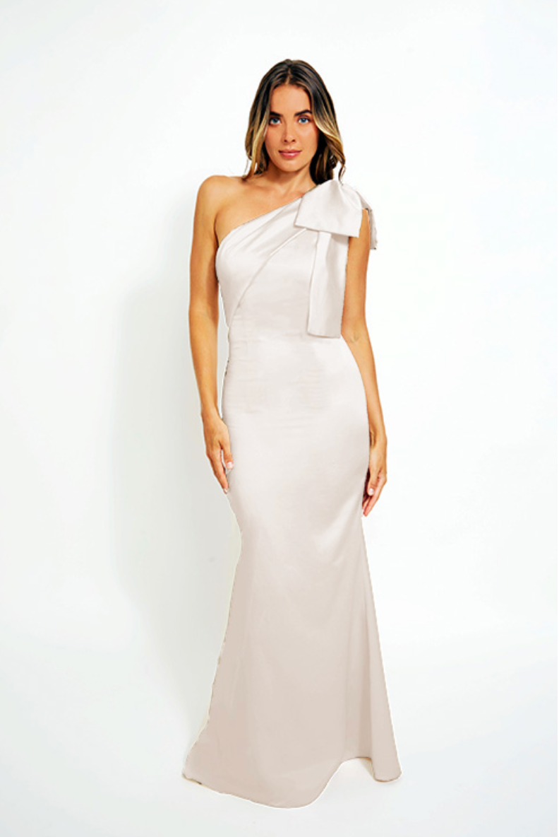 One shoulder with oversized bow and draping across bust. Fit and flare skirt.