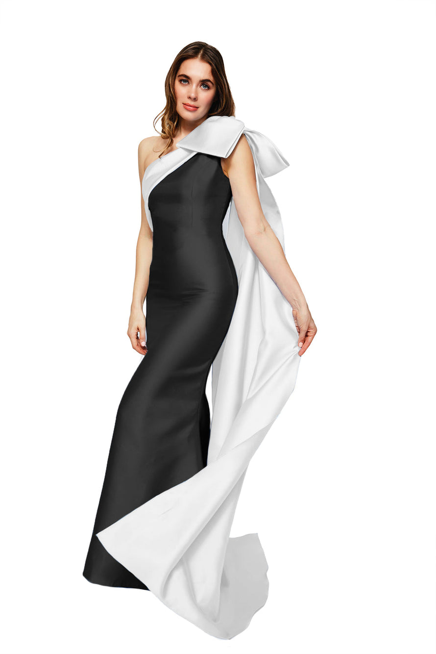 This one shoulder Mikado sheath dress features an oversized removable shoulder bow with a train and a mermaid skirt. Shown in Mist.