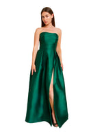 This strapless Bridesmaid Dress features a pleated bodice, open back and an A-line skirt with box pleats and a sultry slit in Mikado. Shown in Navy.