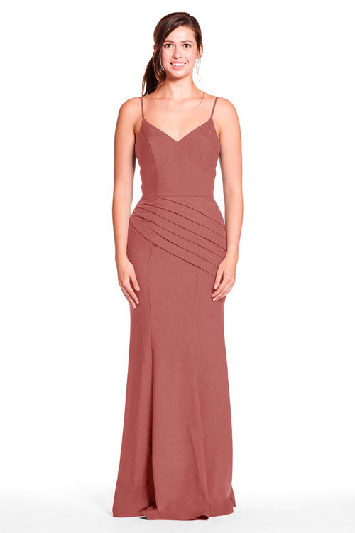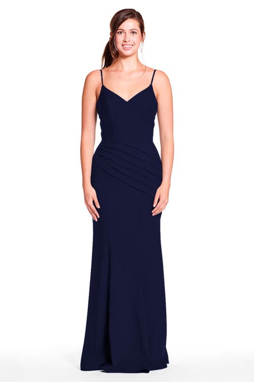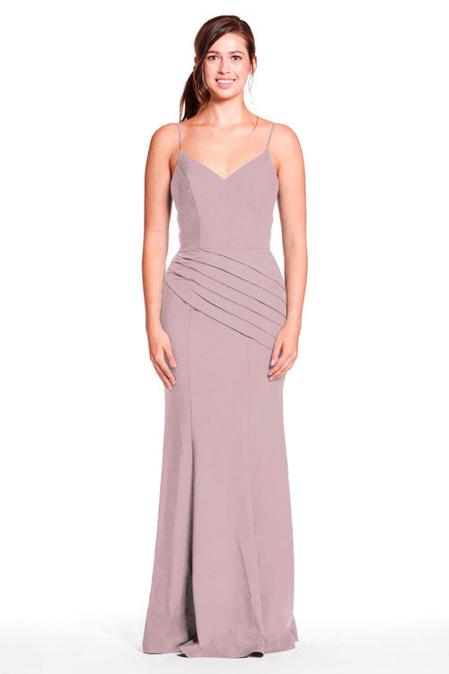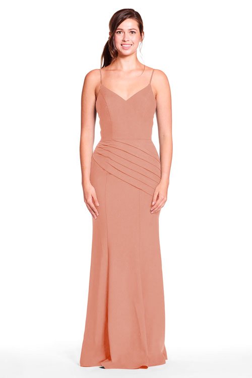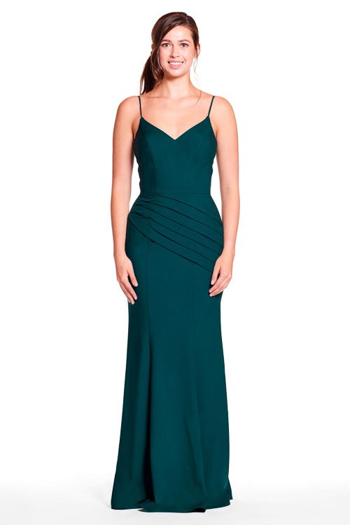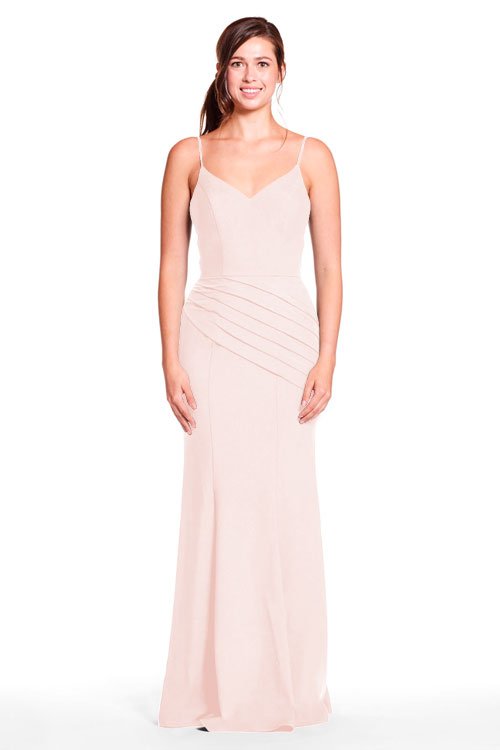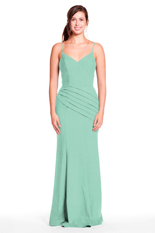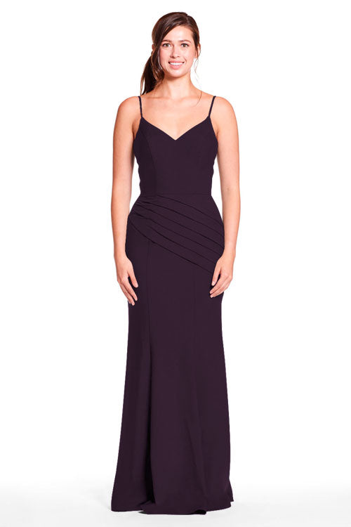 Spaghetti strap sweetheart bodice with diagonal pleated skirt.