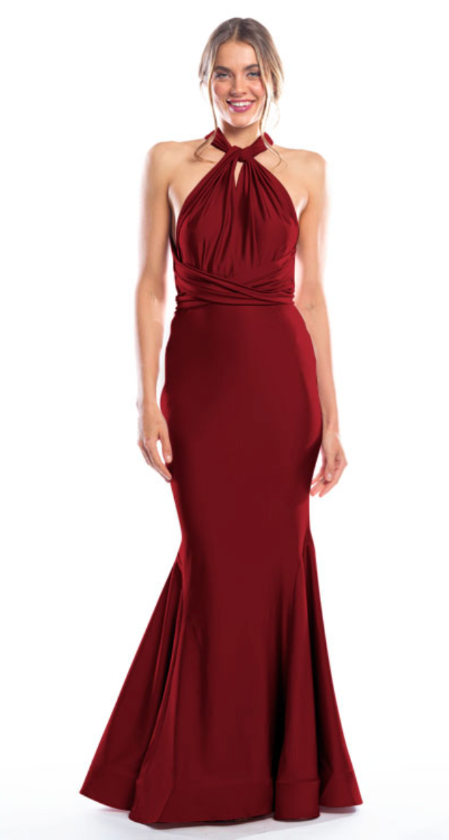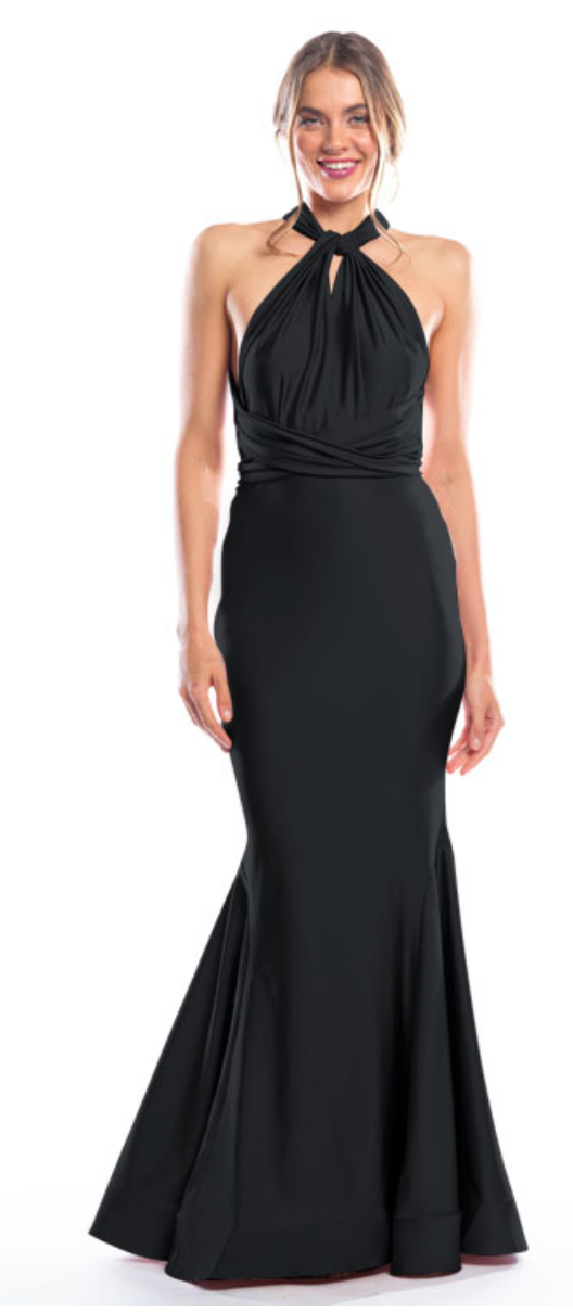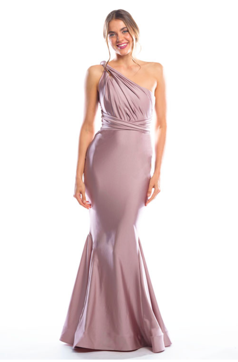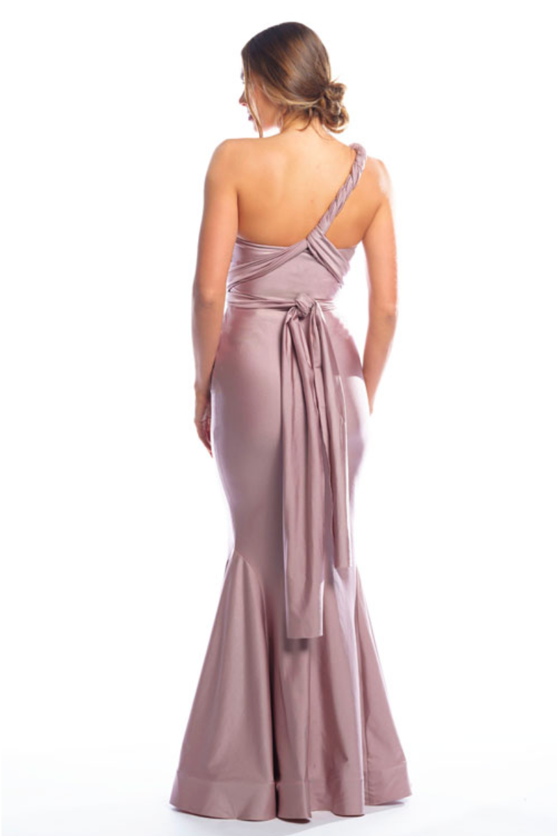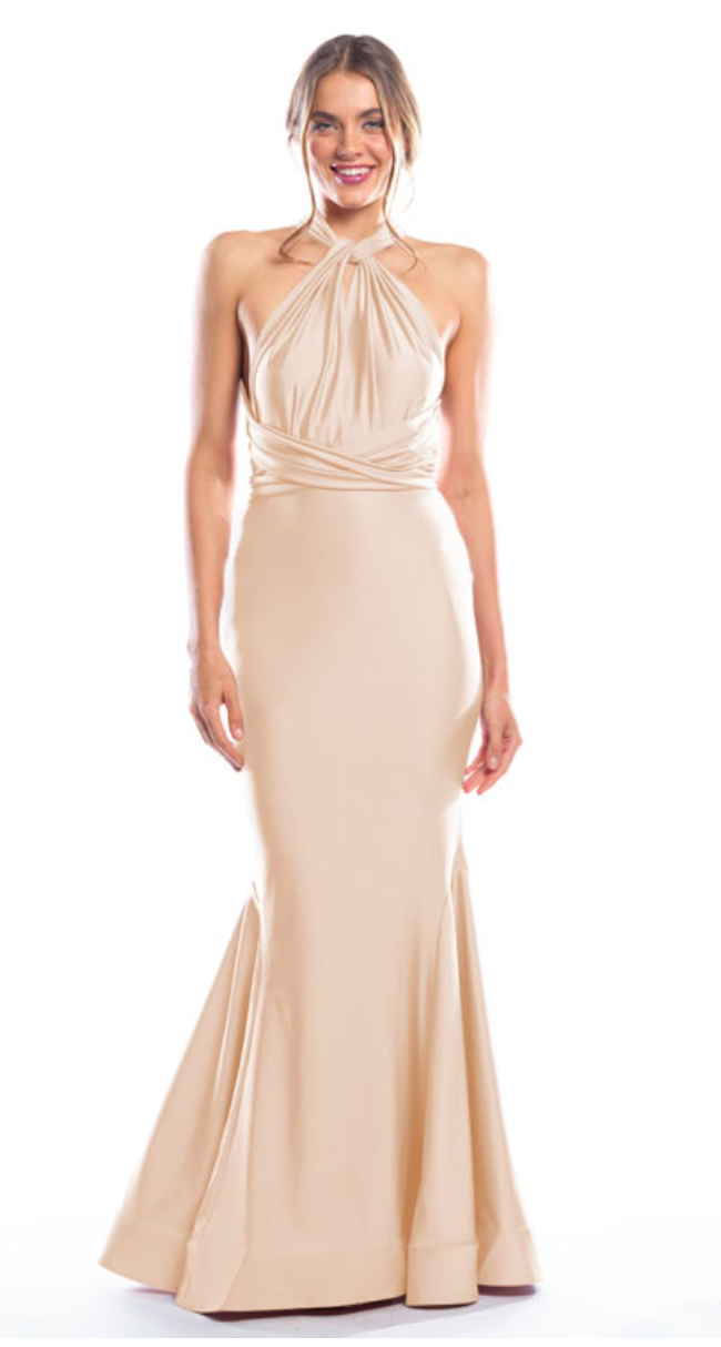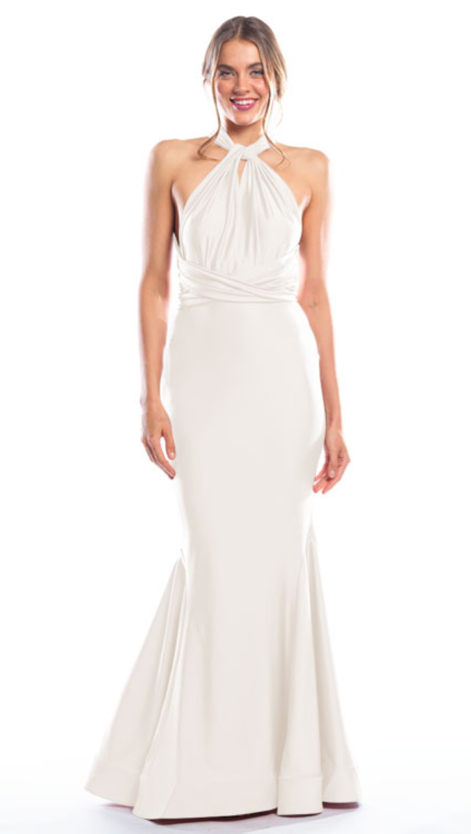 One dress, infinite styling possibilities! Mermaid skirt with horsehair hem and convertible front streamers for creating a variety of styles. Optional bandeau included.