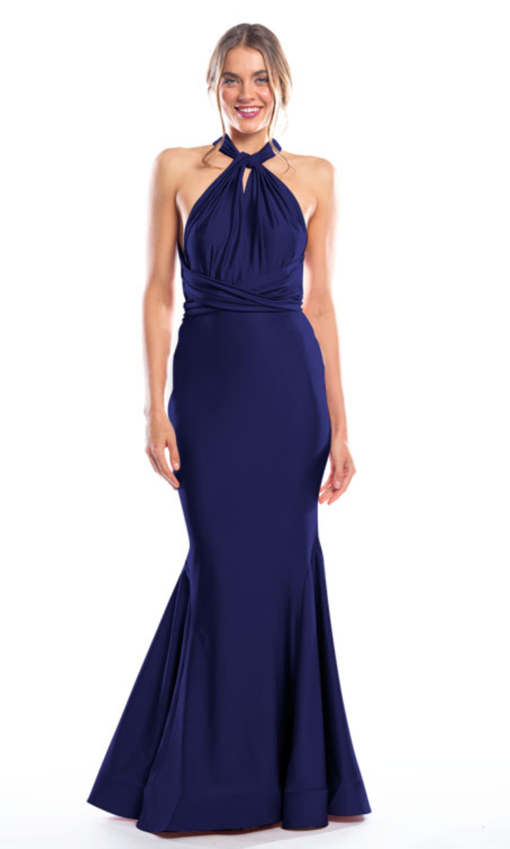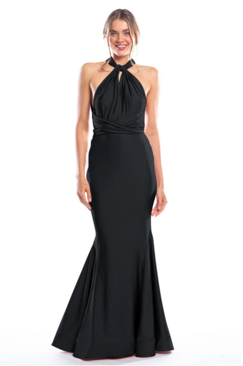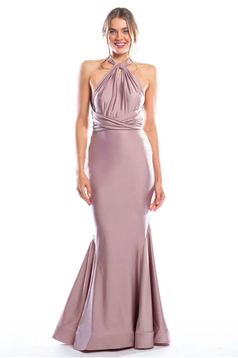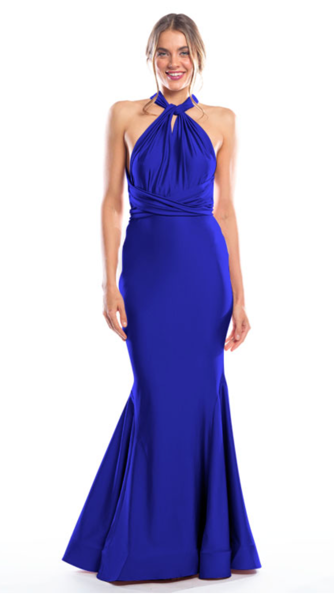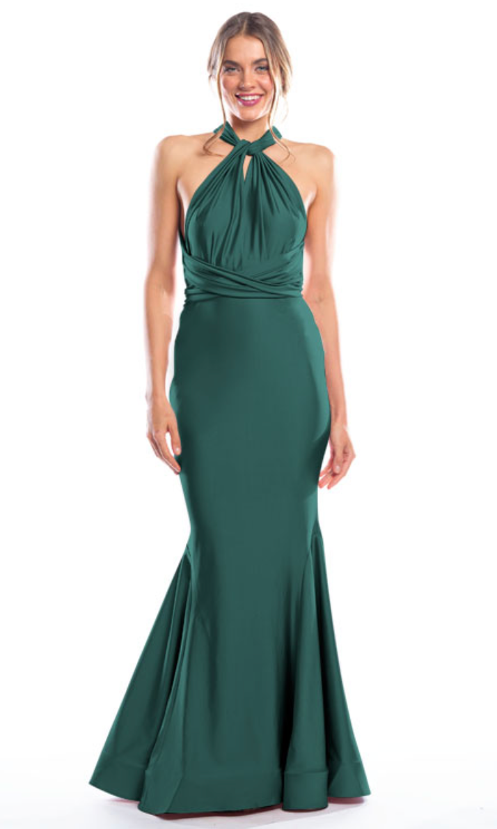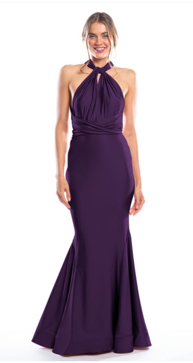 One dress, infinite styling possibilities! Mermaid skirt with horsehair hem and convertible front streamers for creating a variety of styles. Optional bandeau included.