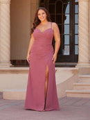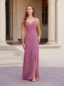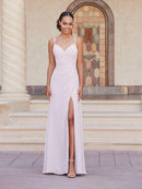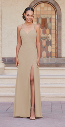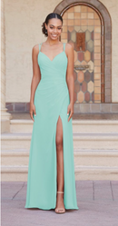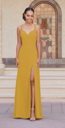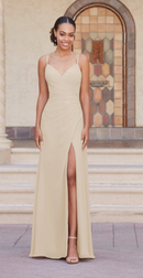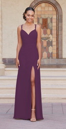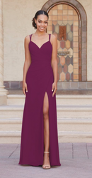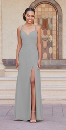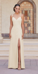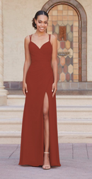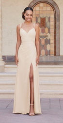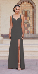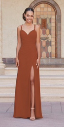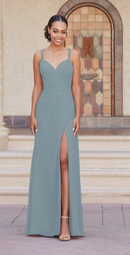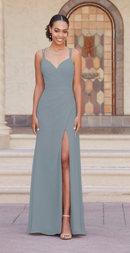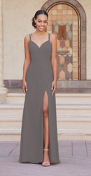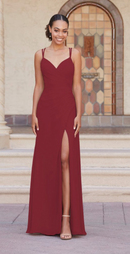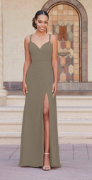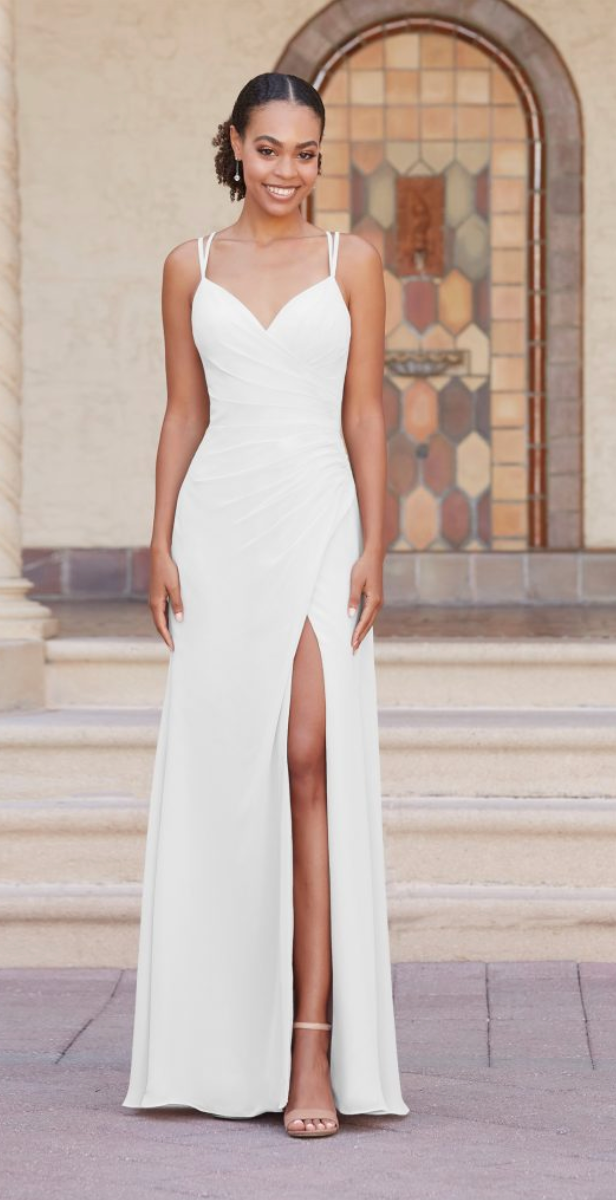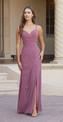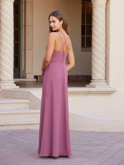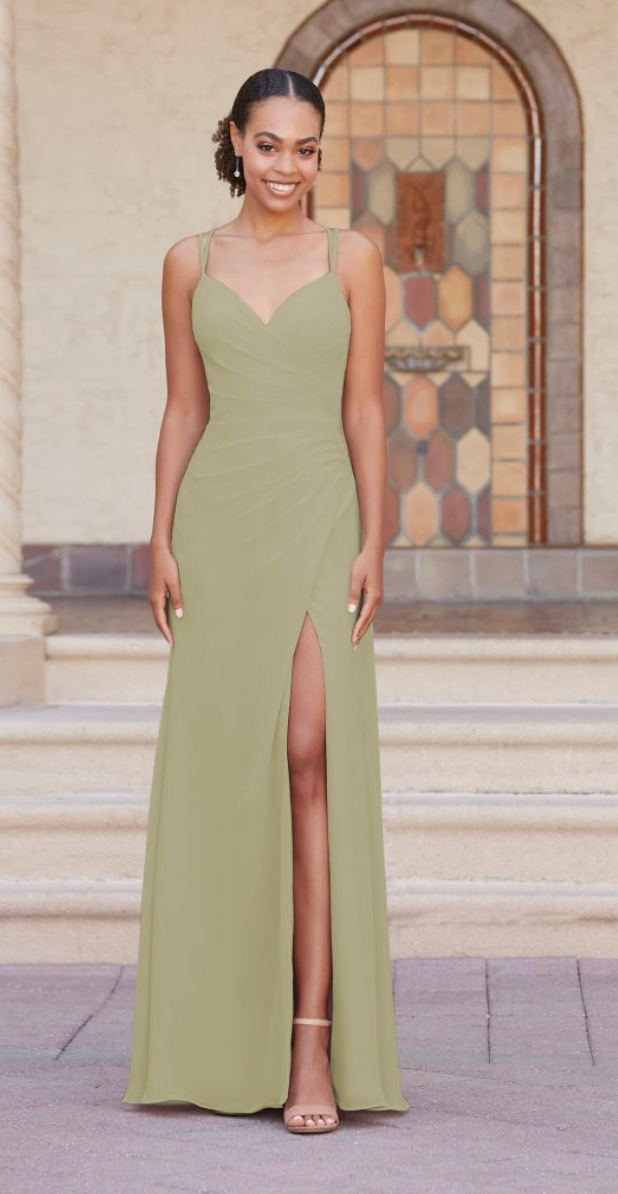 This chiffon bridesmaid dress features a sweetheart neckline, delicately ruched bodice, a criss cross strappy back detail and a slim A-line skirt with a daring slit. This dress exudes elegance with so many fun and modern details.