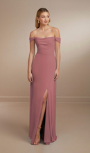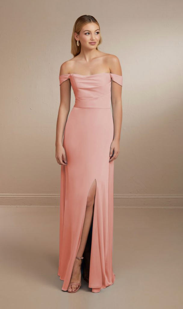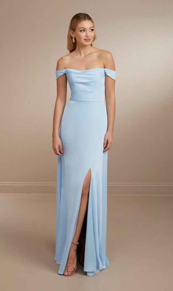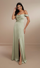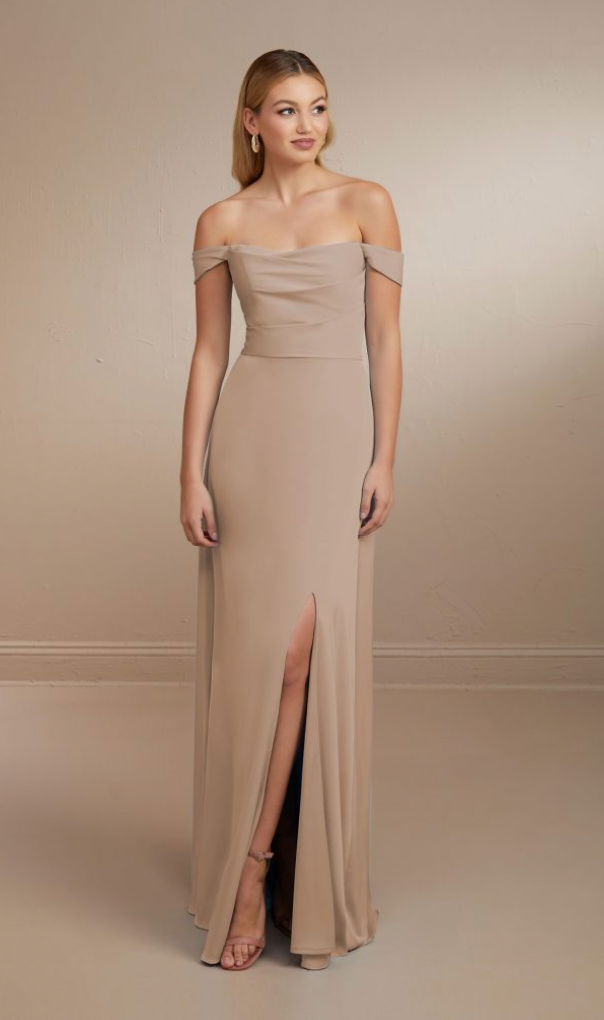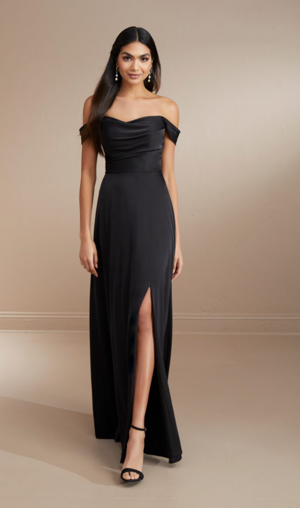In stretch matte charmeuse, this chic and polished gown features a draped off-the-shoulder neckline, a natural waist and a slim A-line skirt with an alluring slit.