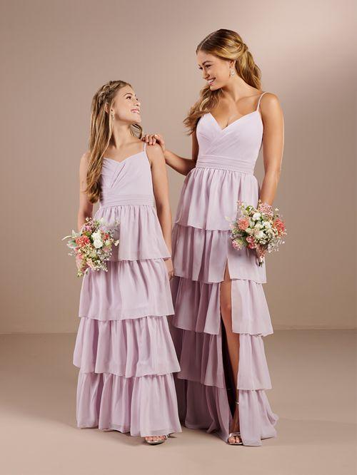 This whimsical bridesmaid dress features a mock wrap style bodice with soft ruching, spaghetti straps and a cummerbund waistline. The romantic ruffles tiered chiffon skirt with from walking side slit will be sure to bring lasting memories to any occasion.