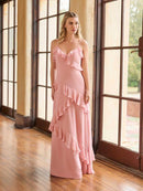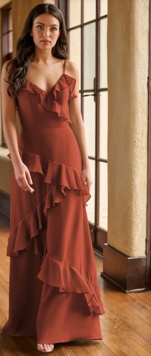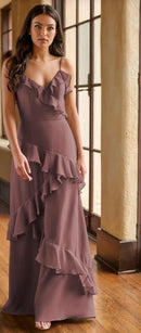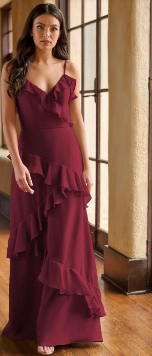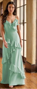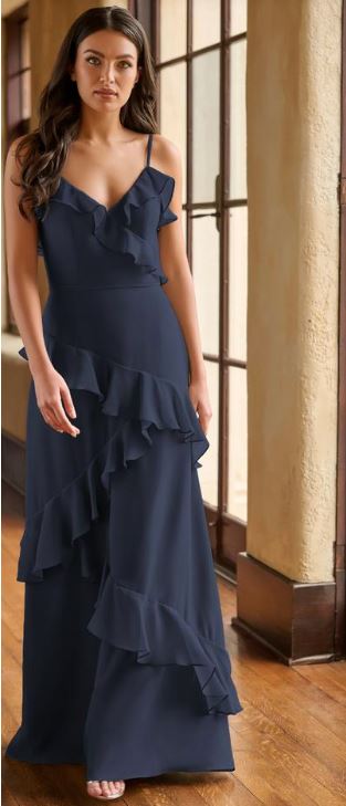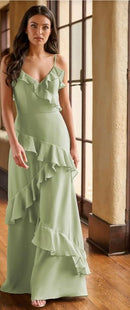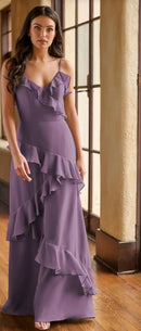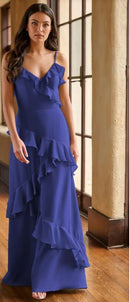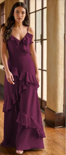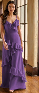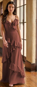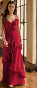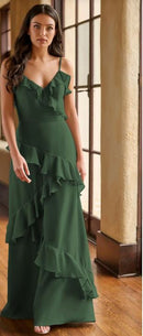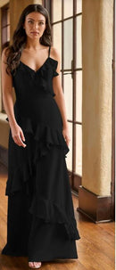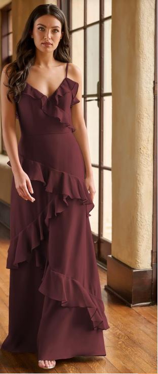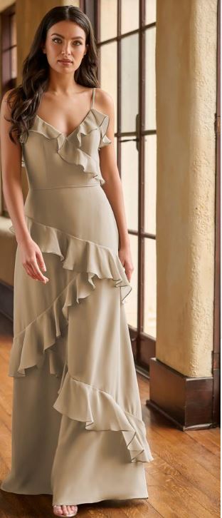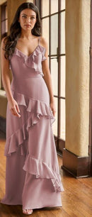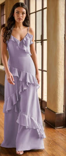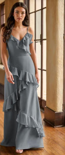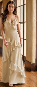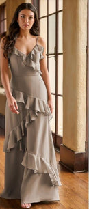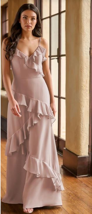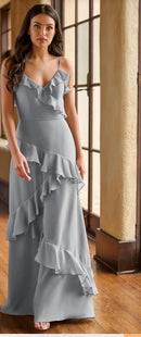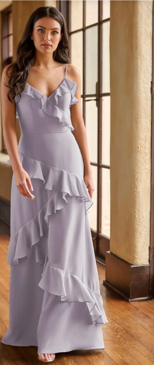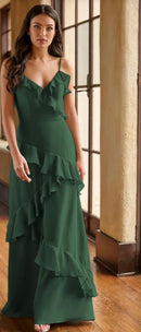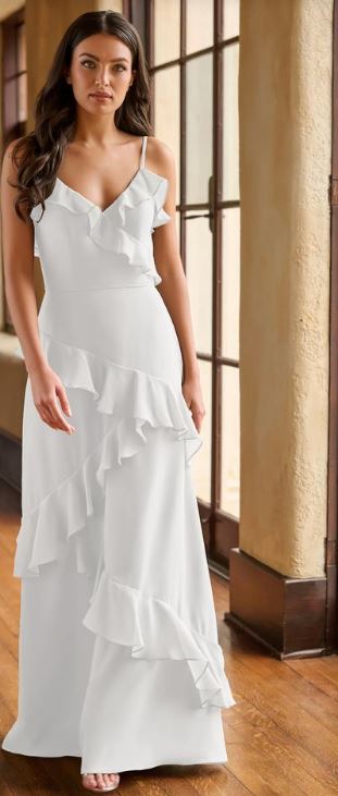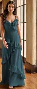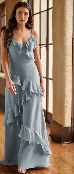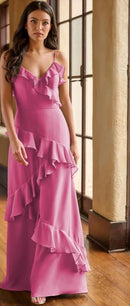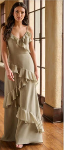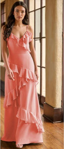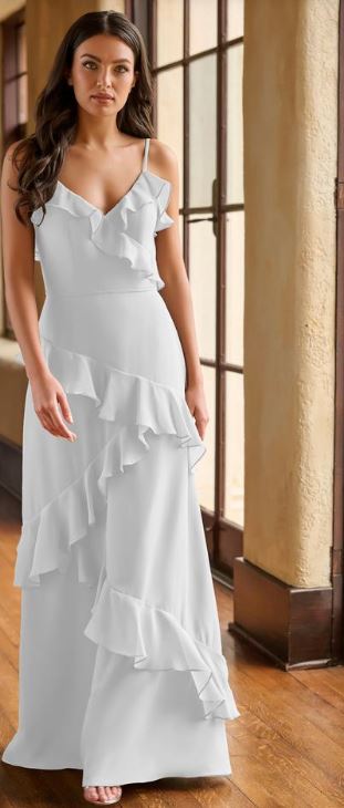 V-neck spaghetti strap chiffon A-line with asymmetrical ruffles on bodice and skirt.