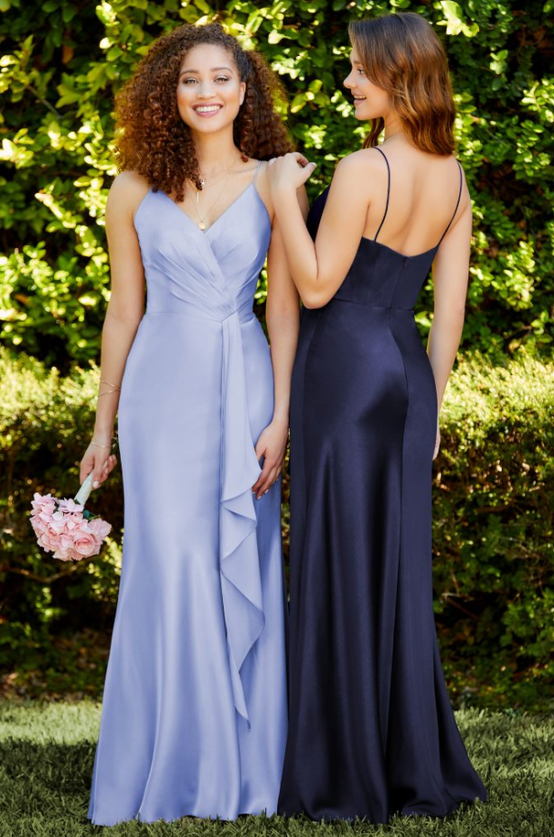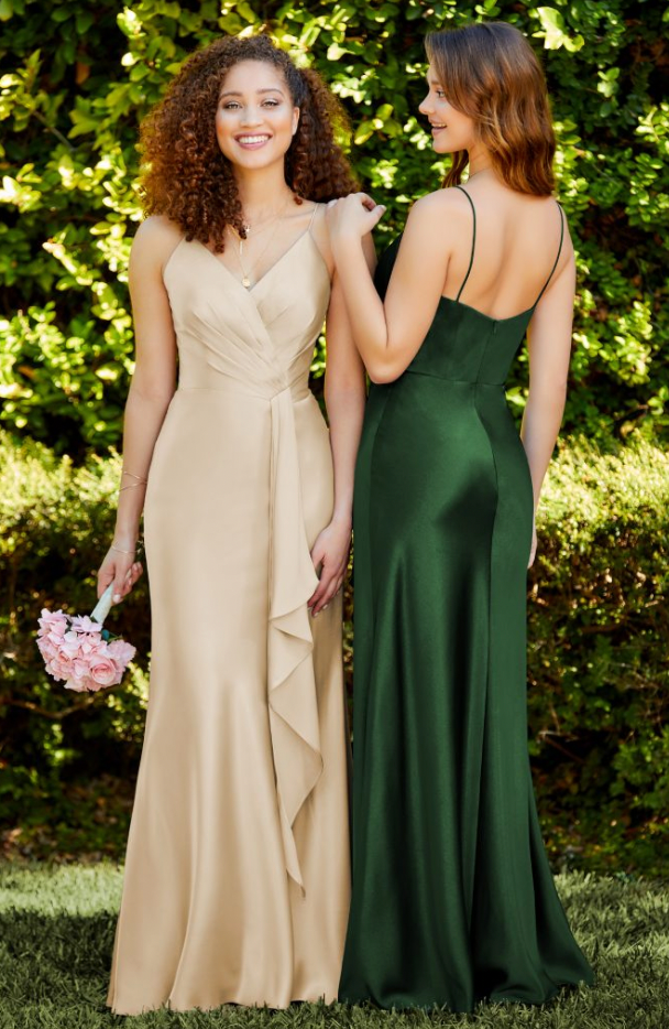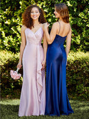 This stunner in slipper satin has a ruched v cross over neckline with thin straps. A slim ruffled flounce down the front accents the sheath skirt.