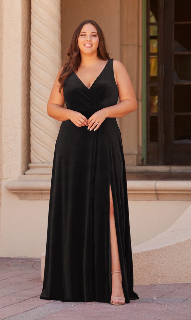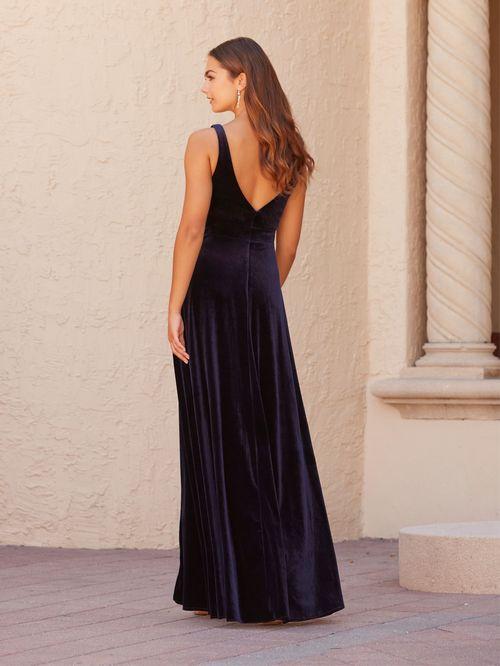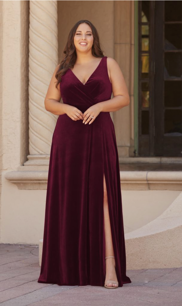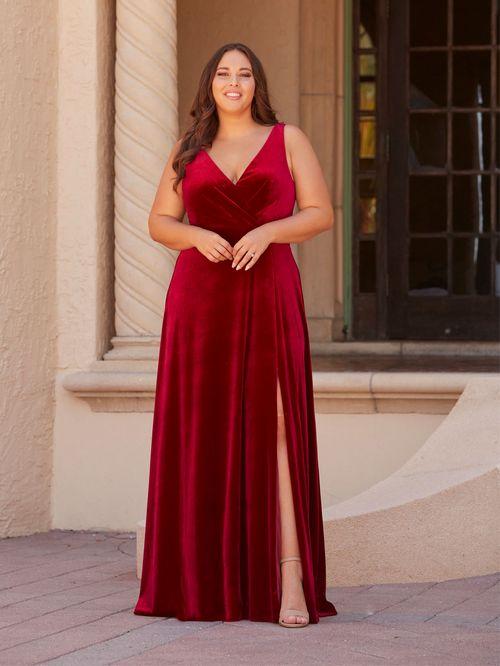 Envision the evening in this stunning V-neckline silhouette with a wrap front bodice and A-line highlighted by a front slit. Pictured In: Mahogany, Navy.