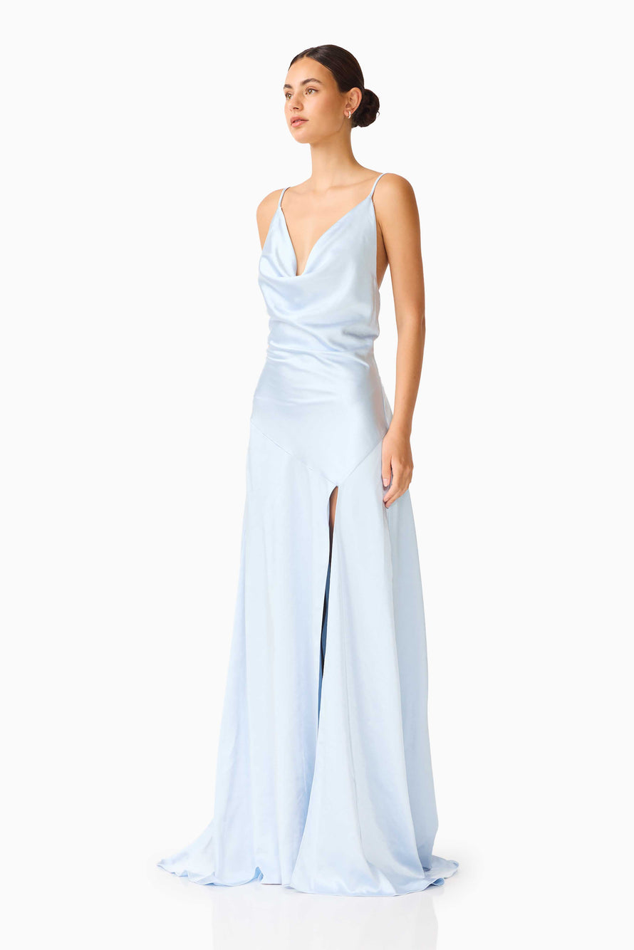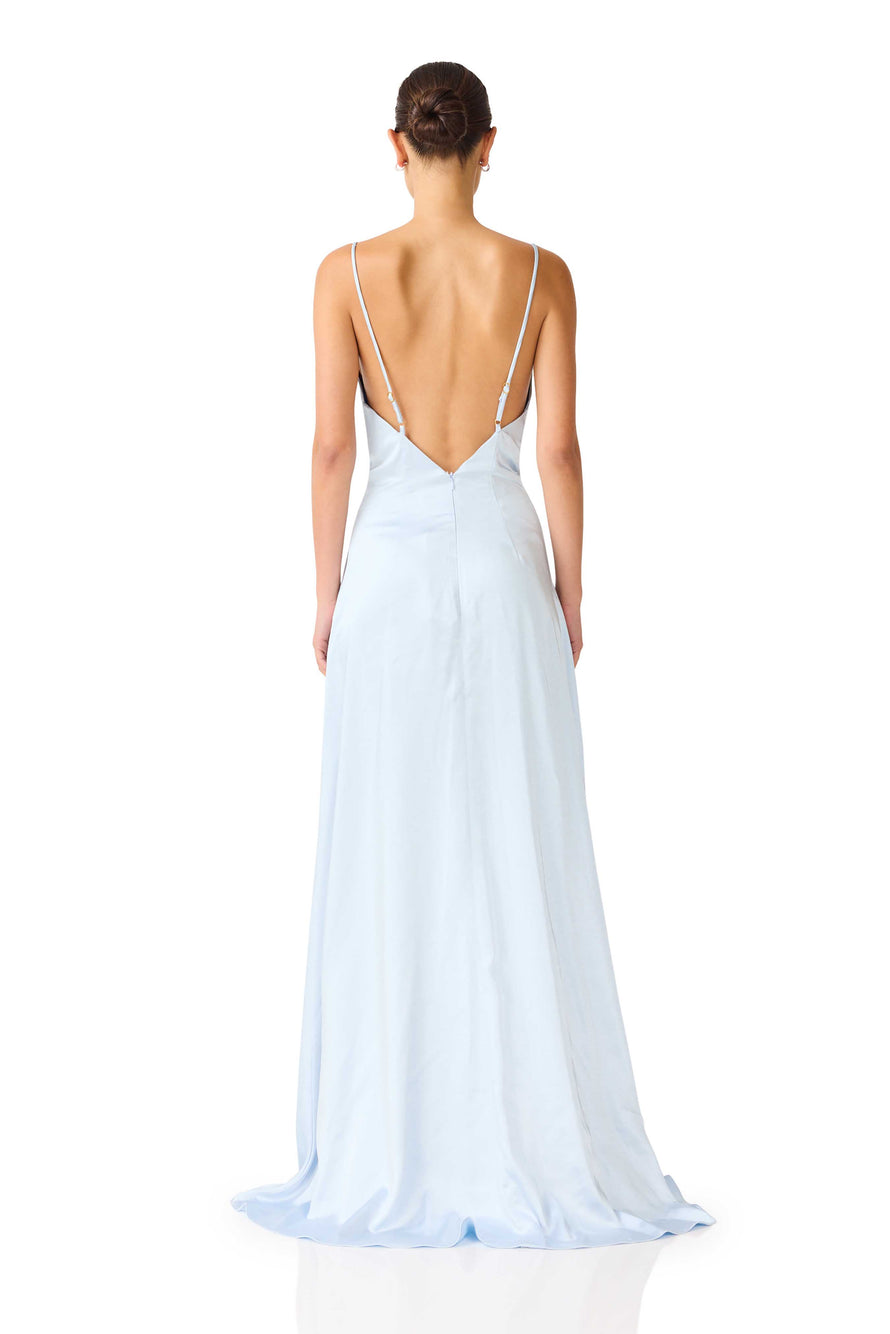 Make your next invitation unforgettable with this captivating satin maxi in a serene Pale Blue. Designed with a modern edge, it features a low cowl neck and a statement-making open back with versatile detachable straps. The silhouette is expertly cut to hug the waist and hips before opening into a graceful flared hem, punctuated by a high-climb leg split for effortless movement. In this icy, luminous hue, the dress offers a flawless fit and an ethereal aesthetic that transitions beautifully from a sun-drenched afternoon ceremony to a moonlit evening reception.