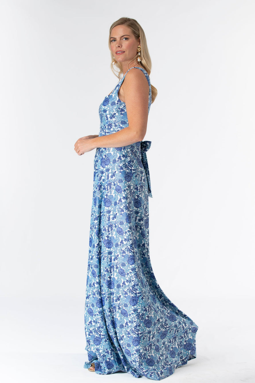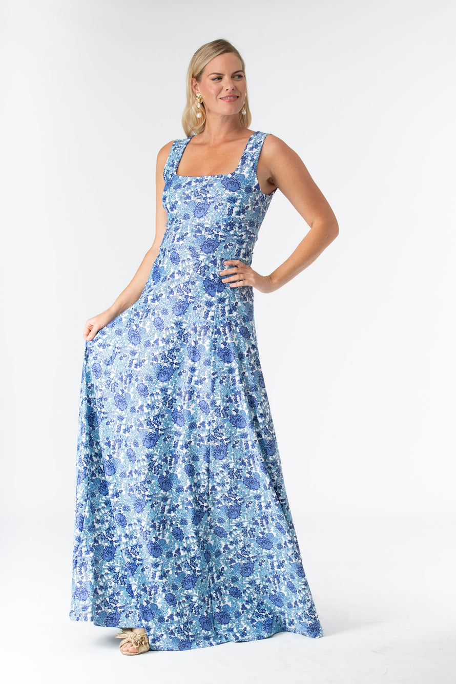 The effortless Cosette dress features a soft square neckline, a figure trimming waistband, and a sweeping floor-length skirt.