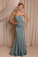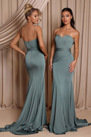 The Lucia Gown is made from stretch satin and features a strapless sweetheart neckline with a fitted bodice. The waist is accentuated with soft gathered detailing that drapes elegantly to one side, flowing into a floor-length skirt with a subtle train. A timeless and flattering style for modern bridesmaids.