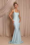 The Rose Gown is a sleek stretch-satin design featuring a flattering square neckline, wide straps, and a fitted silhouette that flows into a soft, dramatic skirt. A thigh-high split adds an elegant touch, while the back showcases criss-cross straps and a statement bow for a feminine finish. Perfect for modern bridal parties looking for a refined, streamlined look.