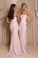 The Skylar Gown is made from stretch jersey and features a structured strapless bodice with seam detailing for a flattering shape. The fitted silhouette flows smoothly into a flared hem with a soft train, creating an elegant and timeless look ideal for bridesmaids or formal occasions.