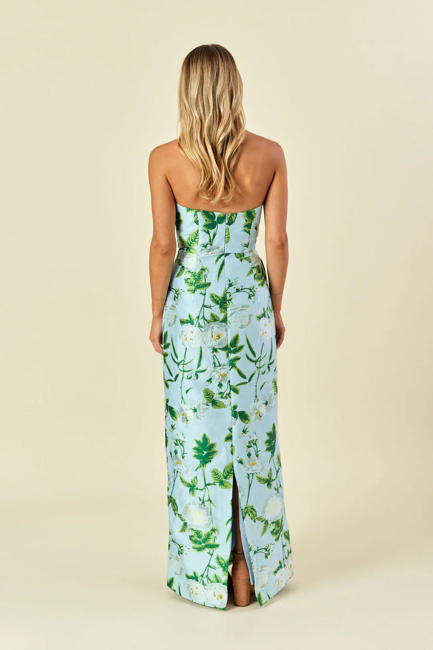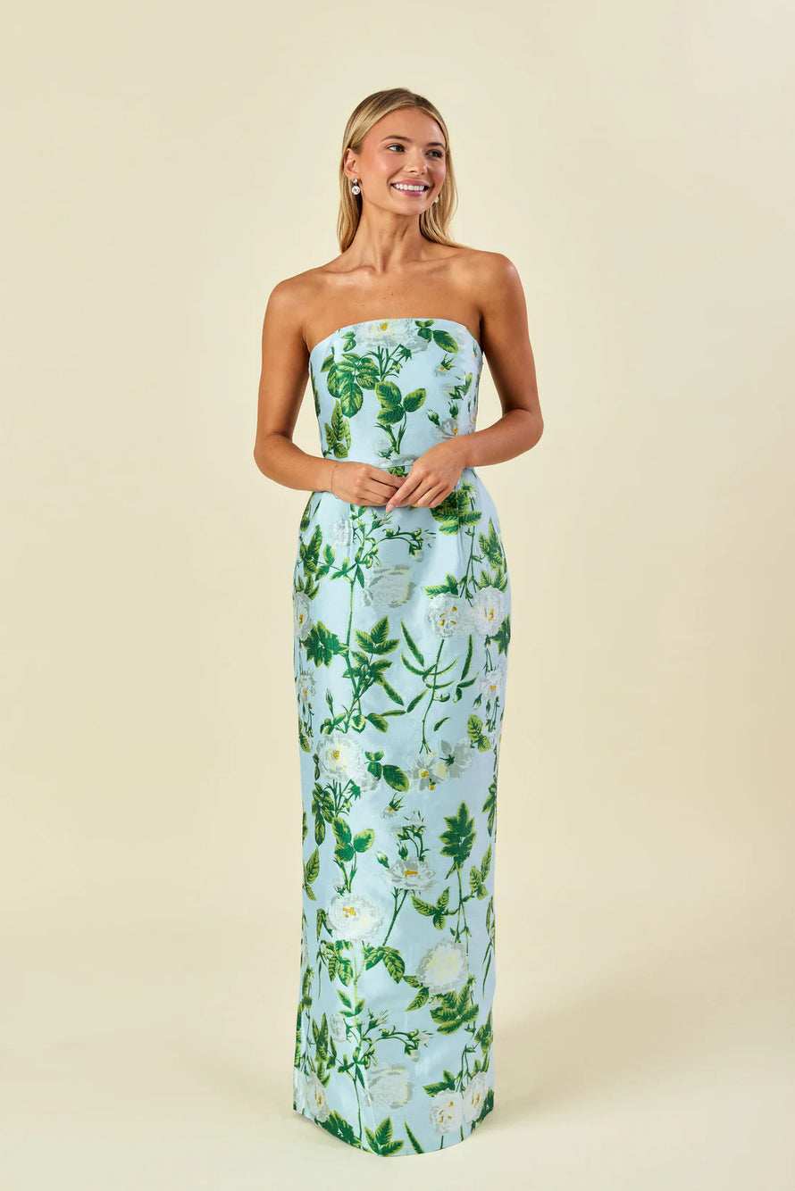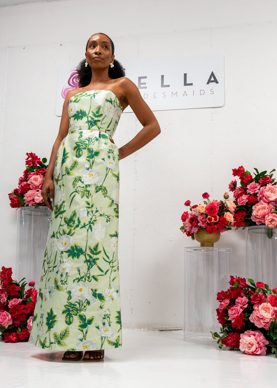 Strapless column dress with pockets at waist.