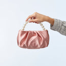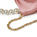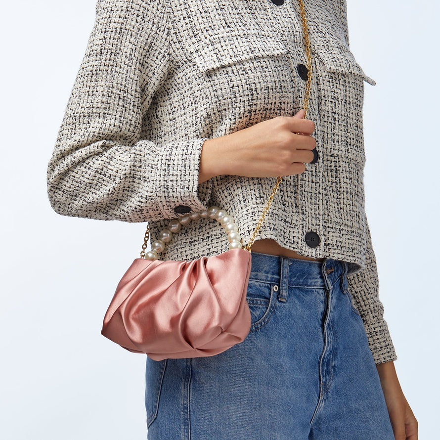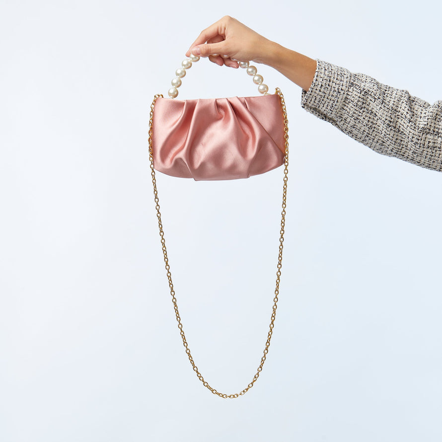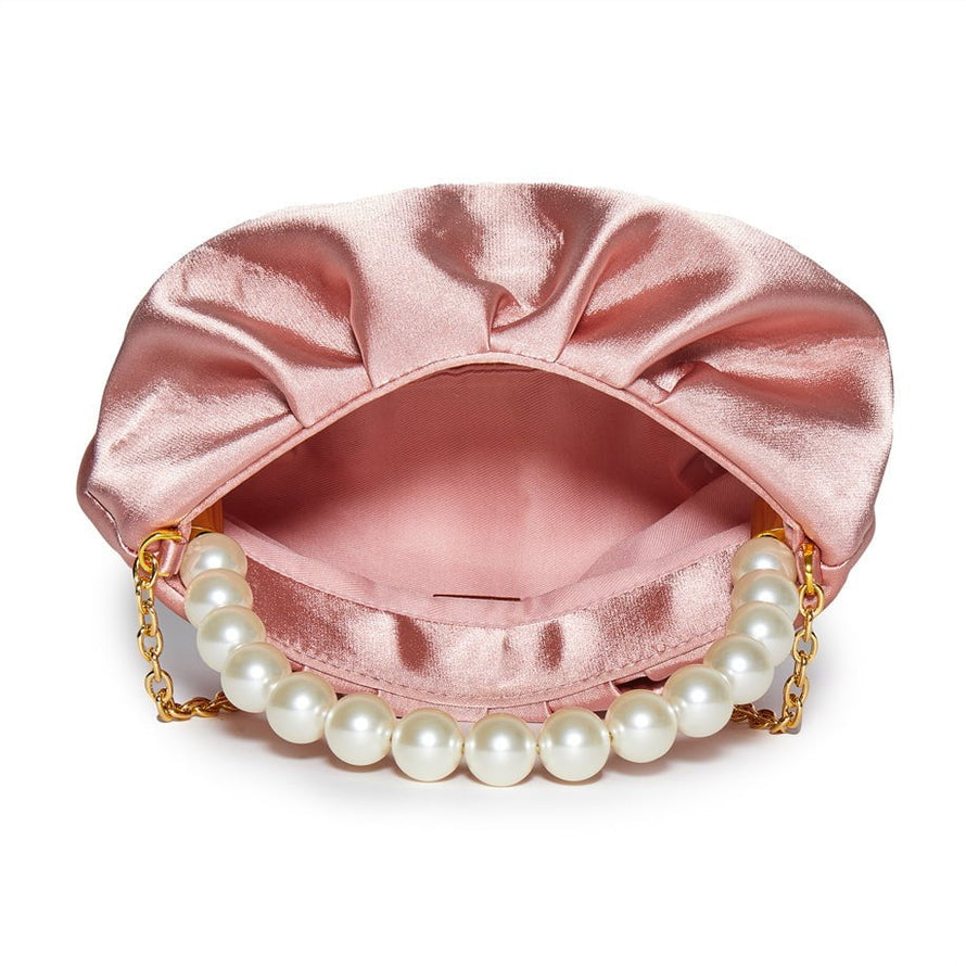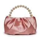 Presenting our latest addition, the Marlowe Satin Evening Bag, designed to enhance your evening ensemble. Crafted from luxurious materials and showcasing the enchanting hues of our winter collection, this pouch is constructed from dusty rose ruched poly blend satin, adorned with a faux pearl top handle, secured with a magnetic closure and equipped with a hidden 14k gold plated chain shoulder strap measuring 45". Spacious enough to comfortably hold your wallet, all iPhone models, and other essentials.