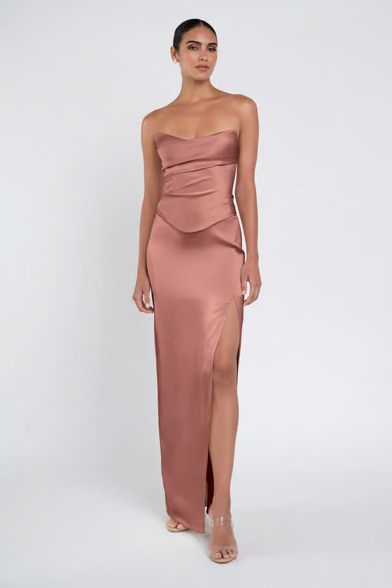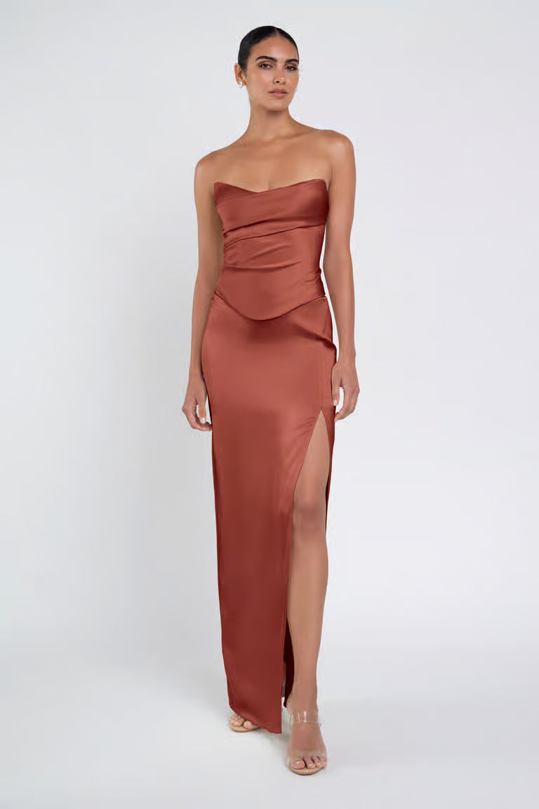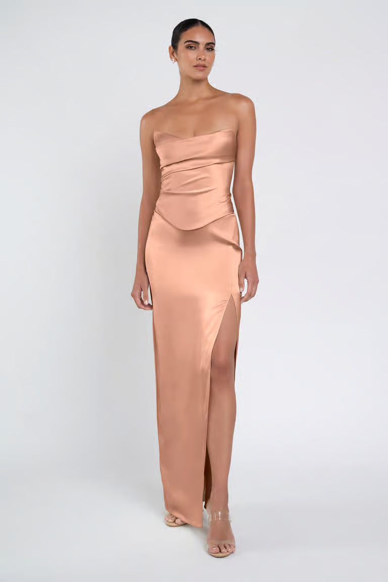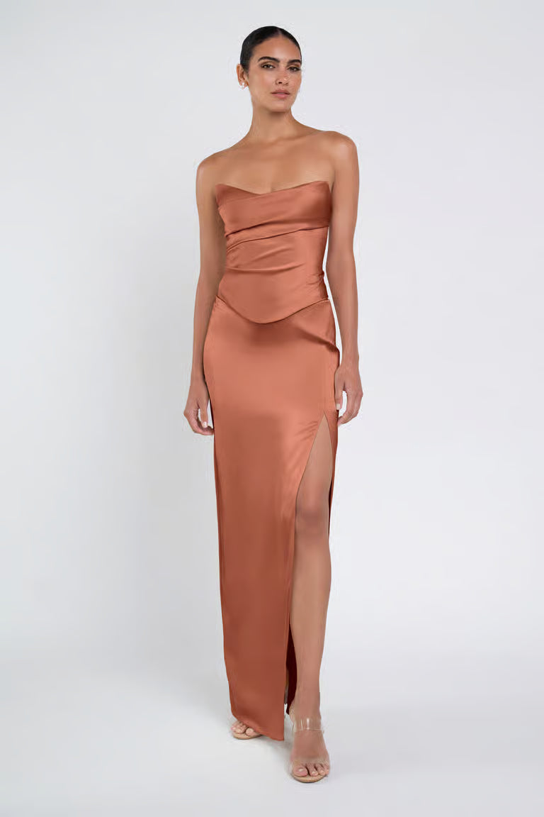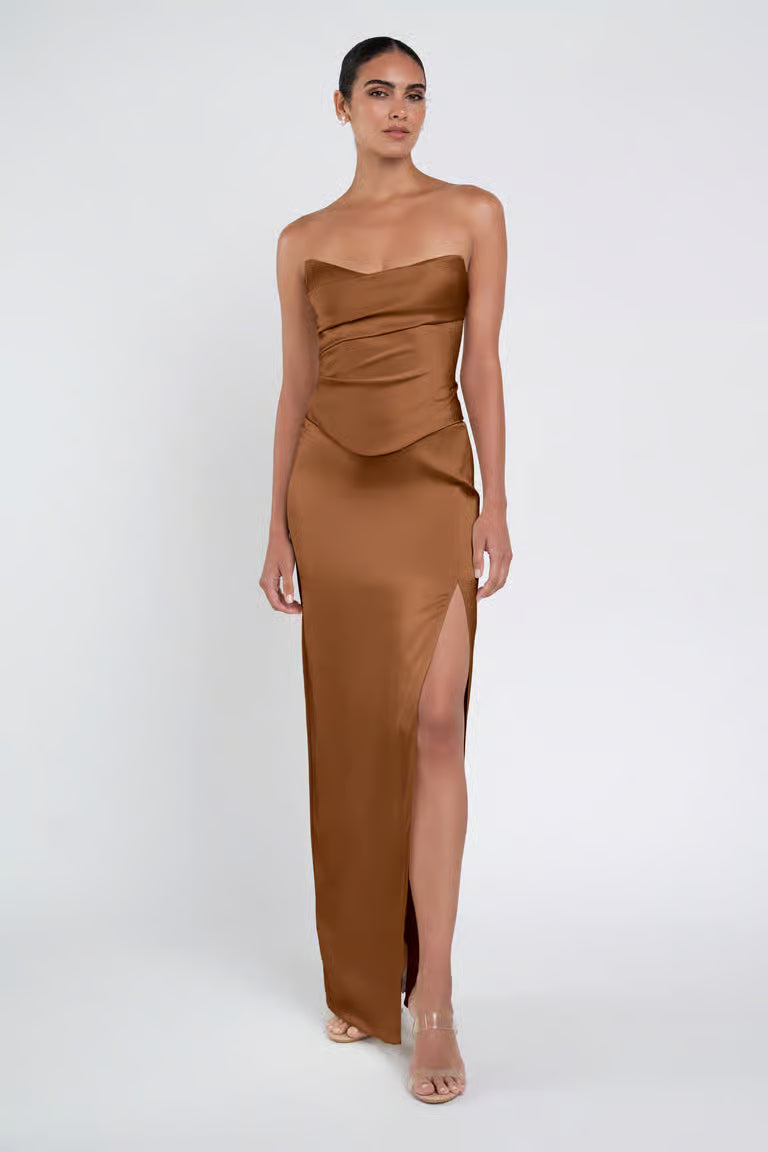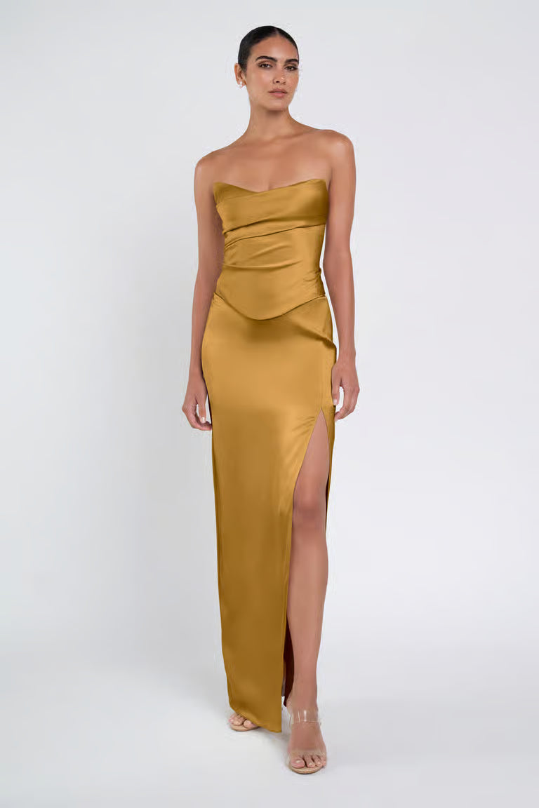 The luxe satin Amaya dress give the illusion of a separate corset bodice and slim skirt with a sultry side slit.