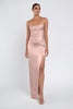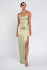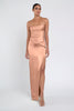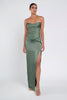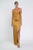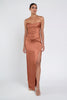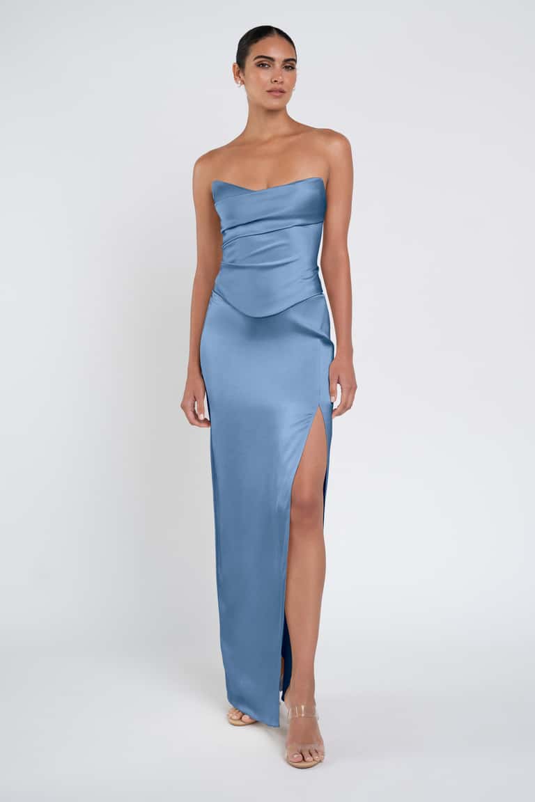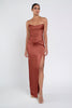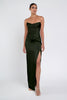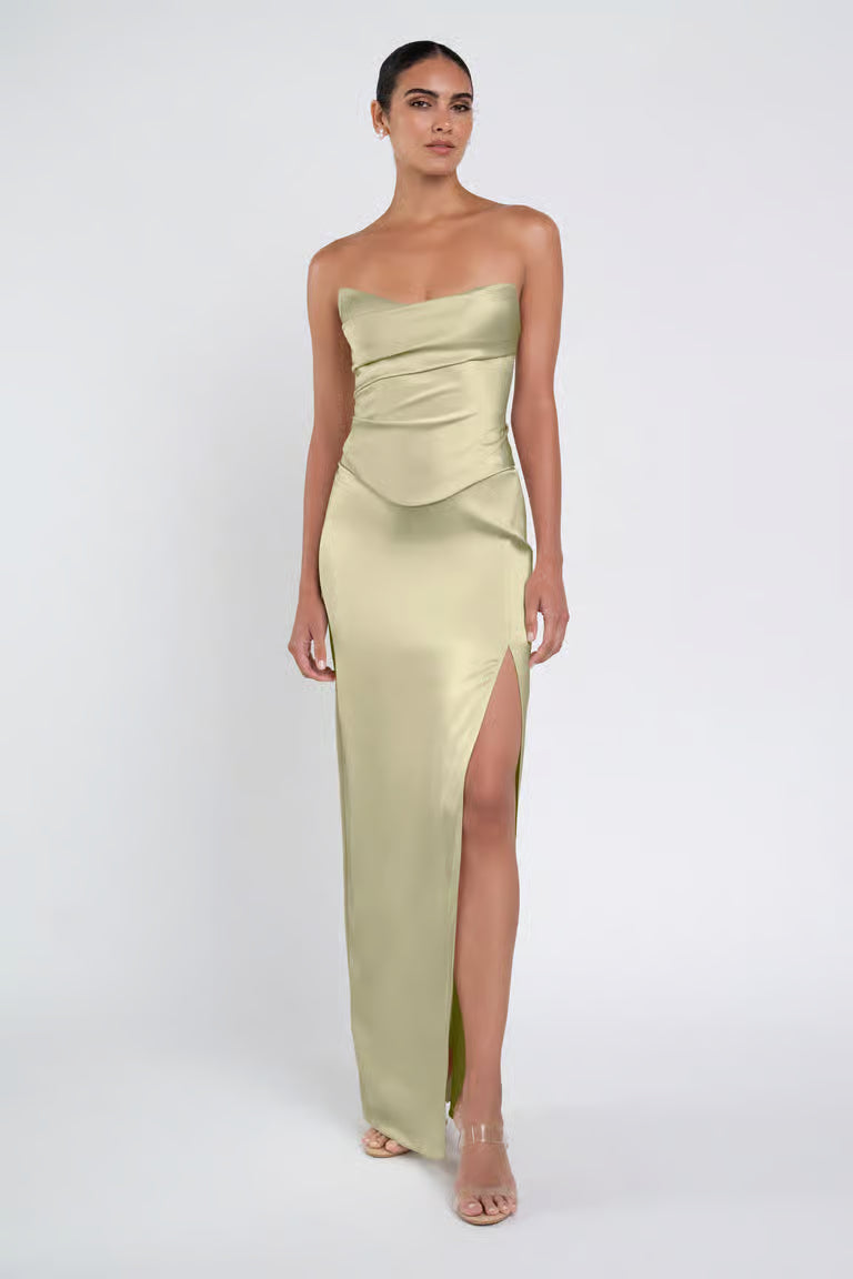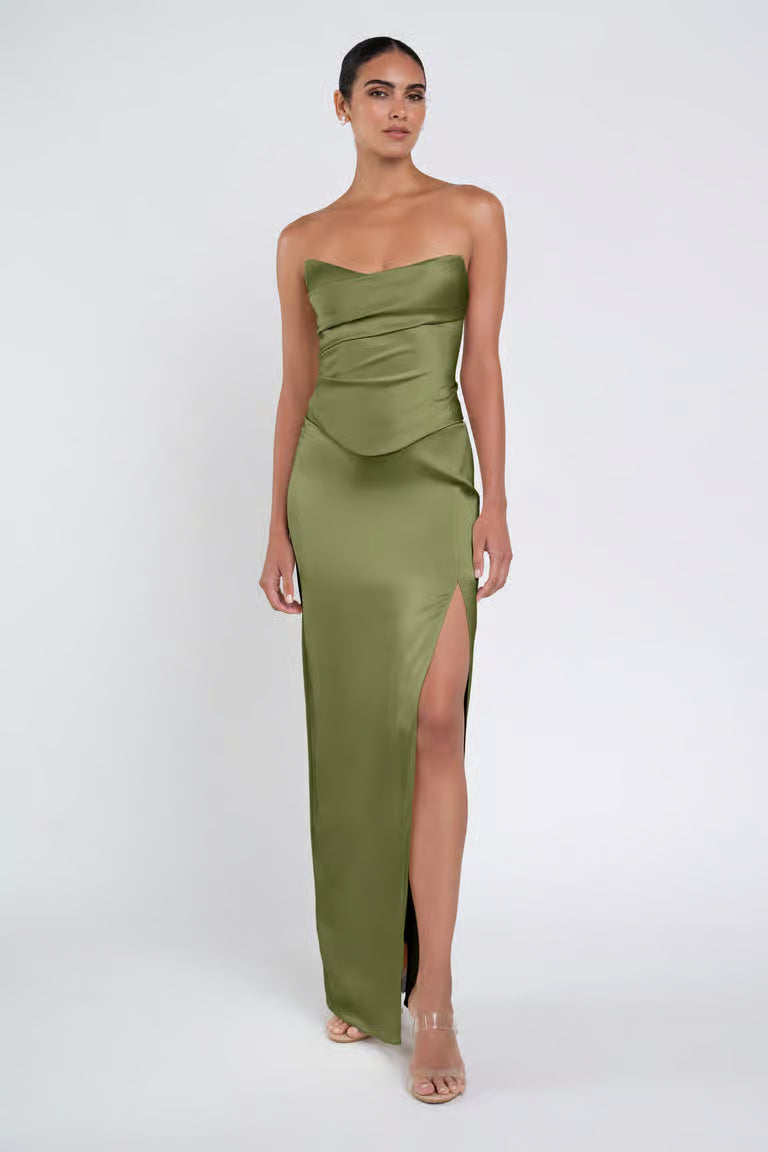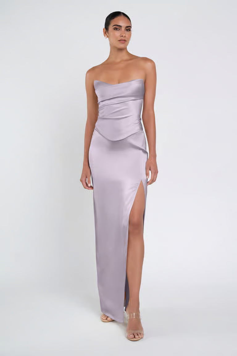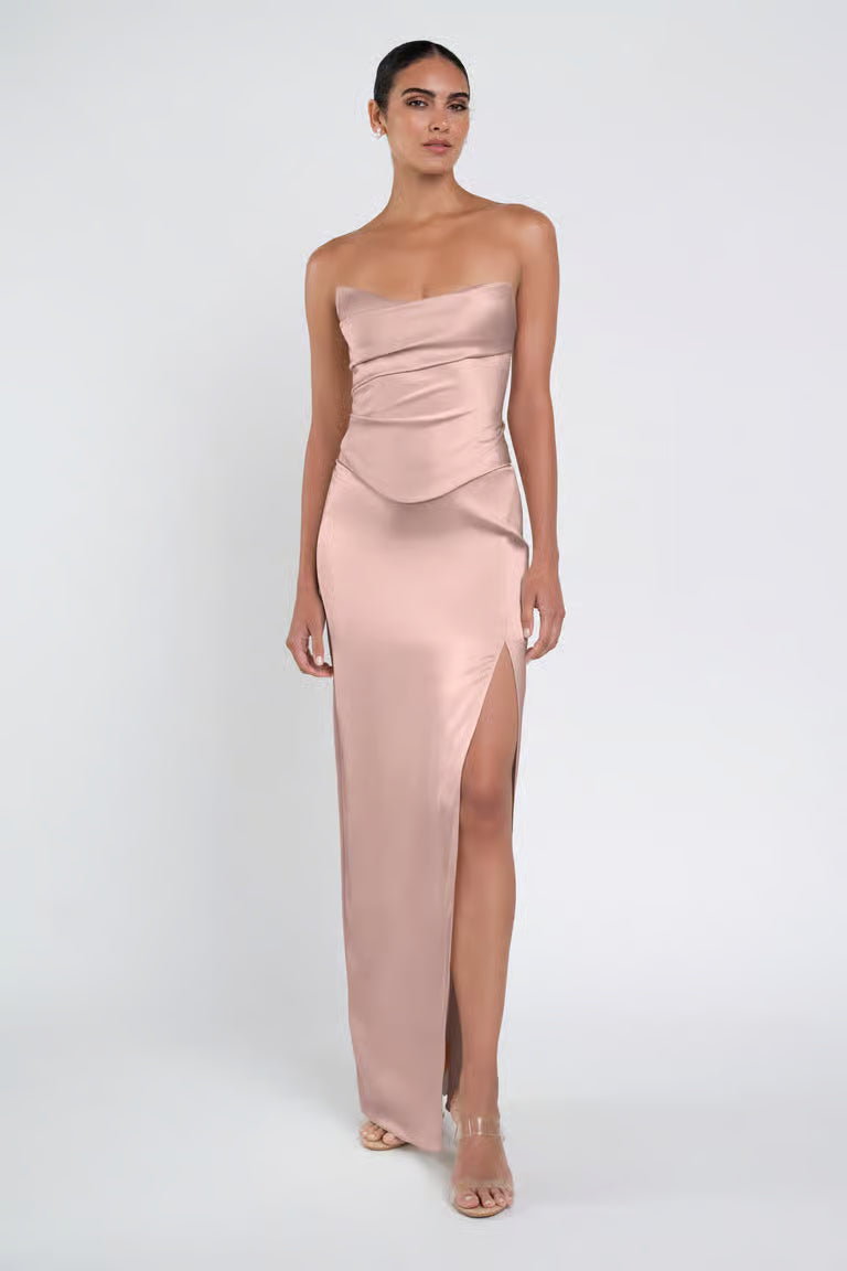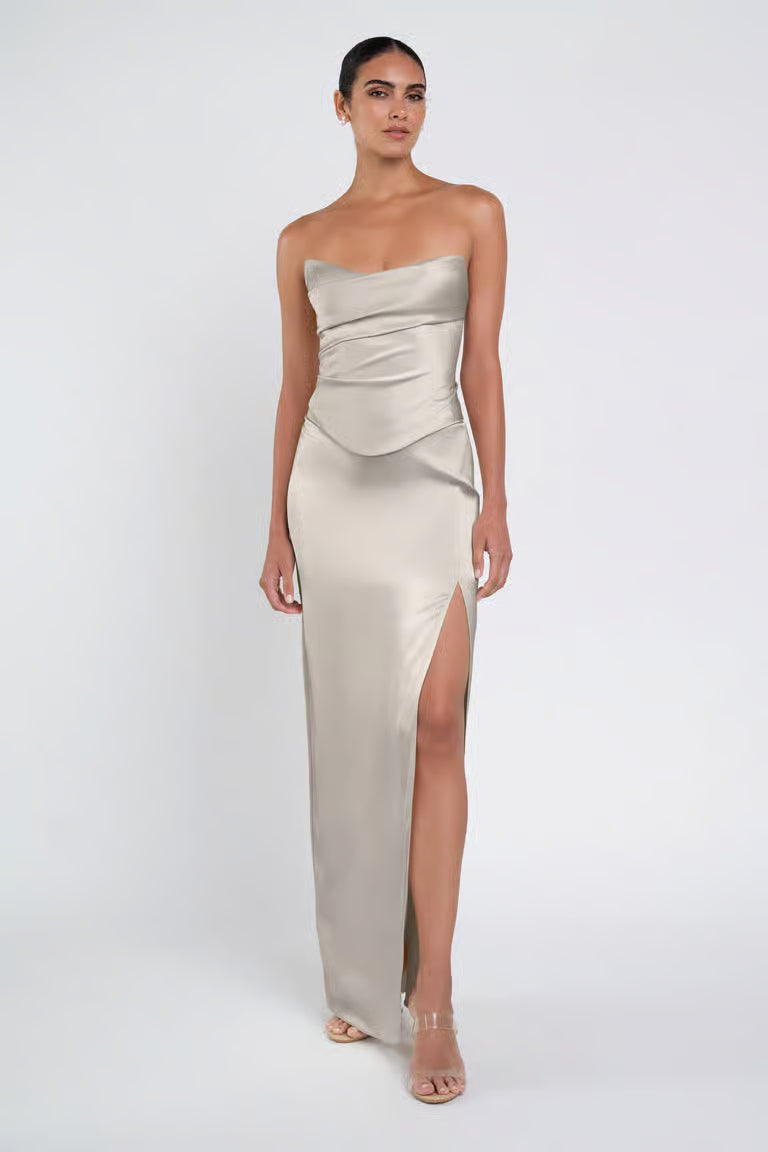 The luxe satin Amaya dress give the illusion of a separate corset bodice and slim skirt with a sultry side slit.