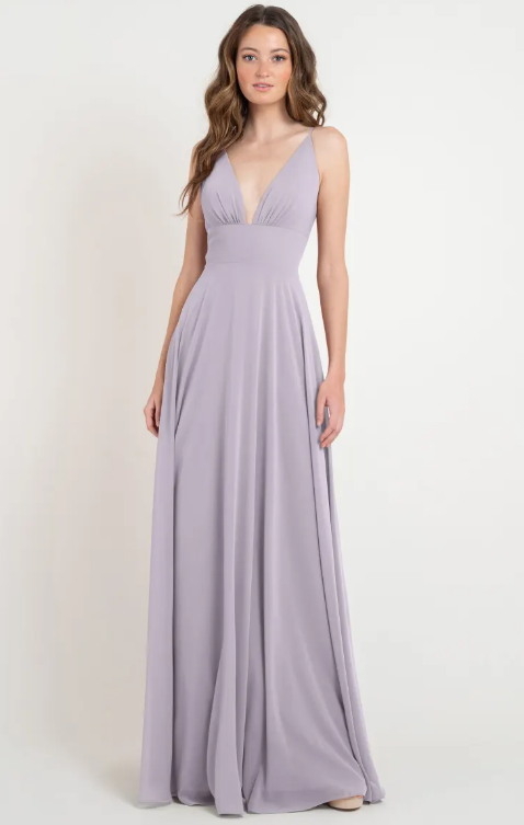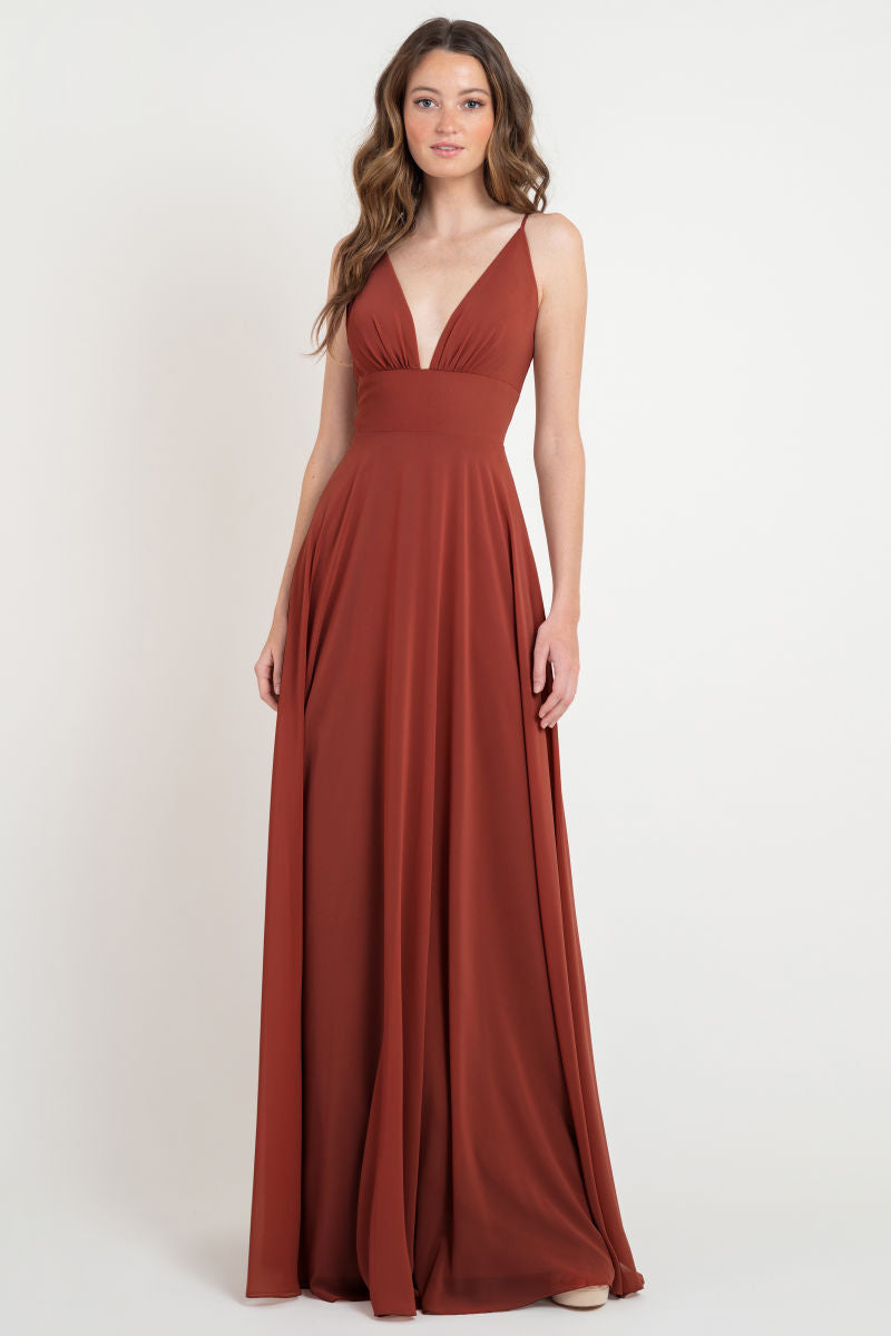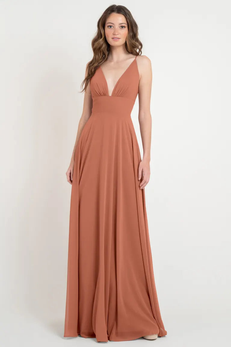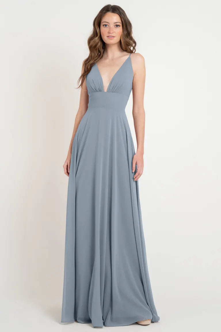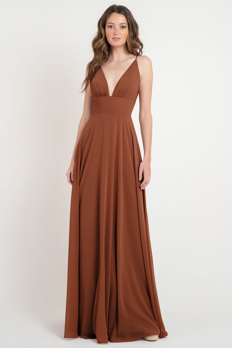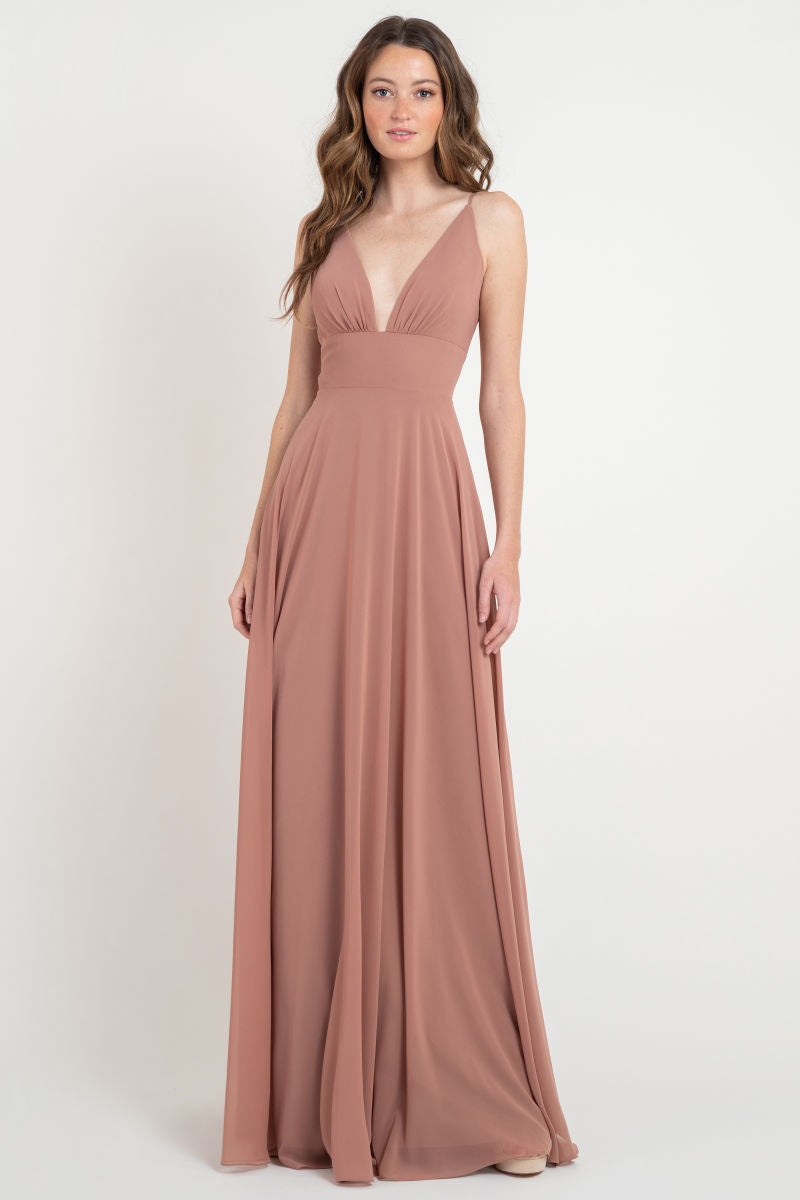 If you're aiming for sheer beauty, the Brady dress is the ideal choice, featuring a breathtaking V-neck and a flowing A-line chiffon skirt. The Brady is both simple and chic!