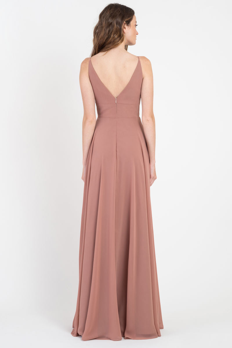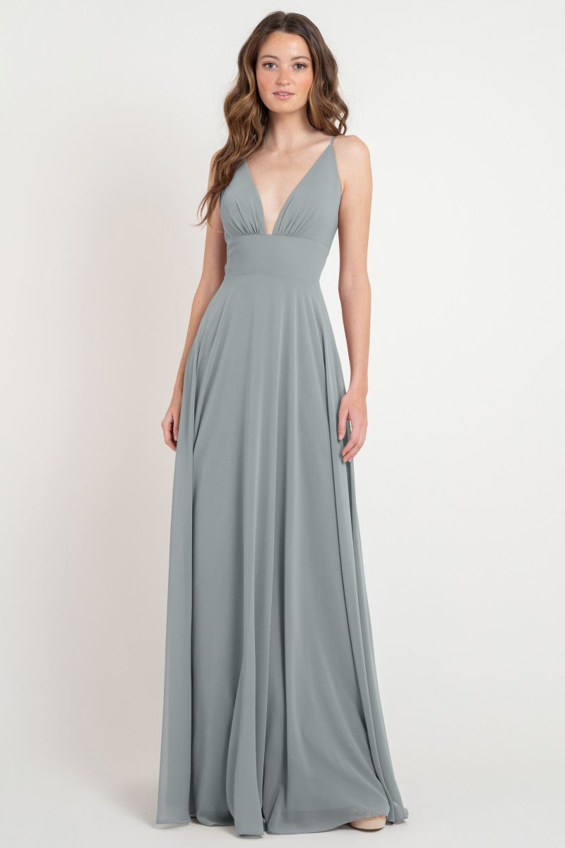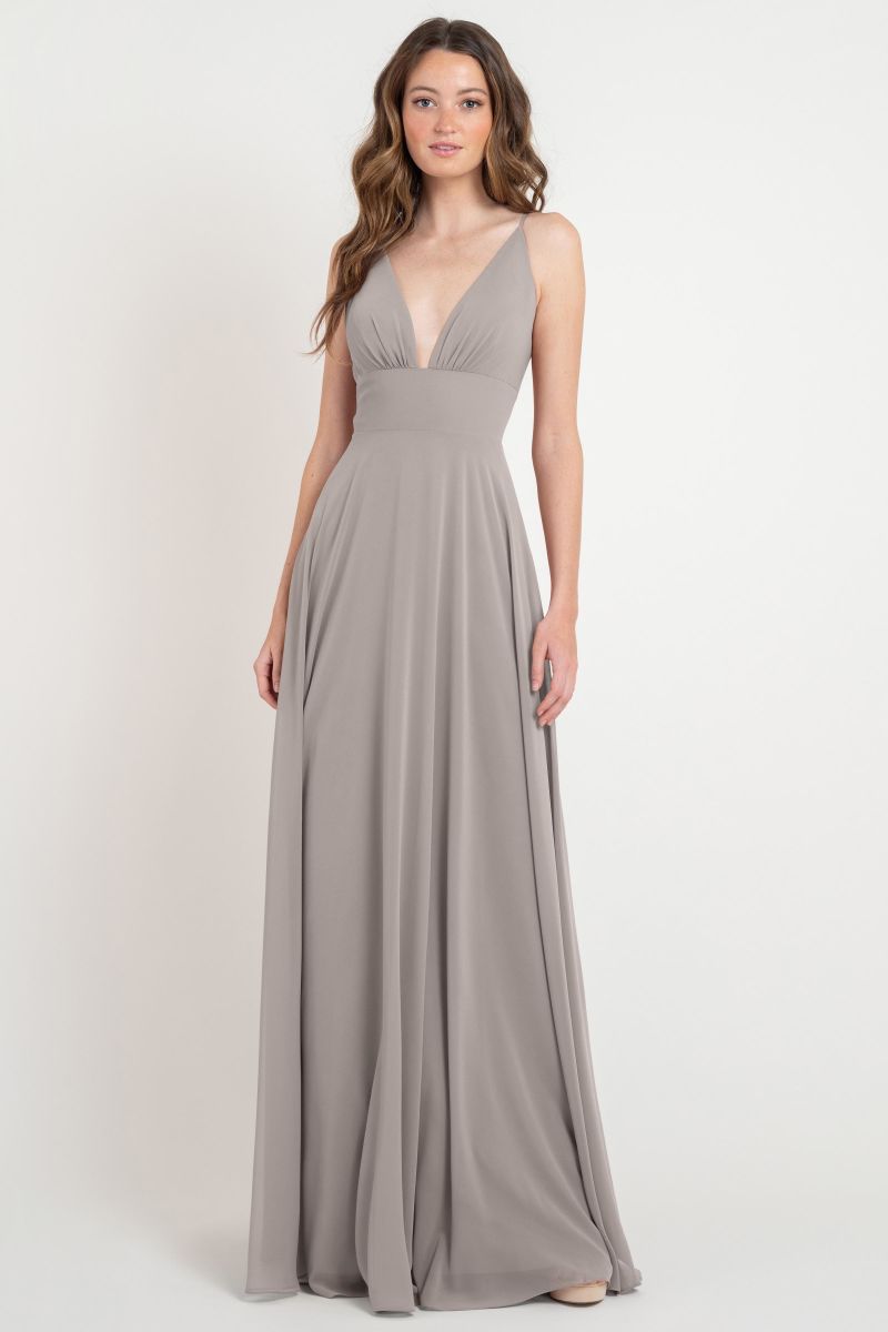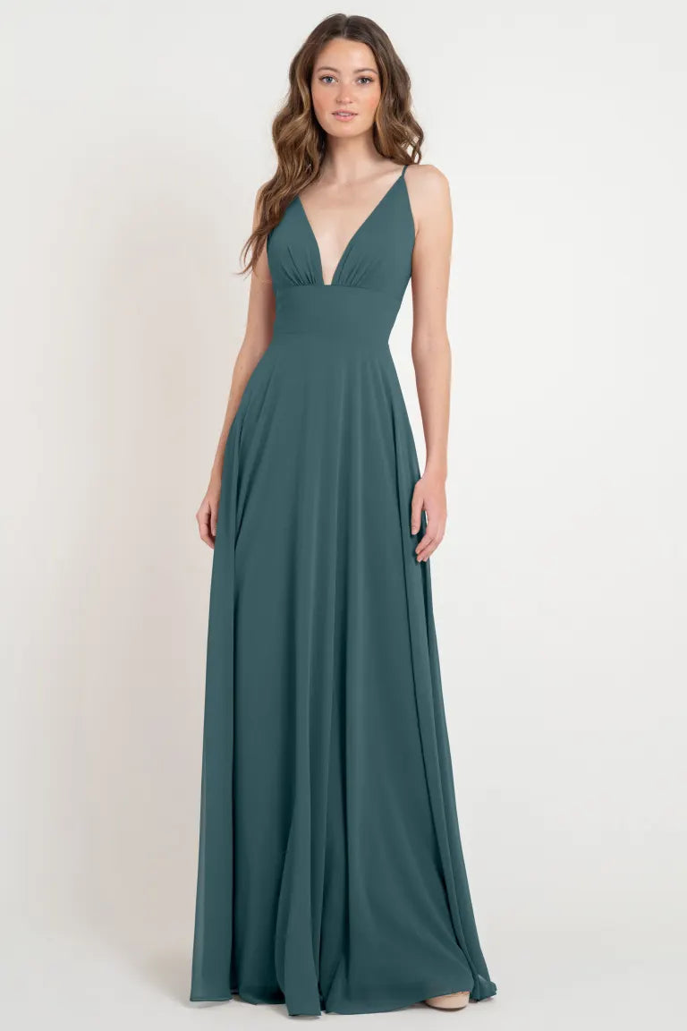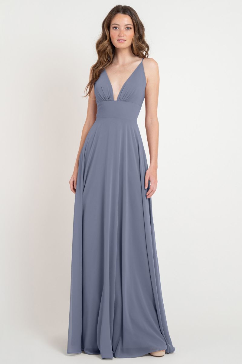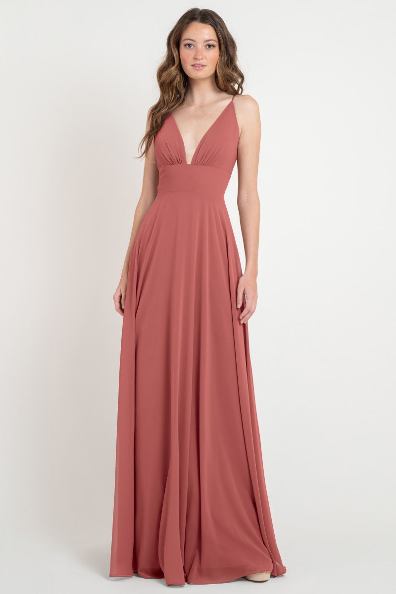 If you're aiming for sheer beauty, the Brady dress is the ideal choice, featuring a breathtaking V-neck and a flowing A-line chiffon skirt. The Brady is both simple and chic!