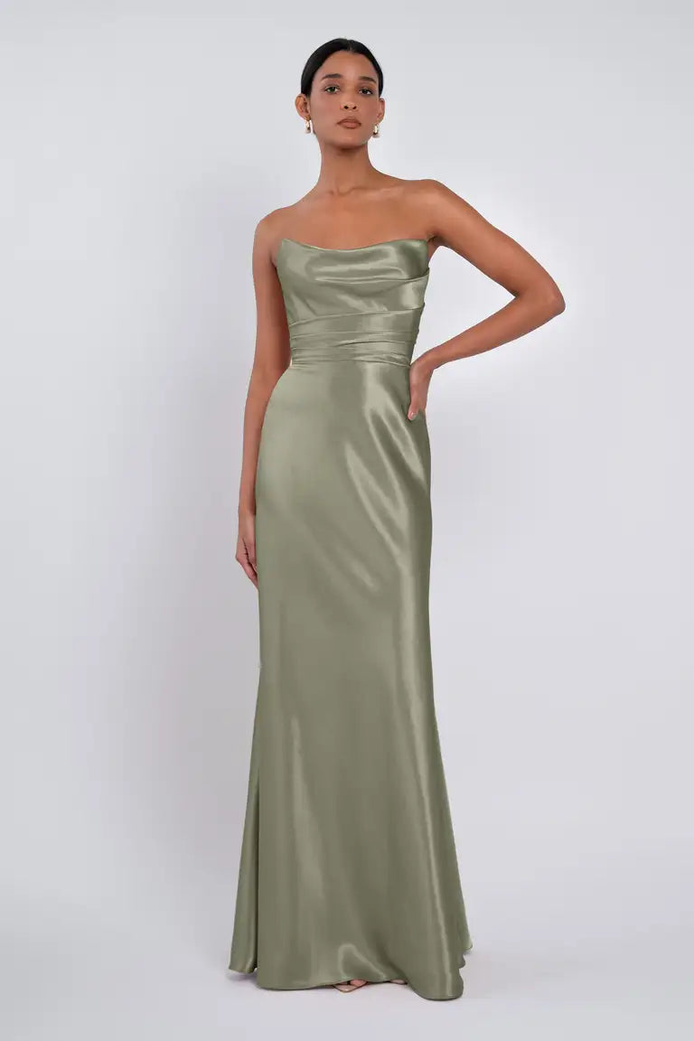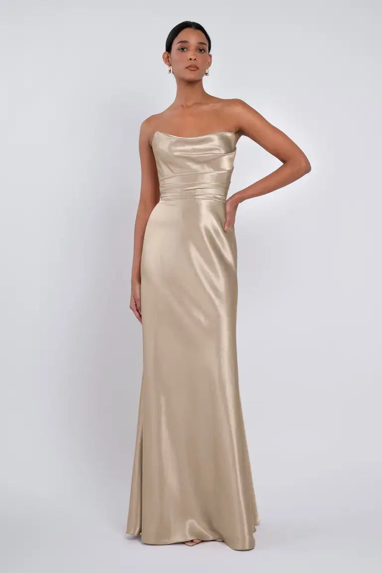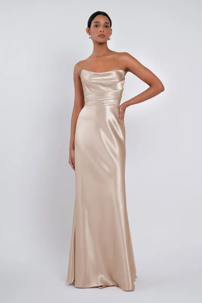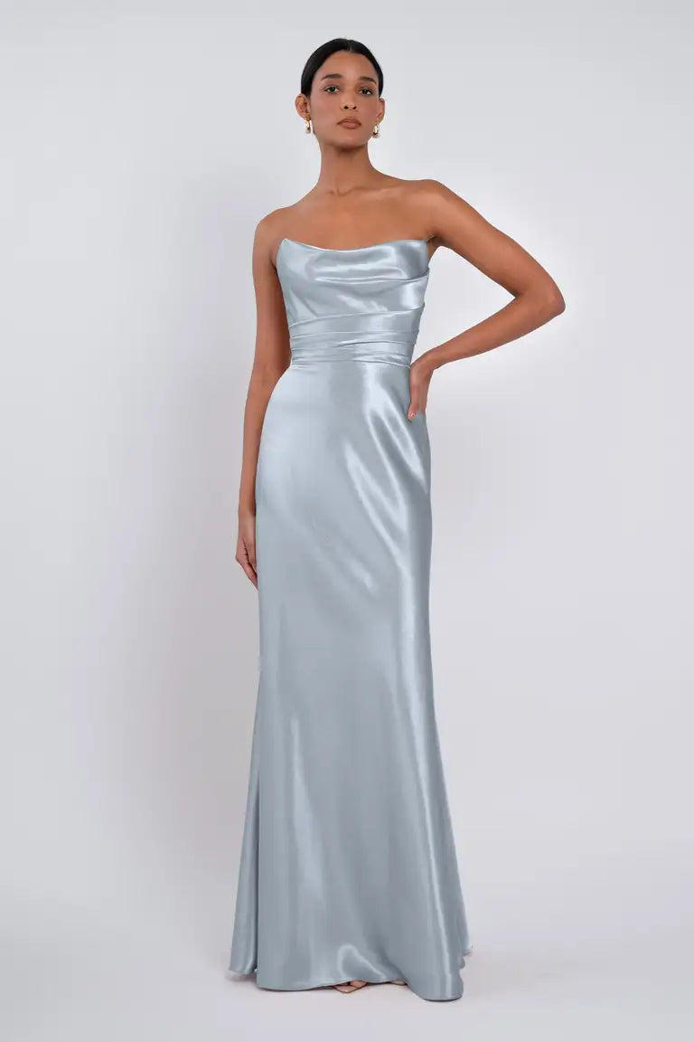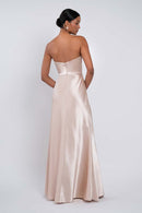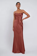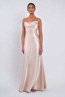 The Corinne dress features a beautifully draped corset bodice with a flattering fit and flare bias cut skirt. A timeless and elegant choice for any occasion.