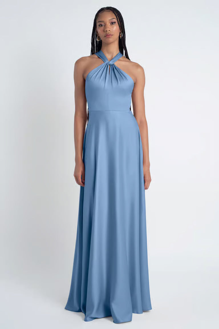 The Daisy bridesmaid dress features a ruched criss cross halter neck line with a keyhole back for a touch of allure and a flowing A-line skirt. This dress exudes elegance and glamour.