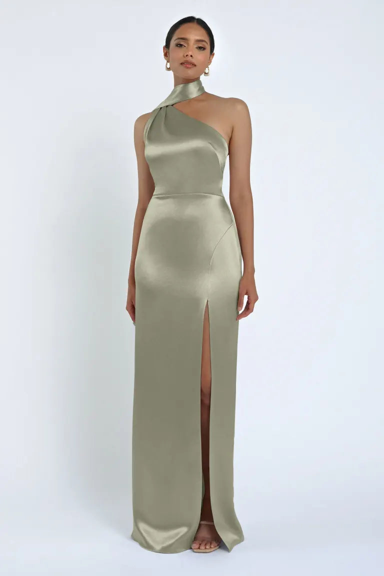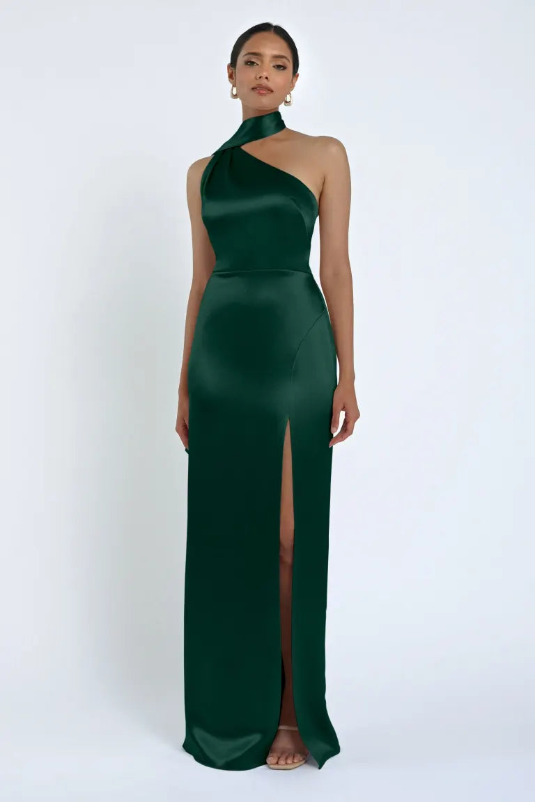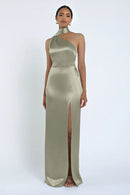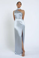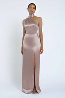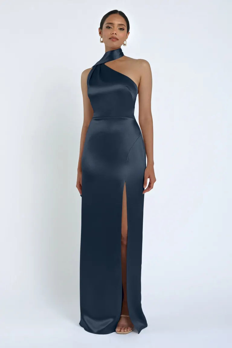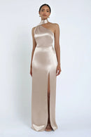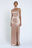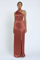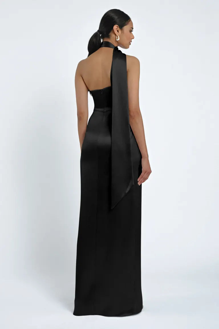 The Hepburn dress is a modern nod to old Hollywood glam. Cut in our beautifully lustrous satin back crepe fabric, her elegant asymmetrical halter neckline wraps around with a dramatic scarf detail.