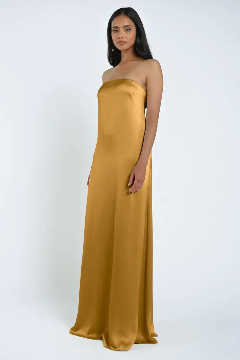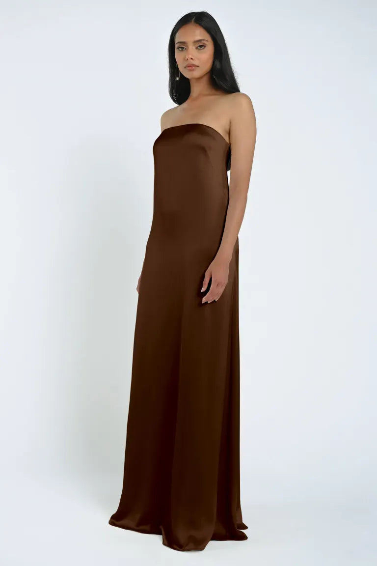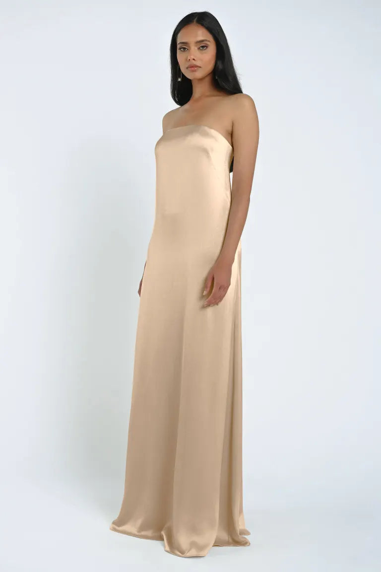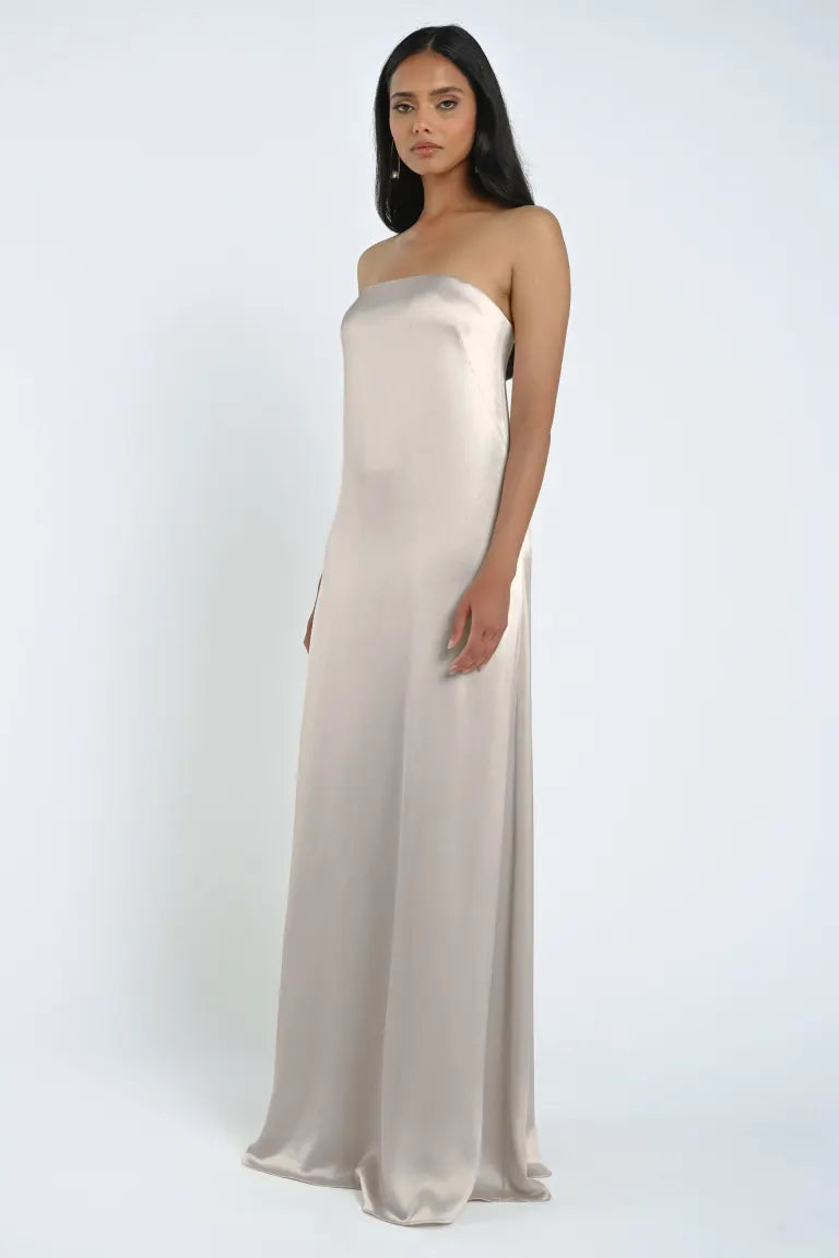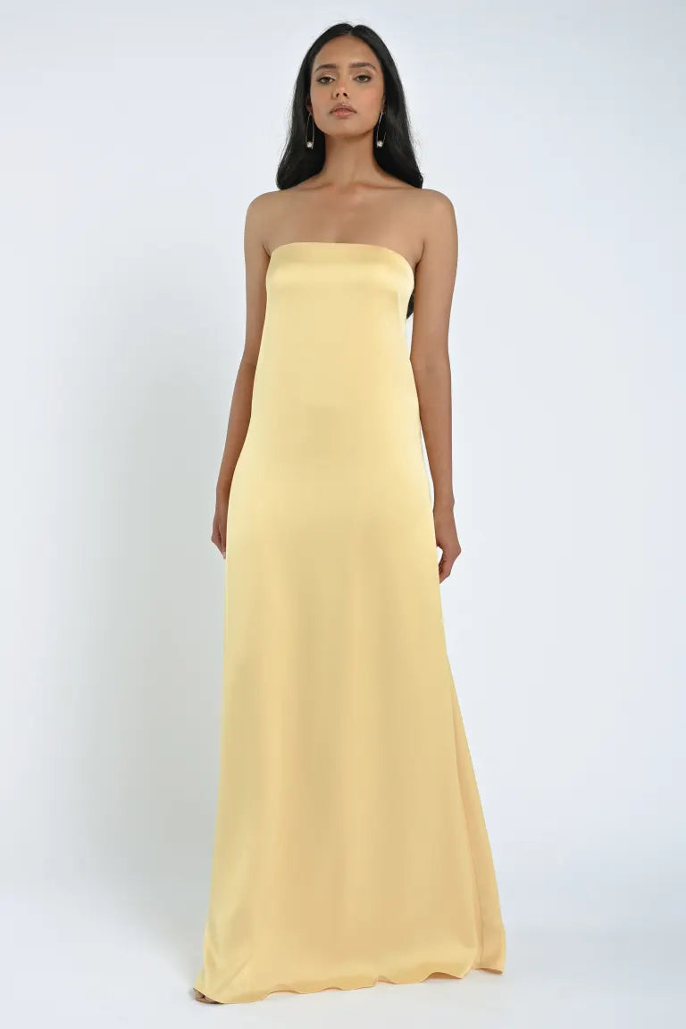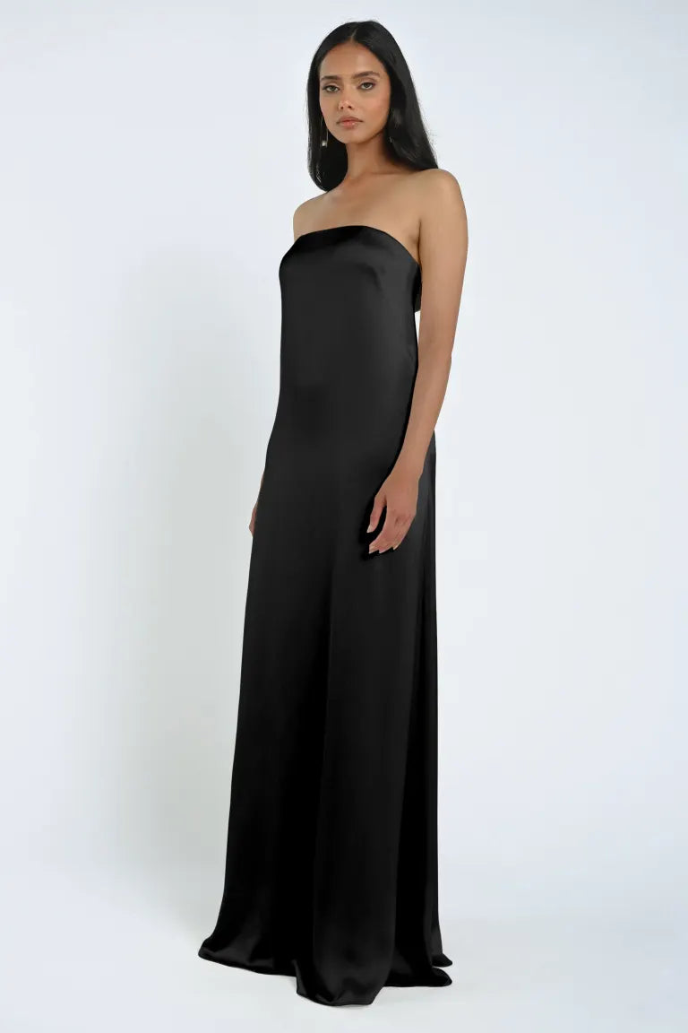 The James dress is as chic and sleek as they come. Our beautifully lustrous luxe satin fabric is cut in a clean strapless neckline with a sheath silhouette for a look as effortless as it is timeless.