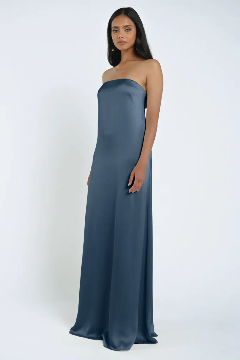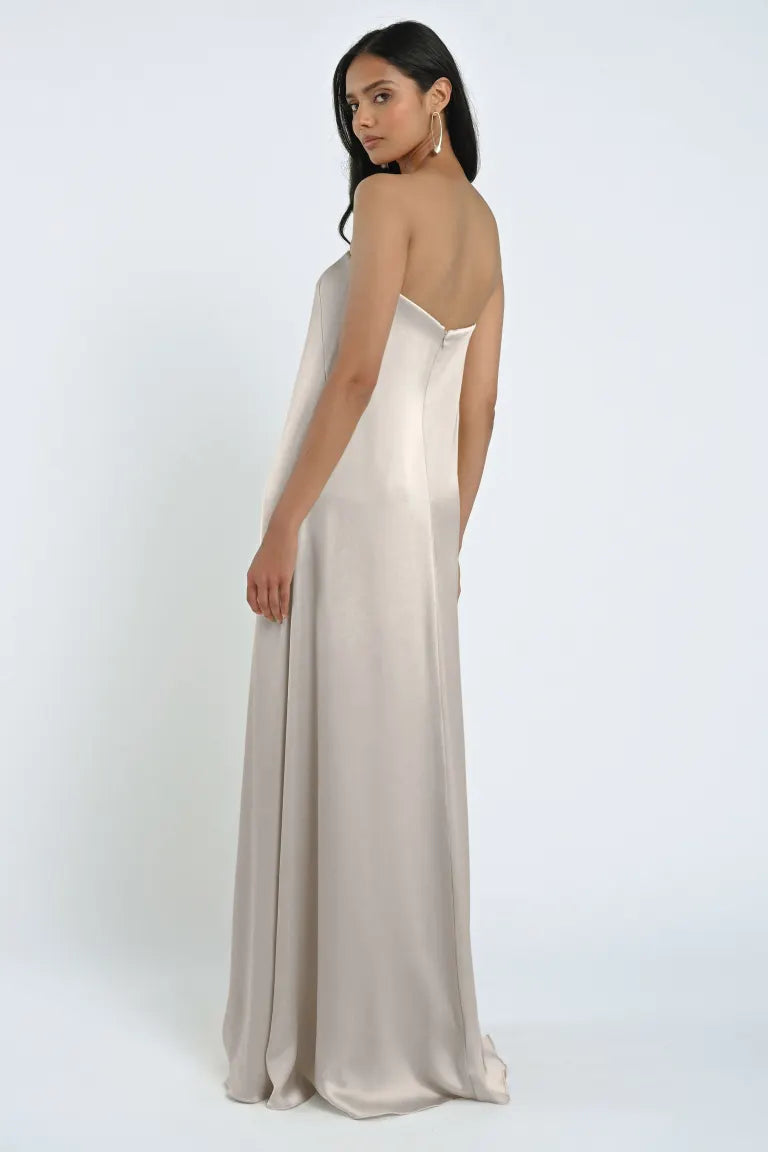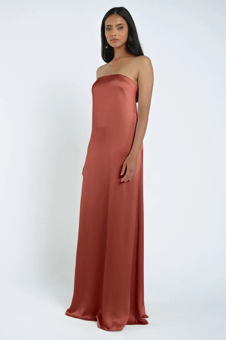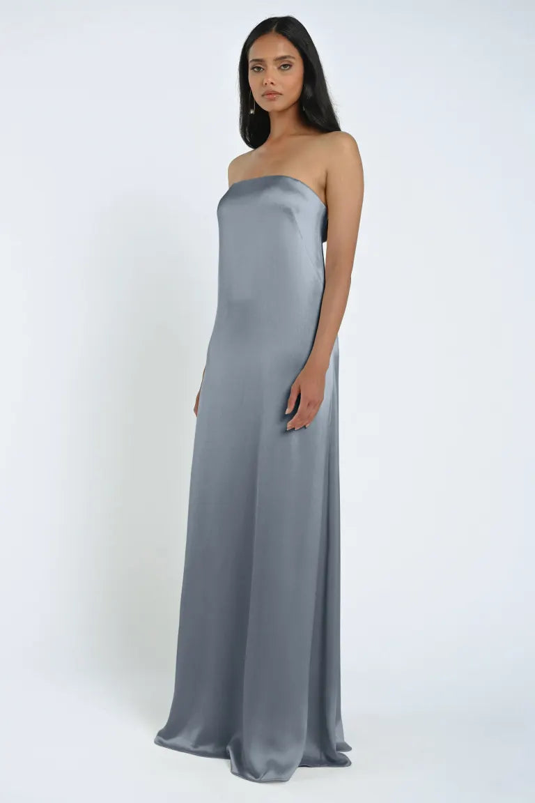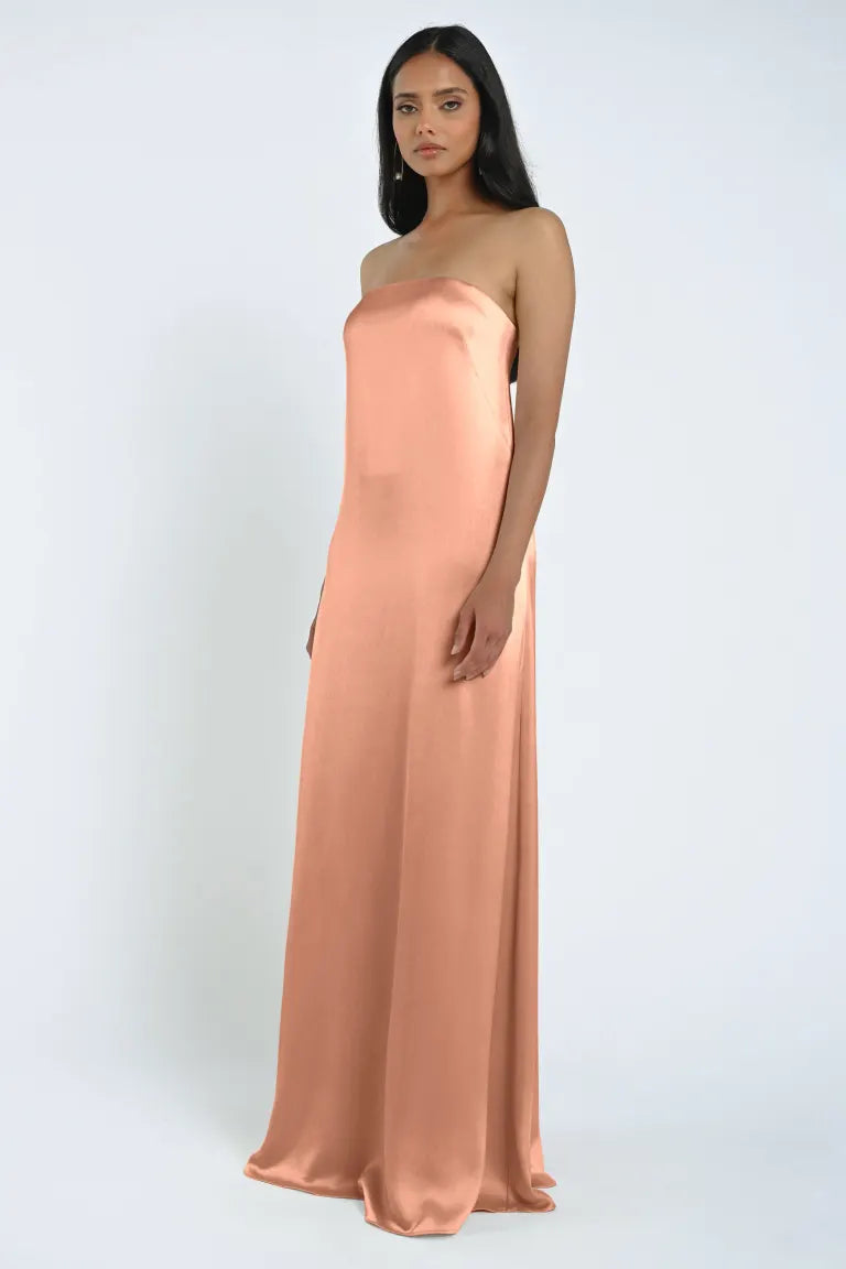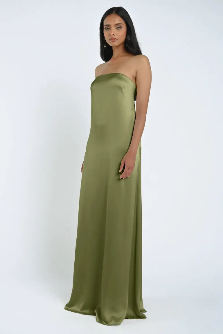 The James dress is as chic and sleek as they come. Our beautifully lustrous luxe satin fabric is cut in a clean strapless neckline with a sheath silhouette for a look as effortless as it is timeless.