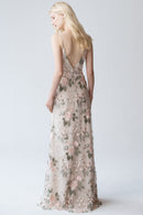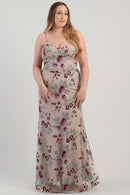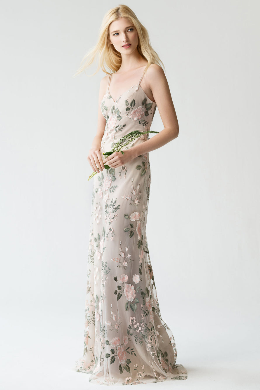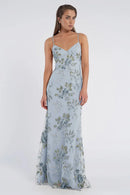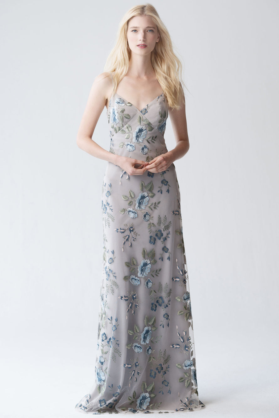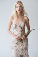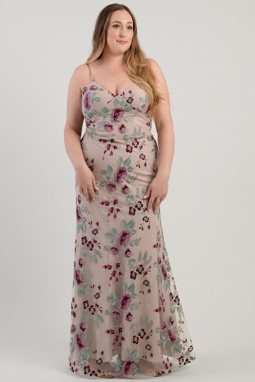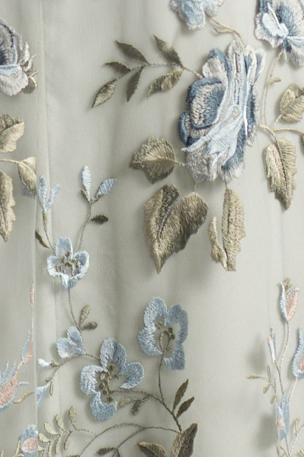 The Julianna dress showcases a V-neckline, delicate spaghetti straps, and a flattering fit and flare skirt. Designed with an angled empire waist seam, it enhances the body's appearance and elongates the silhouette. Made from our intricately embroidered enchanted floral tulle fabric, this dress effortlessly embodies a romantic aesthetic.