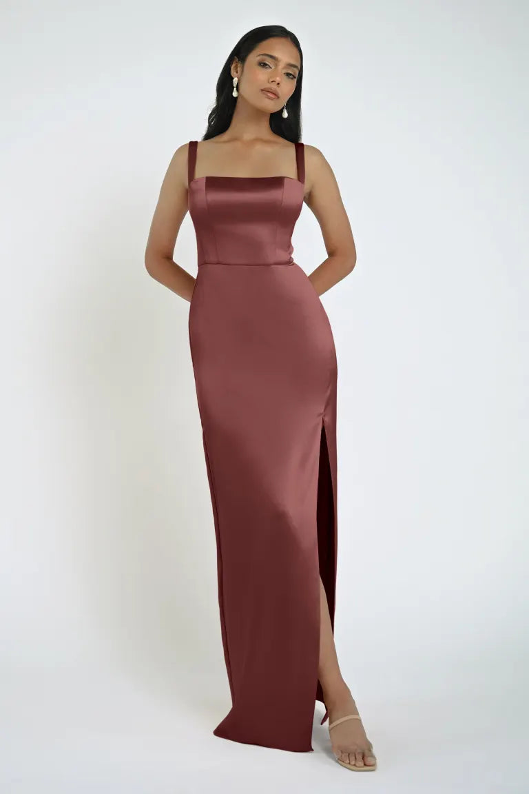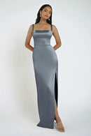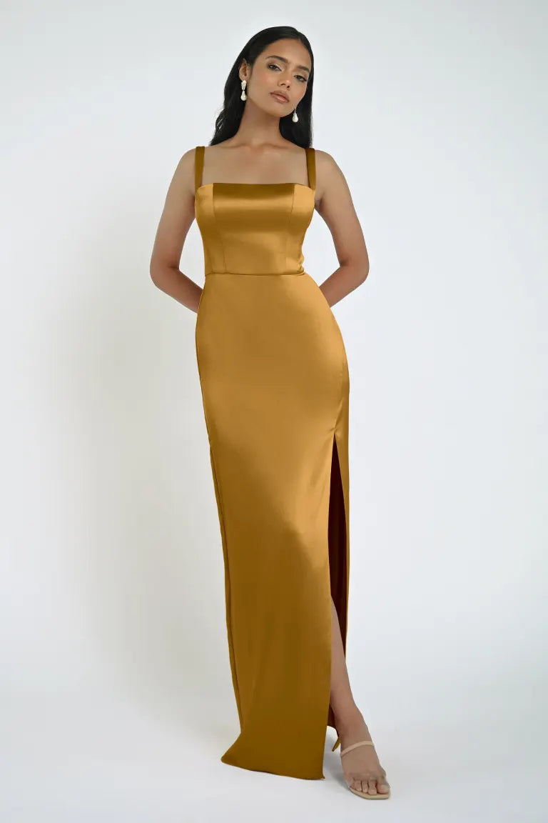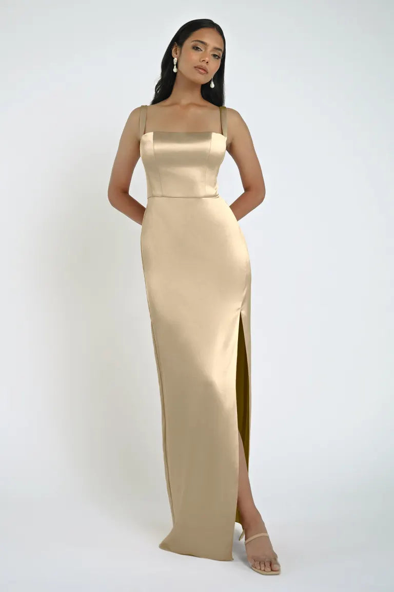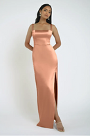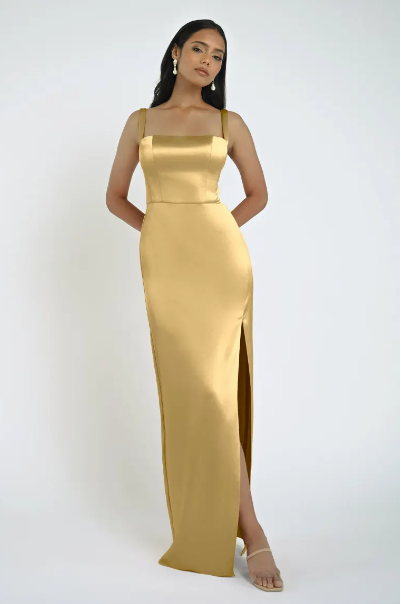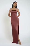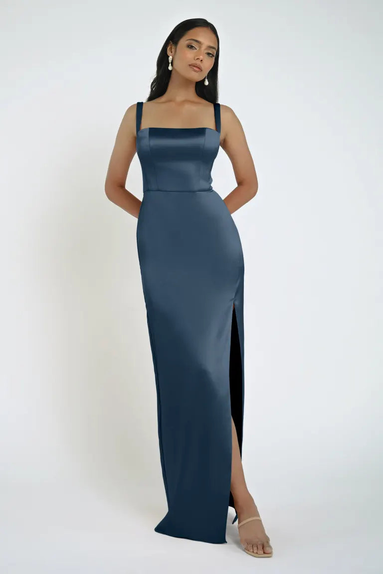 A bombshell has entered the wedding! The Lowe dress is sure to turn heads with her striking square neckline and sleek skirt with a daring slit.