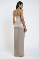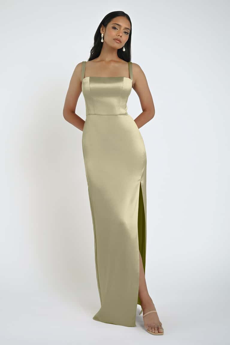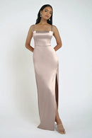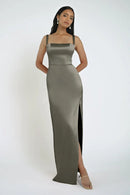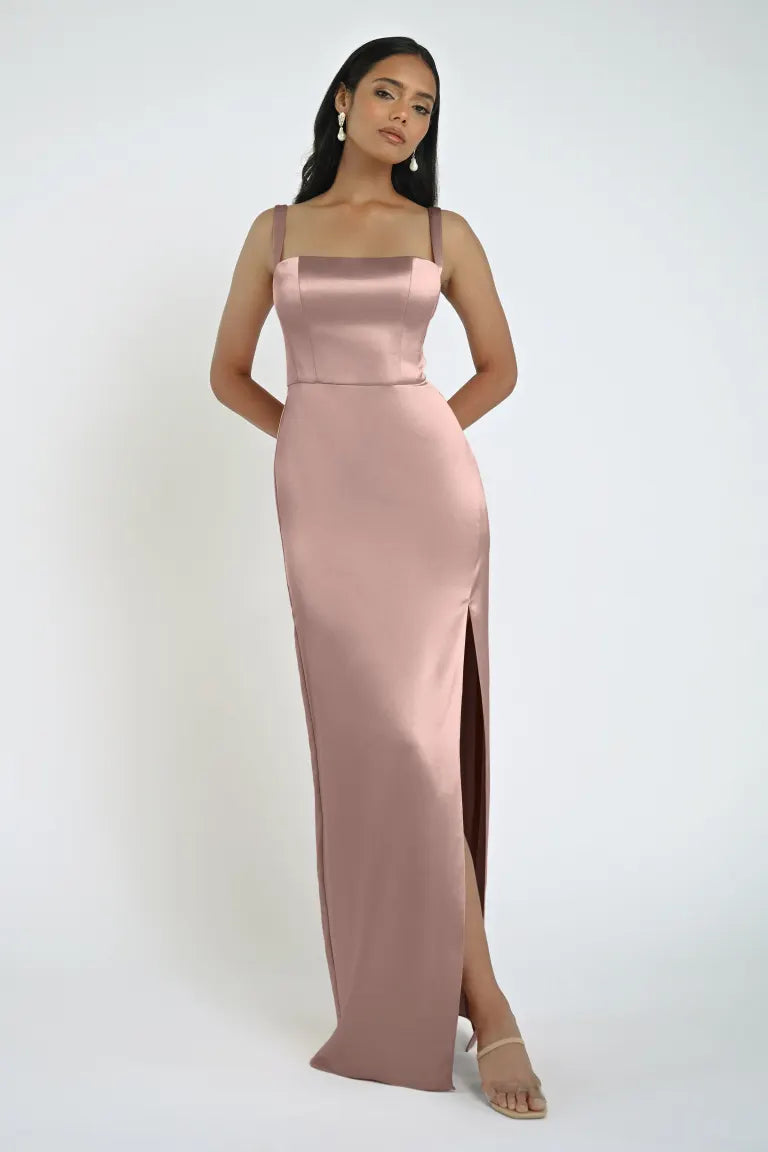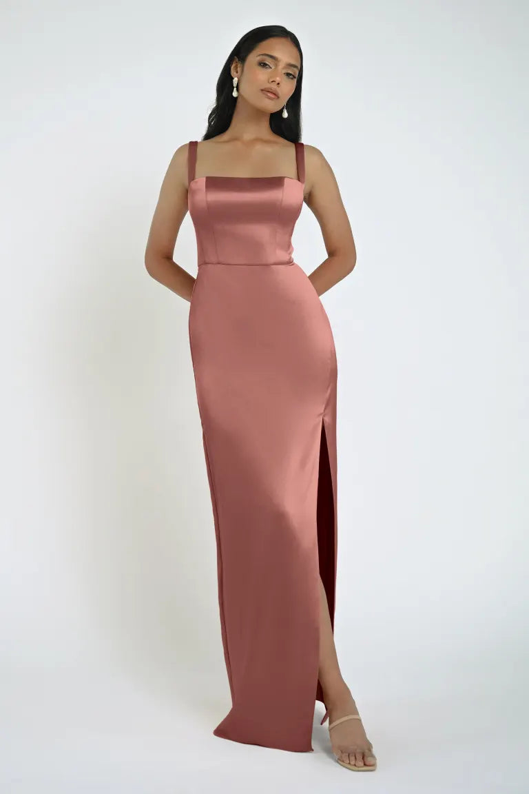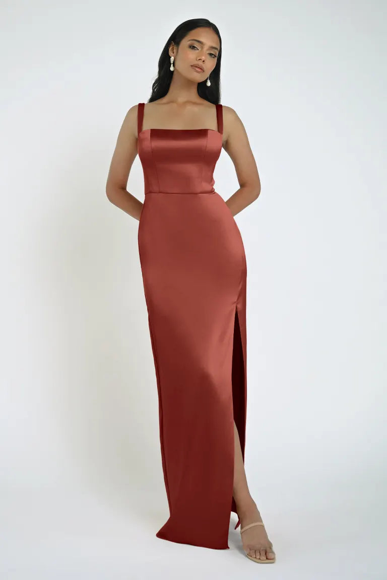A bombshell has entered the wedding! The Lowe dress is sure to turn heads with her striking square neckline and sleek skirt with a daring slit.
