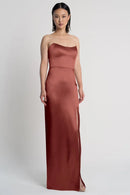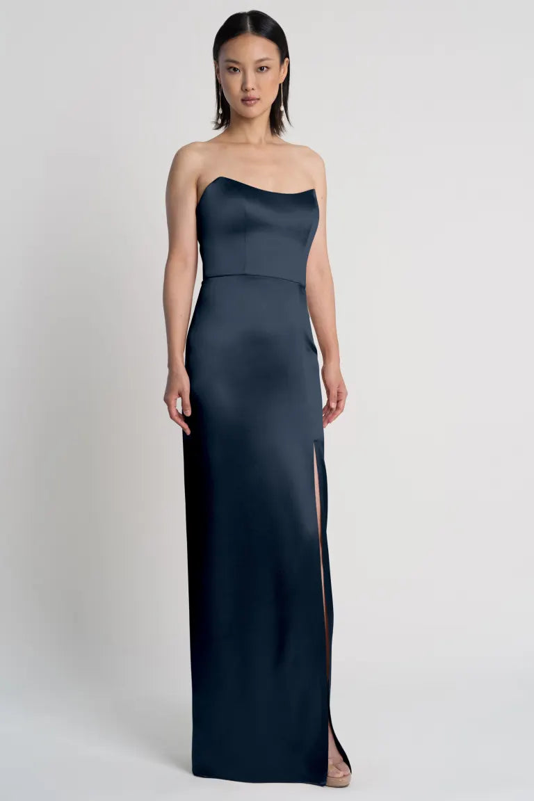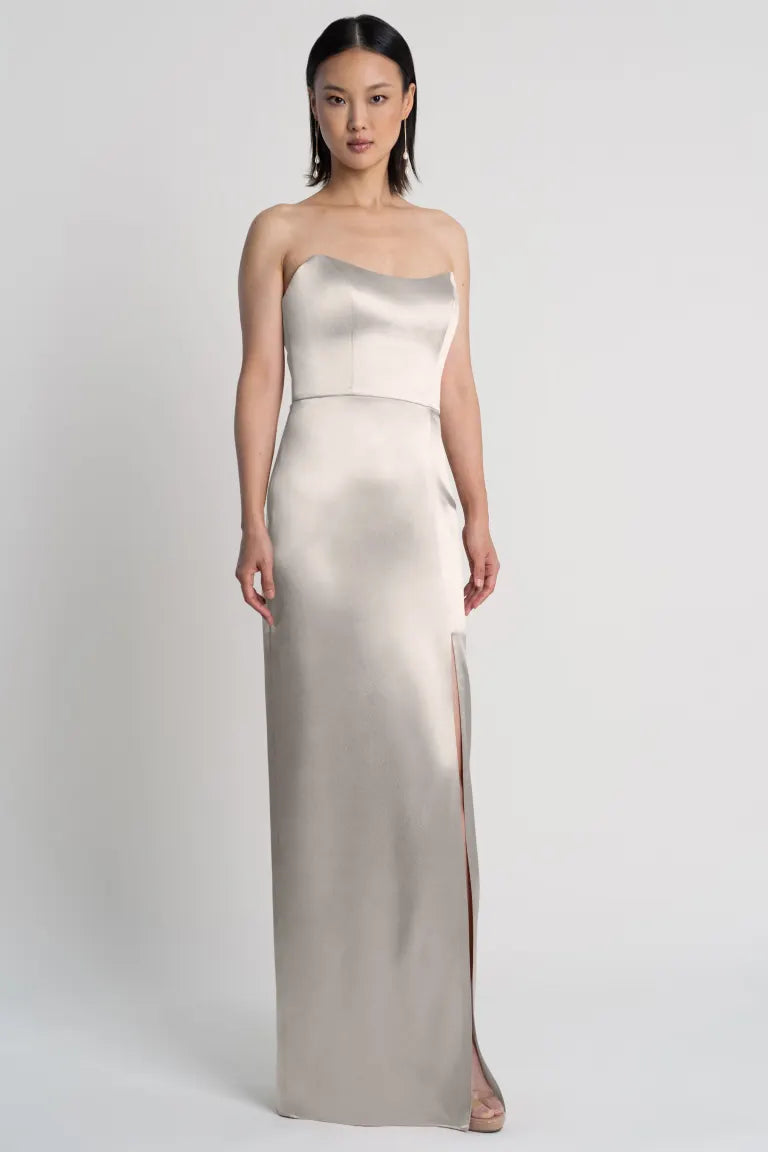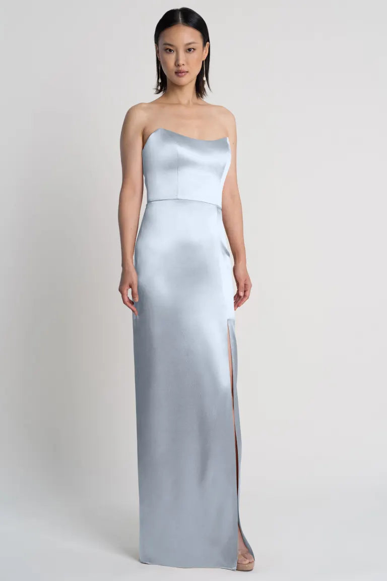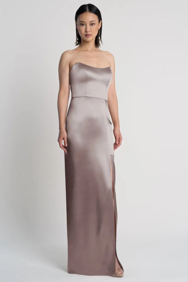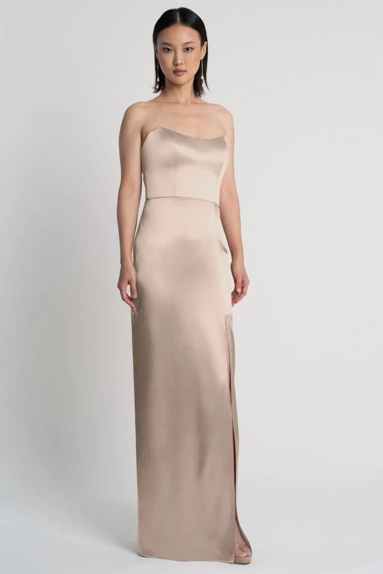 The Nadia satin back crepe bridesmaid dress features a sultry scooped strapless neckline with dramatic high peaks and a slim pegged skirt with a daring side slit, making it a stylish choice for any bridal party.