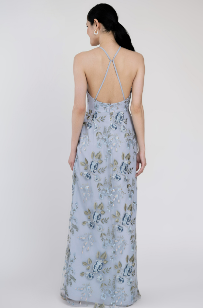 The Rebecca dress features intricately textured blooms and delicate leaves. This style features a sleek halter neckline and a flattering column skirt with a daring slit and strappy open back.