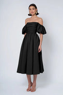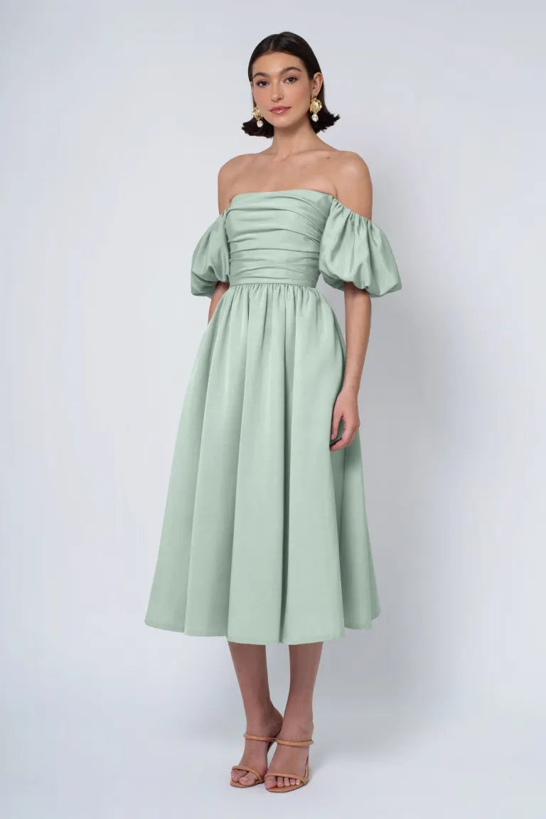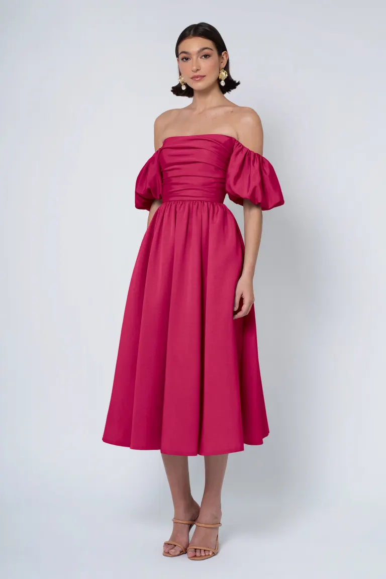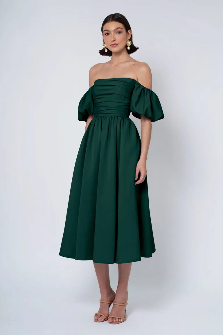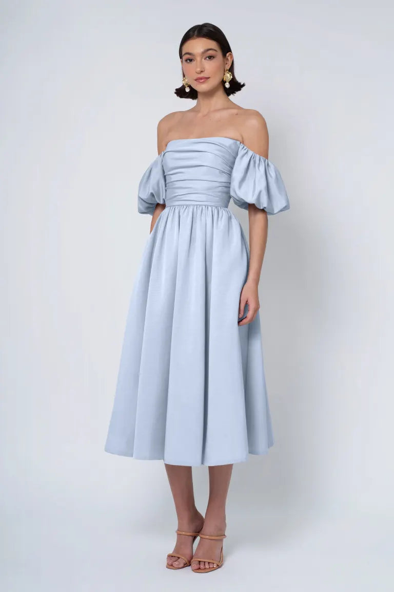 The Regina dress in our luxurious faille is a fashionable and versatile choice for any occasion. It boasts a pleated bodice with a streamlined, straight strapless neckline, removable puff sleeves, a playful midi-length dirndl skirt, and everyone’s favorite — pockets!