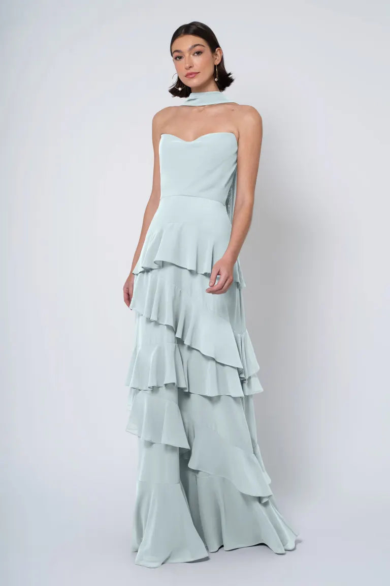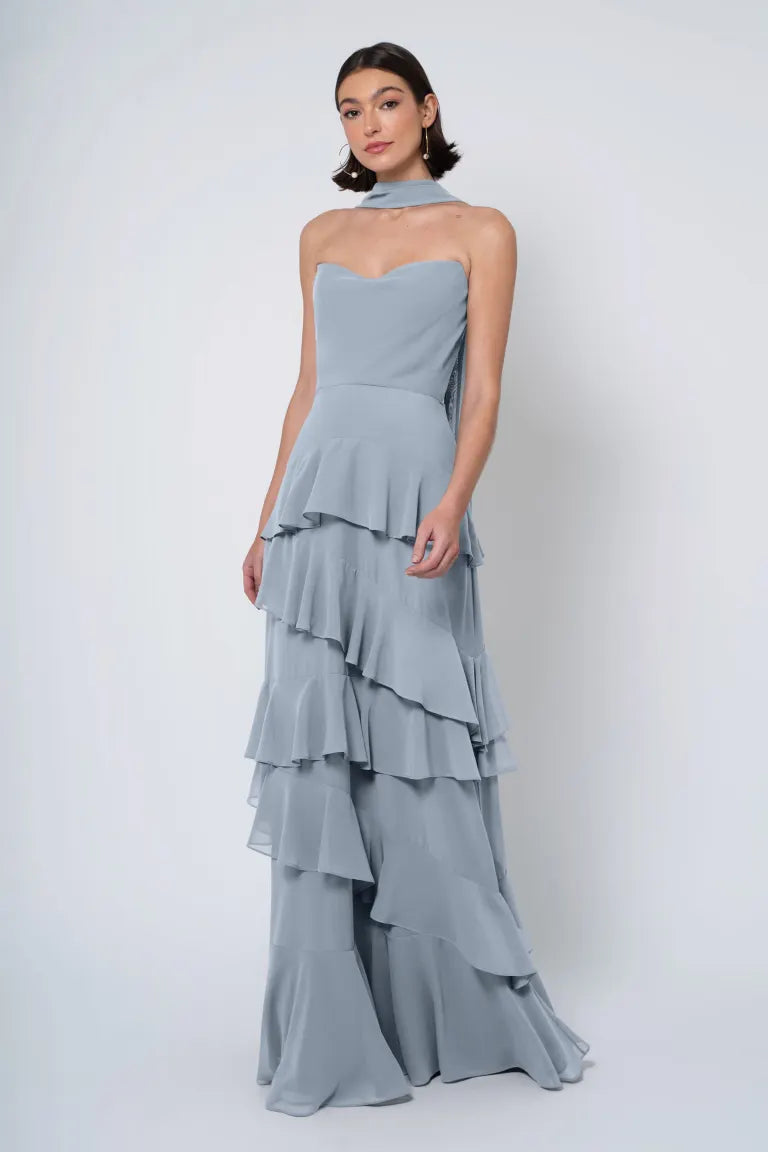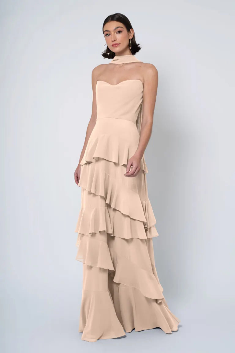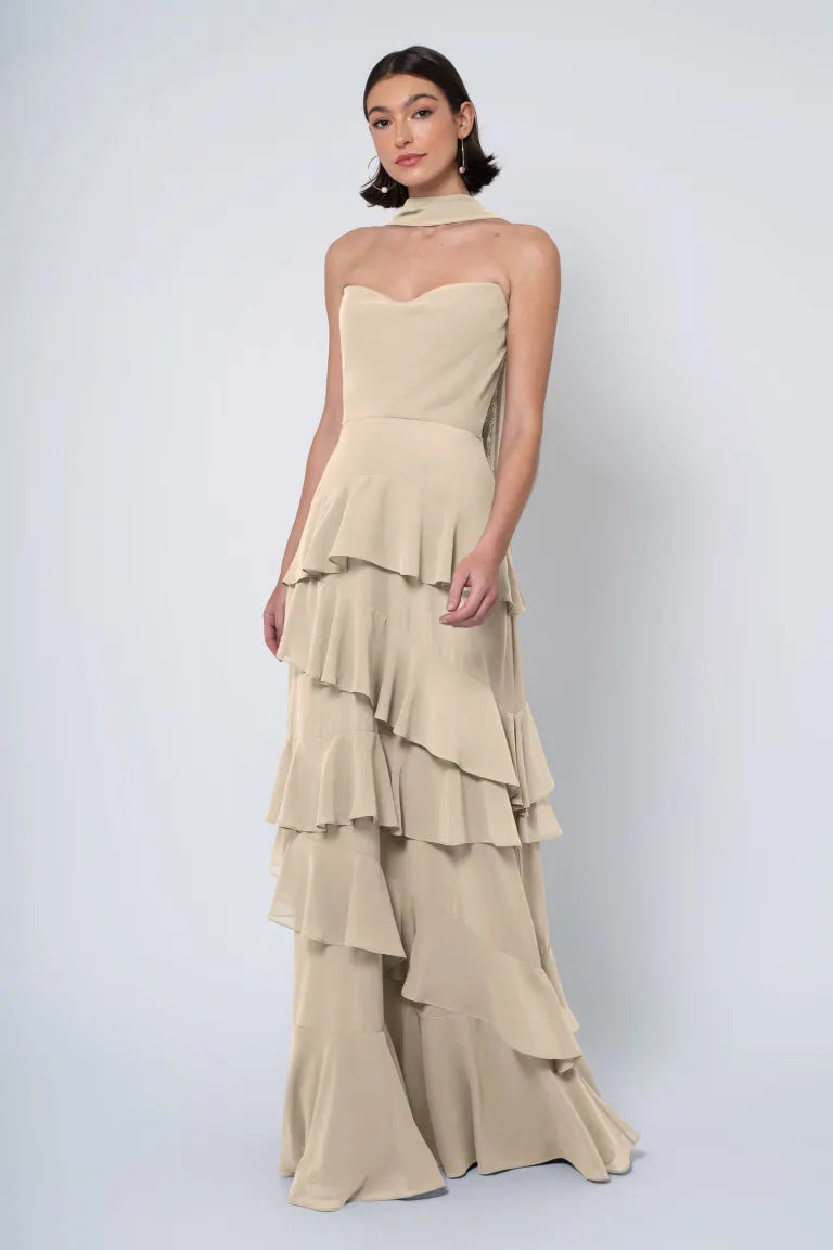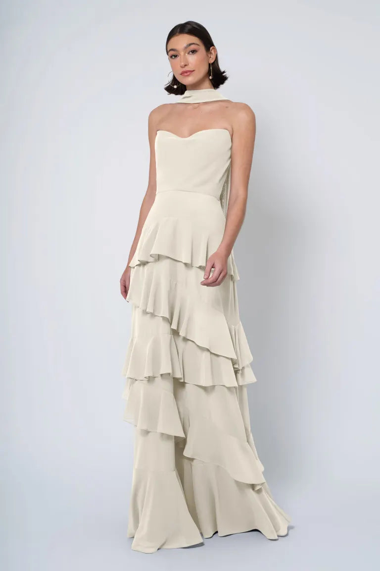 The Simona chiffon bridesmaid dress is filled with delicate feminine touches with its strapless cowl neckline, romantically ruffled A-line skirt, and neck scarf for added drama.