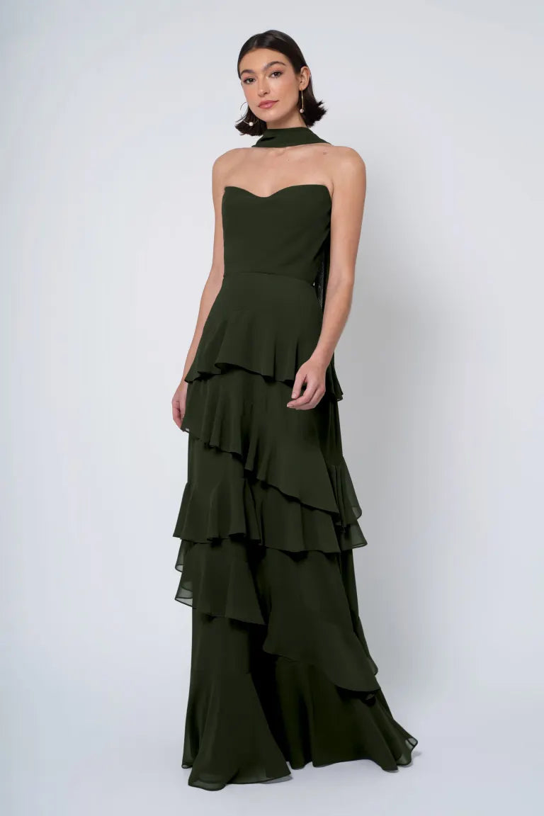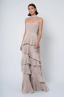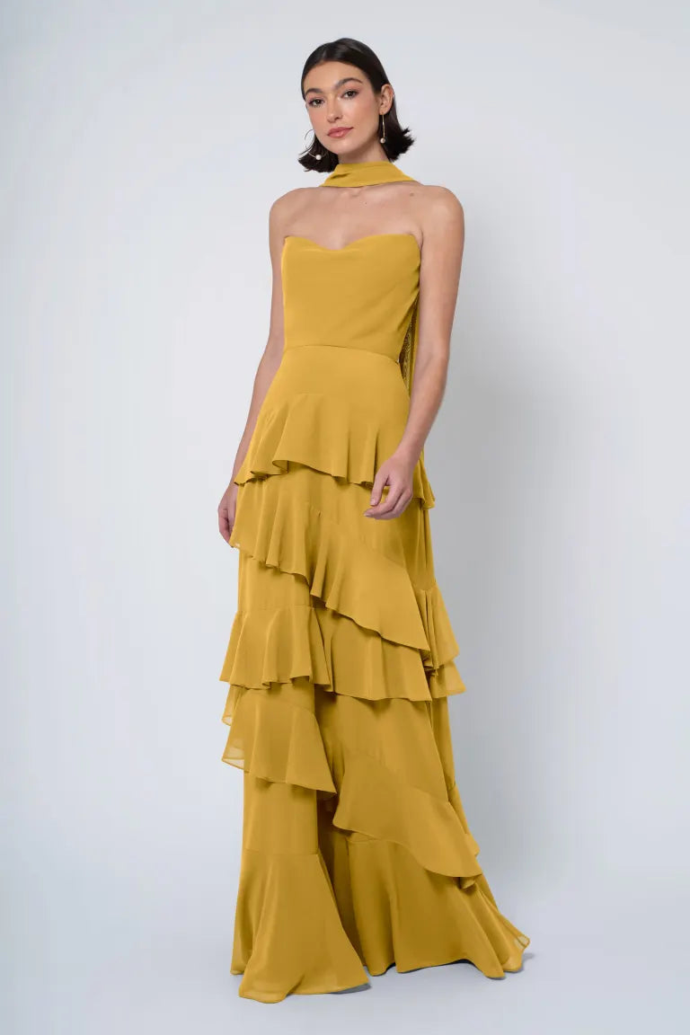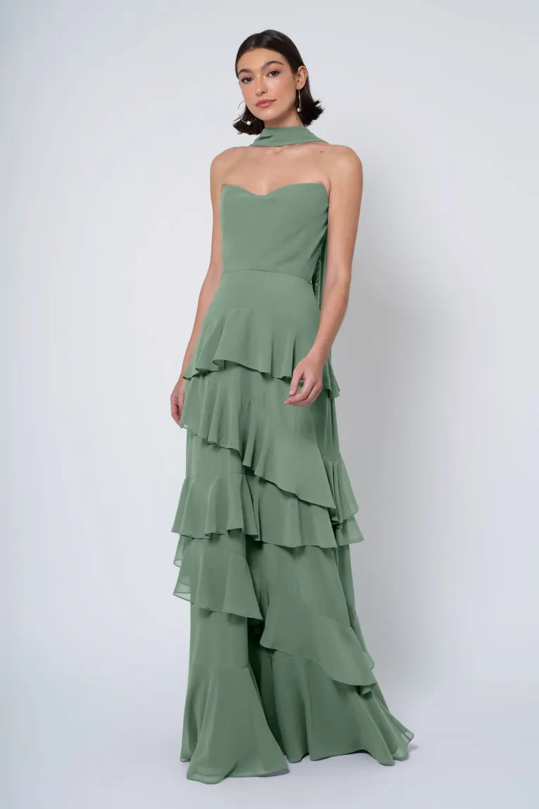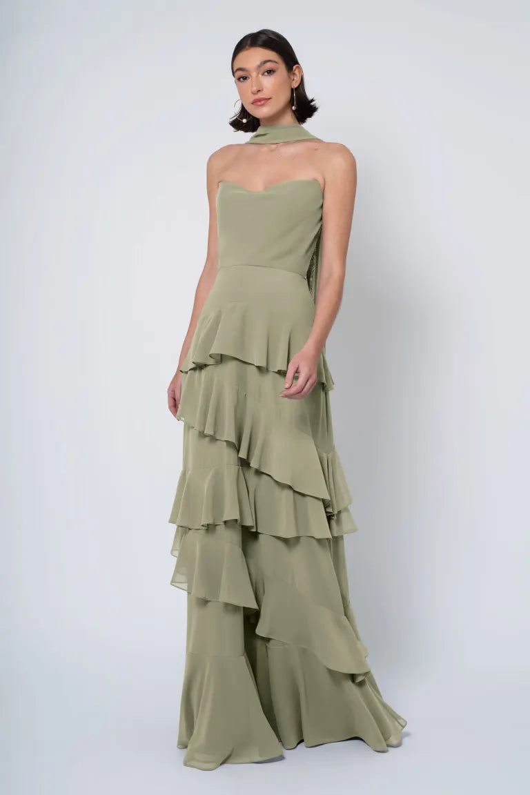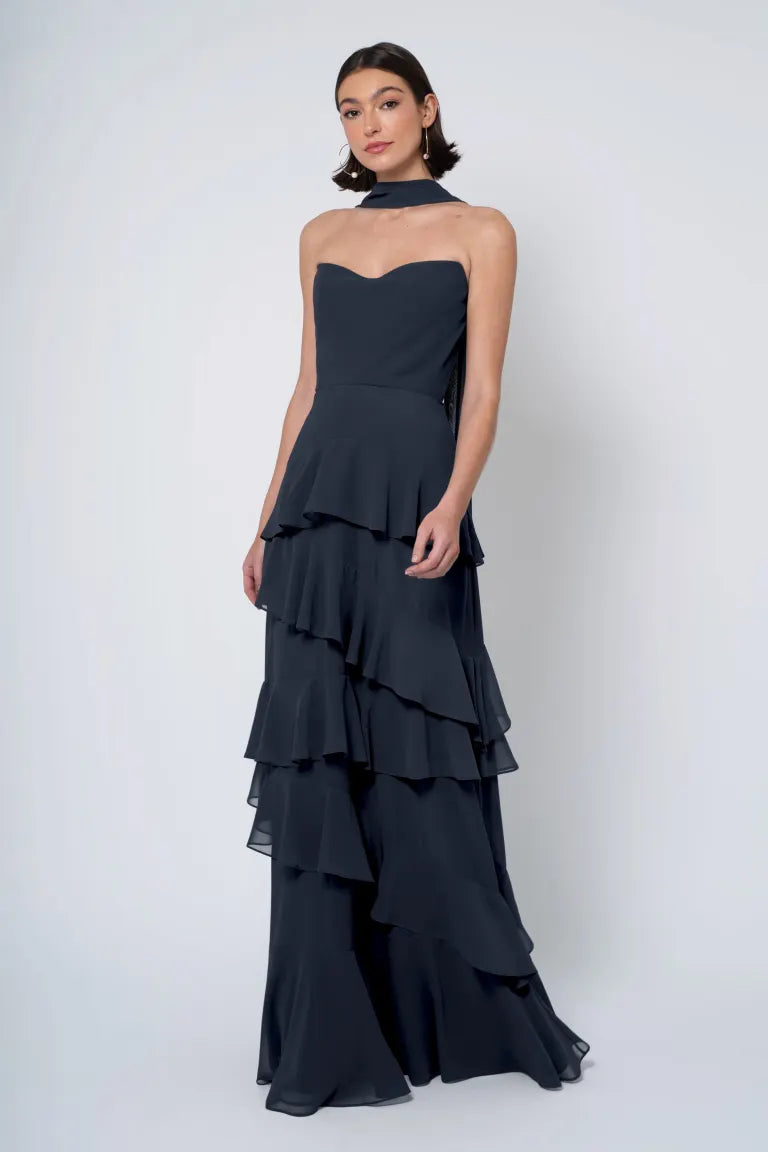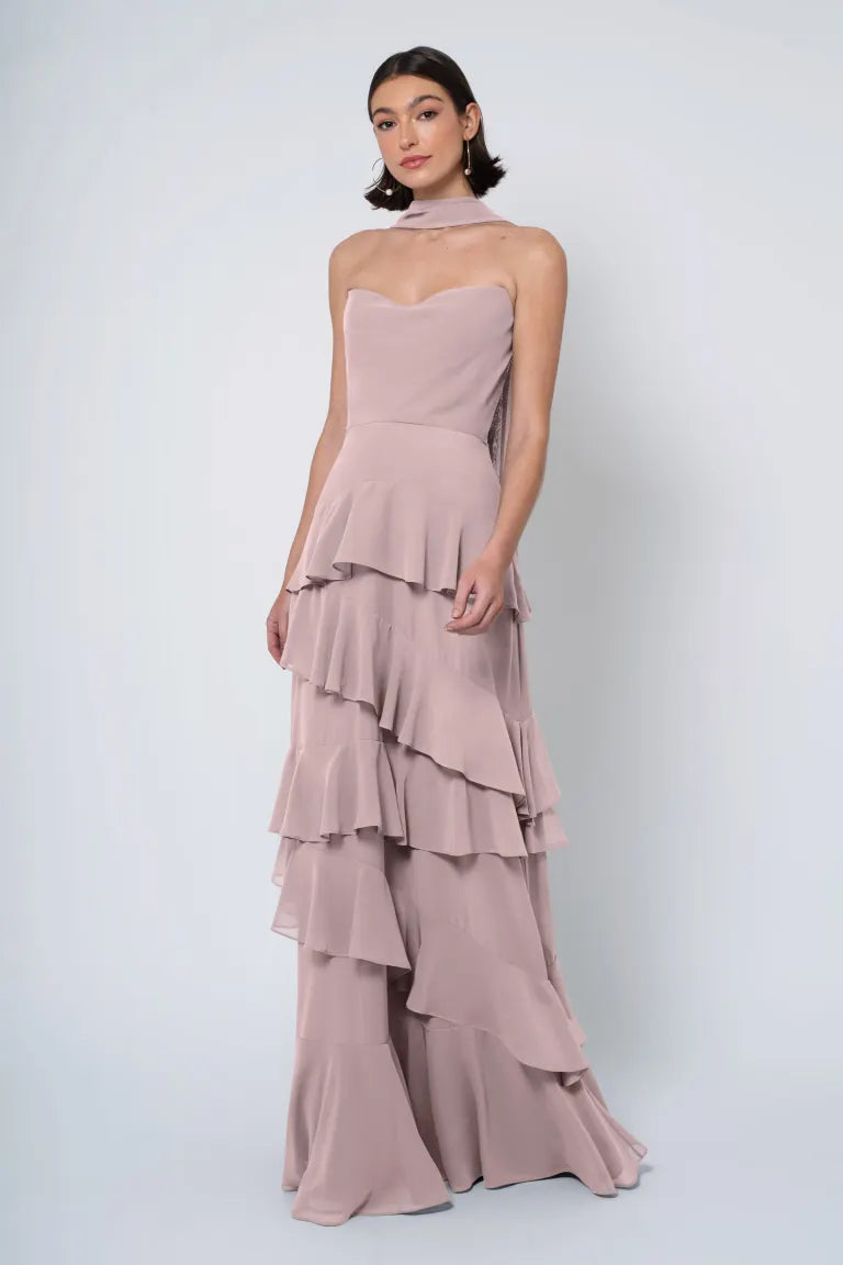 The Simona chiffon bridesmaid dress is filled with delicate feminine touches with its strapless cowl neckline, romantically ruffled A-line skirt, and neck scarf for added drama.