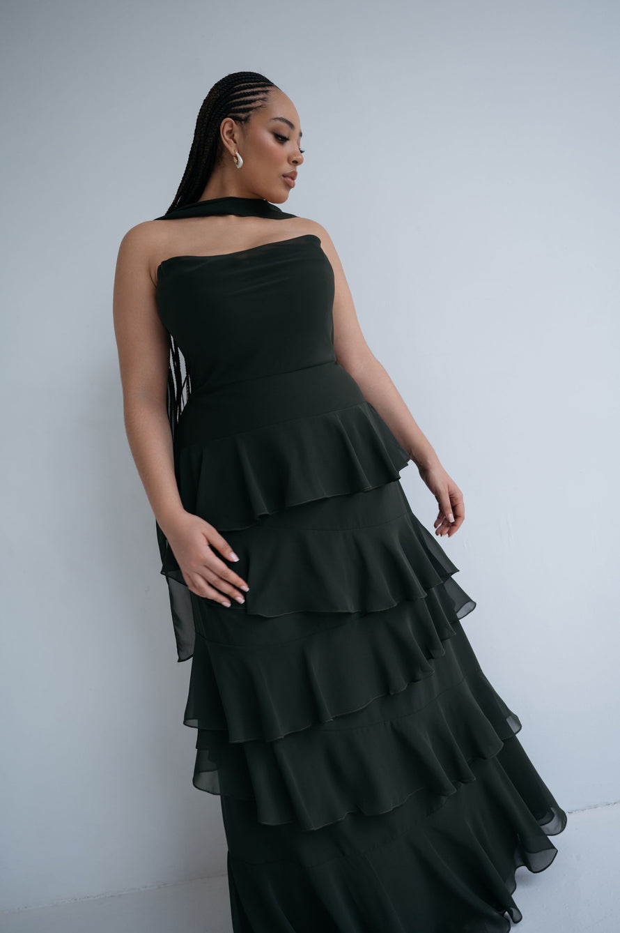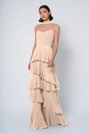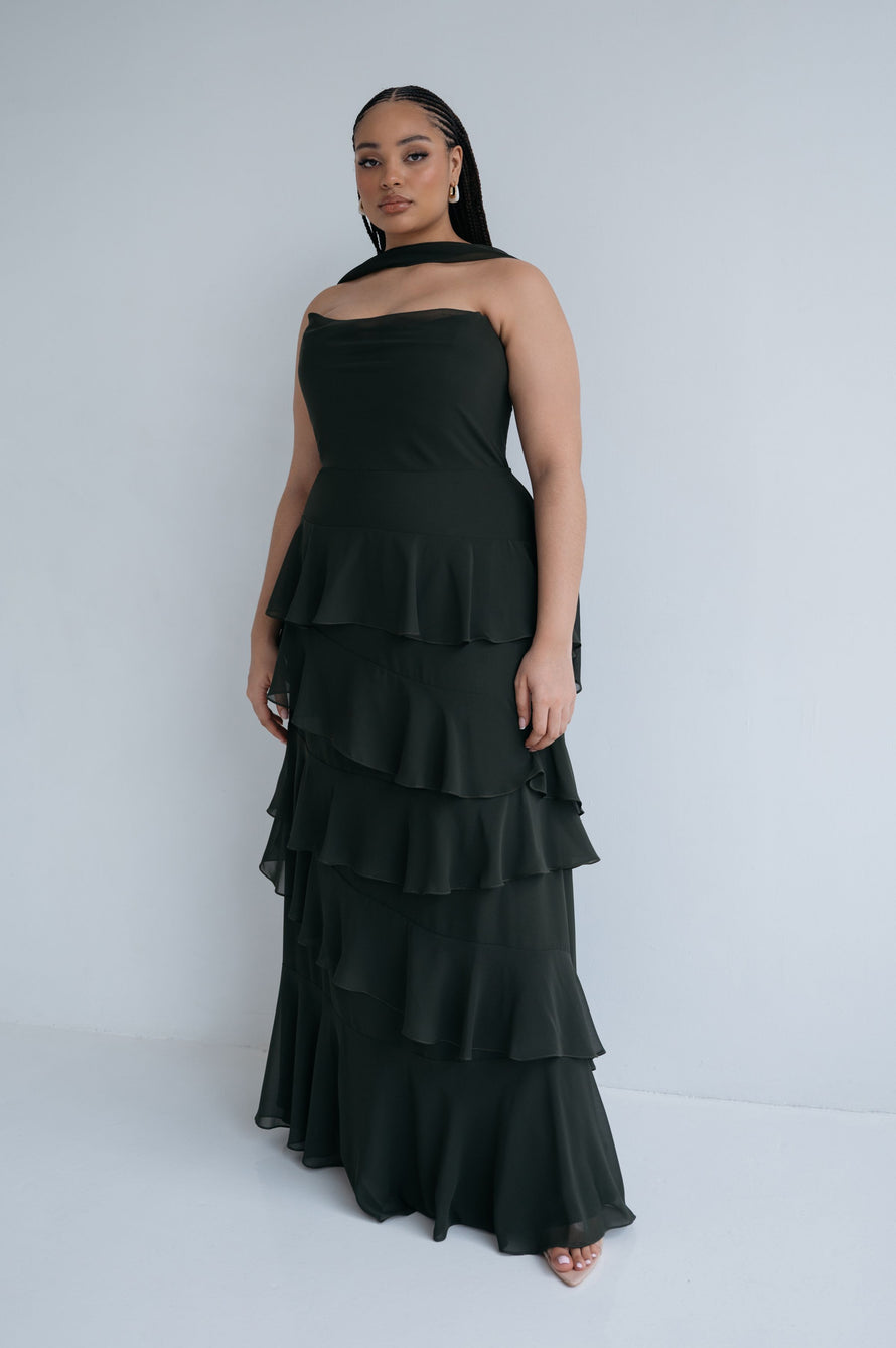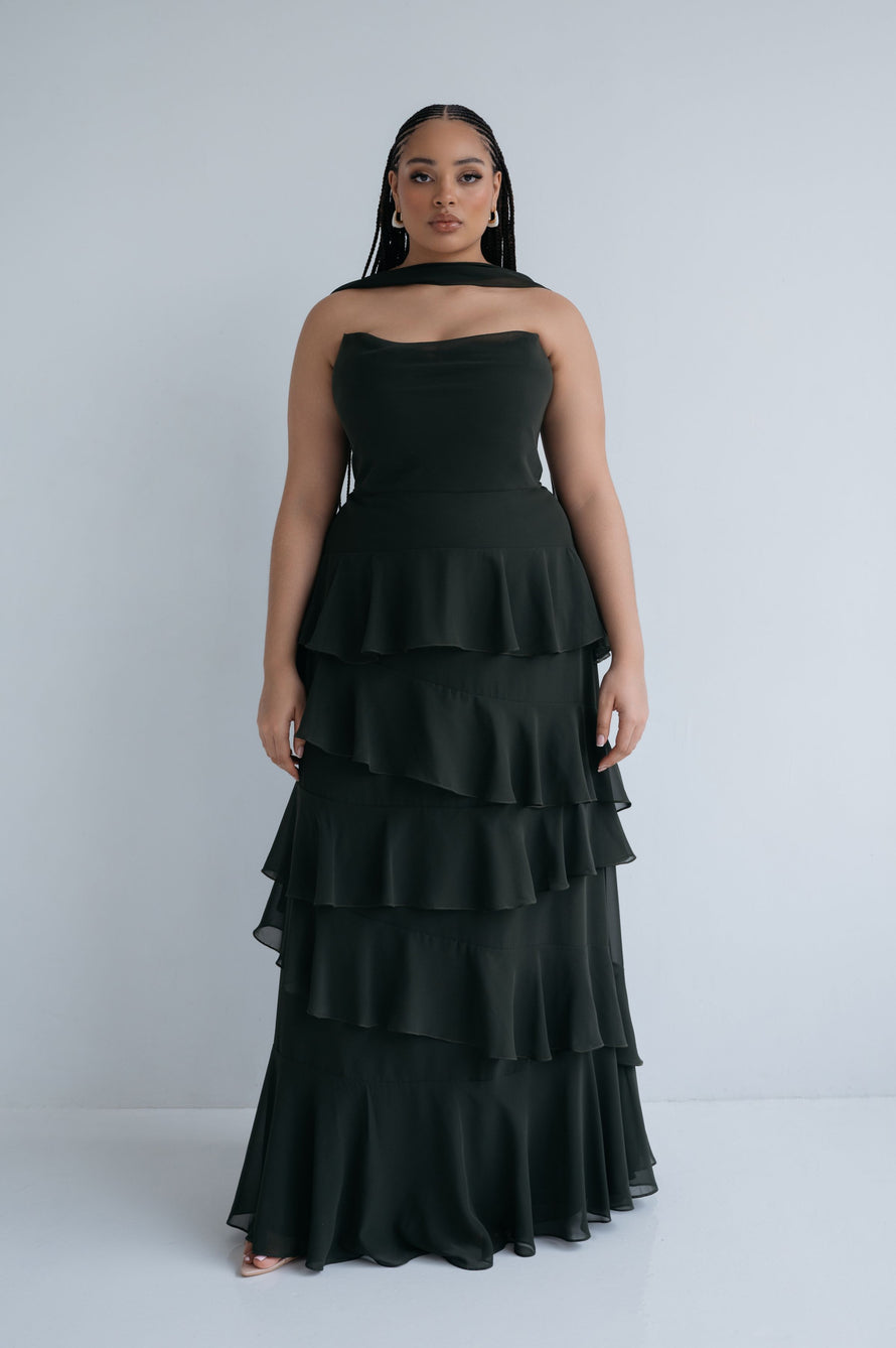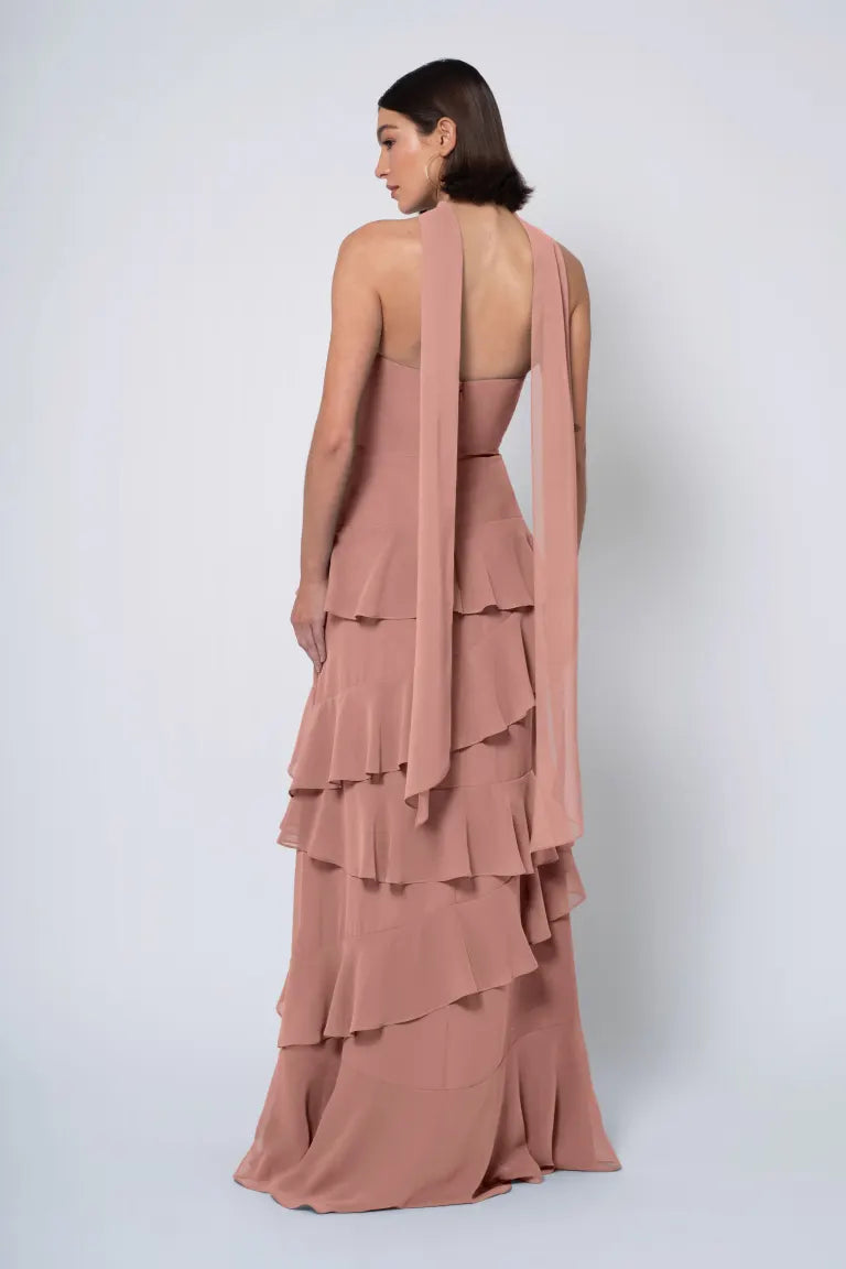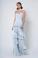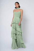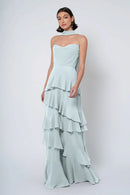The Simona chiffon bridesmaid dress is filled with delicate feminine touches with its strapless cowl neckline, romantically ruffled A-line skirt, and neck scarf for added drama.