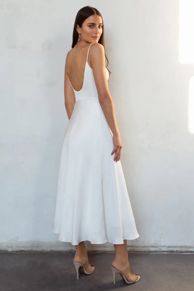 The Callista midi dress, crafted from our luxurious soft Mikado fabric, is timeless and showcases a clean scoop neckline, delicate spaghetti straps, a beautifully structured bodice and circle cut skirt. This dress is chic yet elegant and a great choice for any bridal occasion.