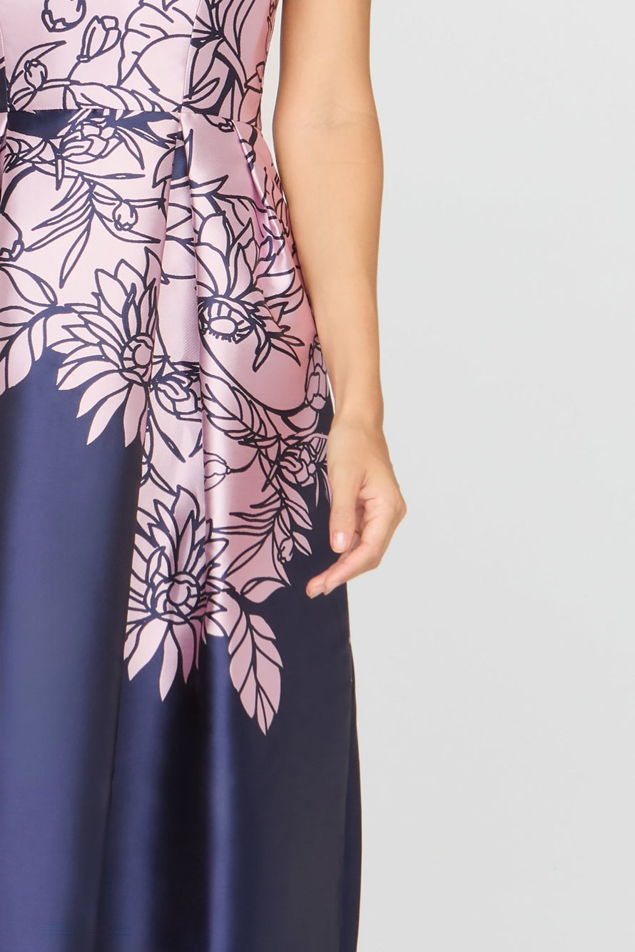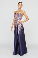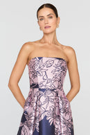 Two tone linear floral jacquard, strapless, with pleated front skirt gown with pockets.