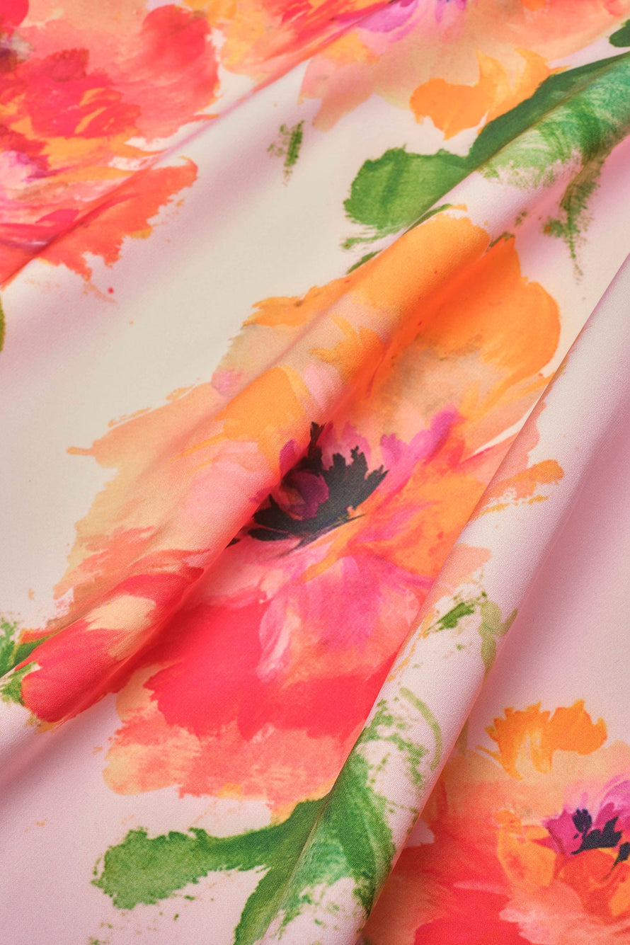 Placement print on stretch crepe, 3/4 sleeve, v neckline with drape detail, placed floral print on skirt, side slit, column gown.