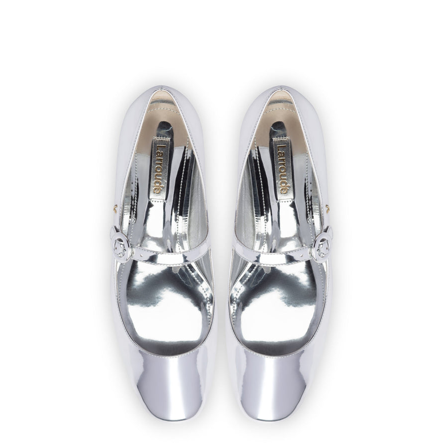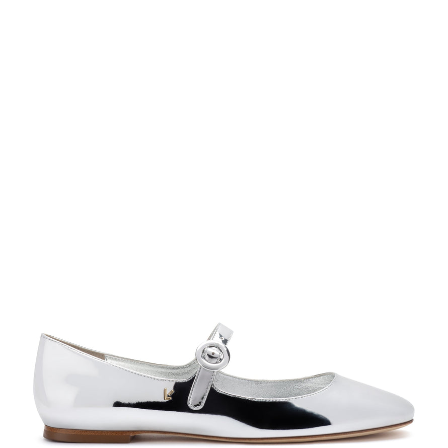 A cute mary jane infused with contemporary flair, swiftly evolving into a beloved icon. Introducing our latest chic flat, boasting a streamlined design and adaptable ankle strap, all in a luminous silver leather.