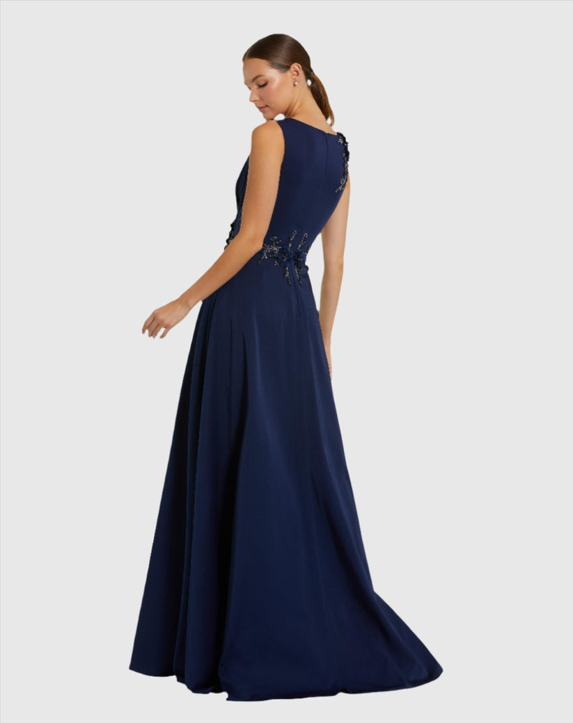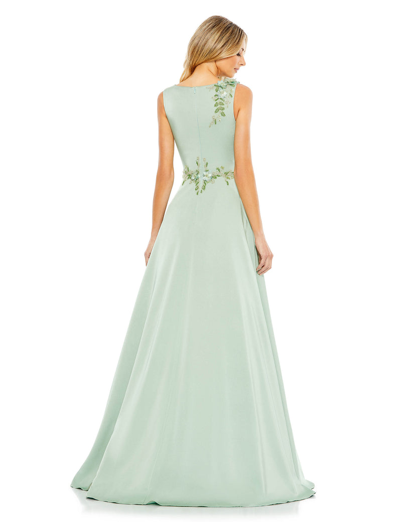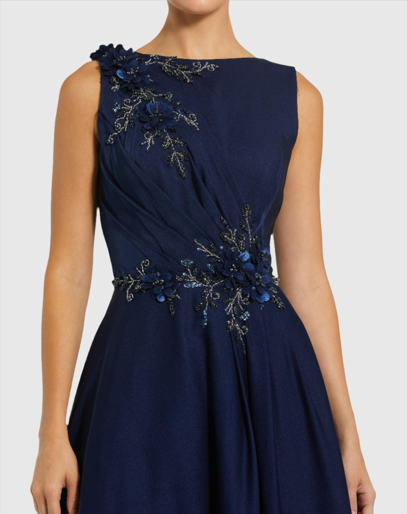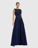 This sleeveless a-line gown boasts a boat neckline and an elegantly embellished bodice. Delicate floral details and a flowing silhouette make this gown a timeless and sophisticated choice for any special occasion.