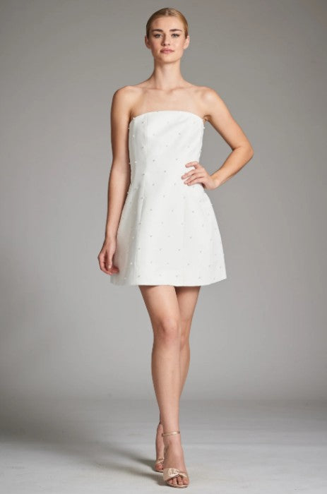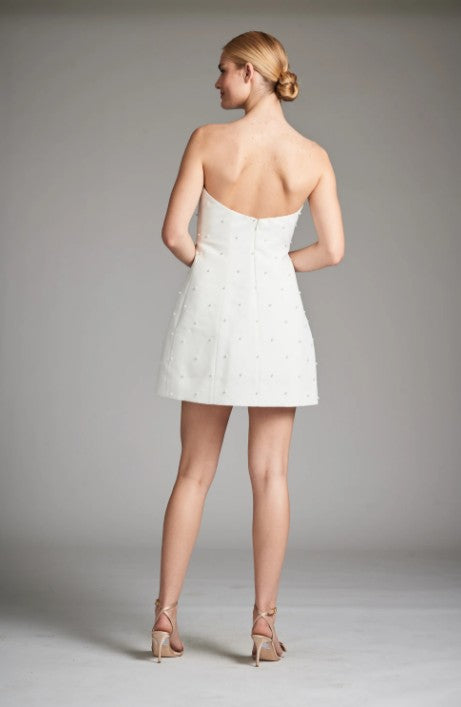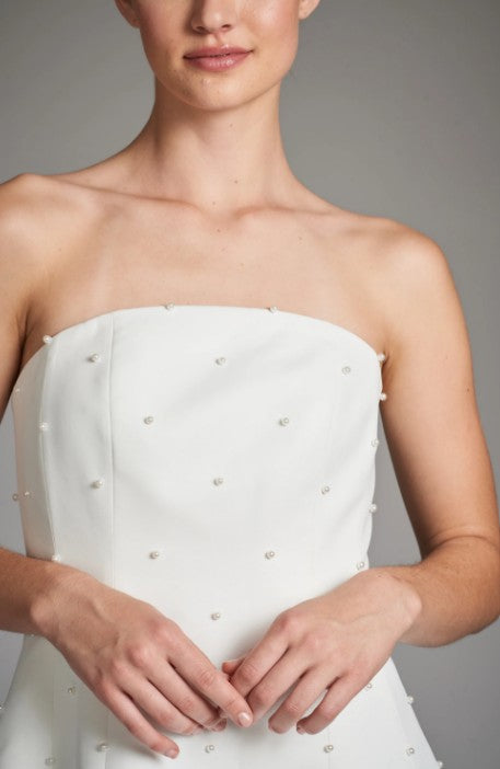 The Alanna dress in ivory embodies sculptural elegance. Our ultimate little white dress maintains its perfect bell shape with a concealed horsehair hem, while bodice boning defies gravity. Delicate embroidered flowers adorn the neckline, fading seamlessly at the bust. Alanna is a limited edition, meticulously embroidered by artisans in India, requiring hours of handwork to complete.