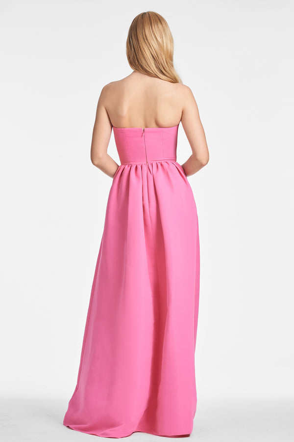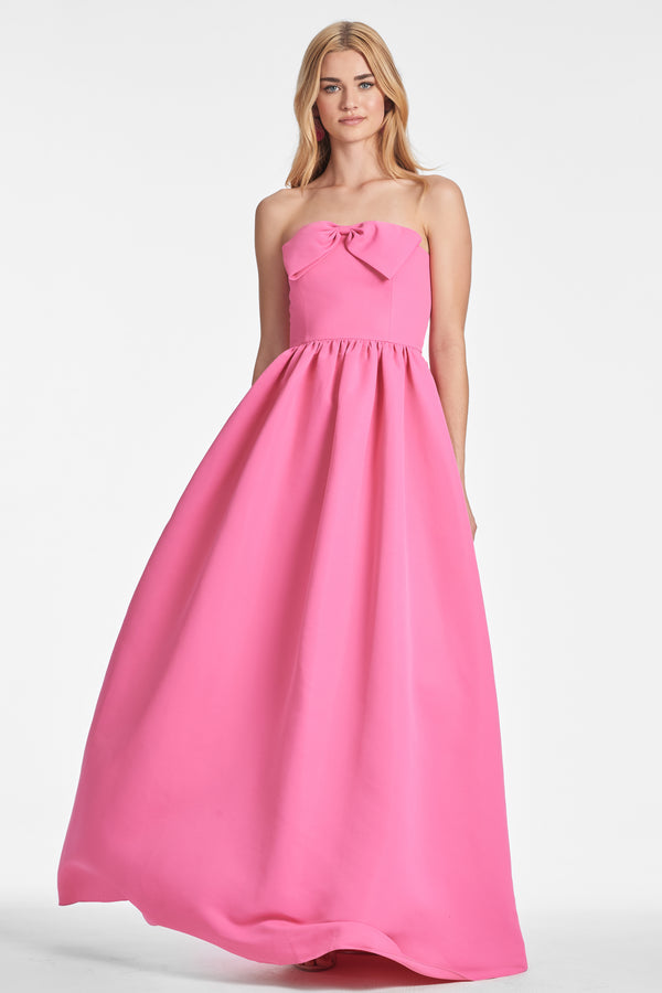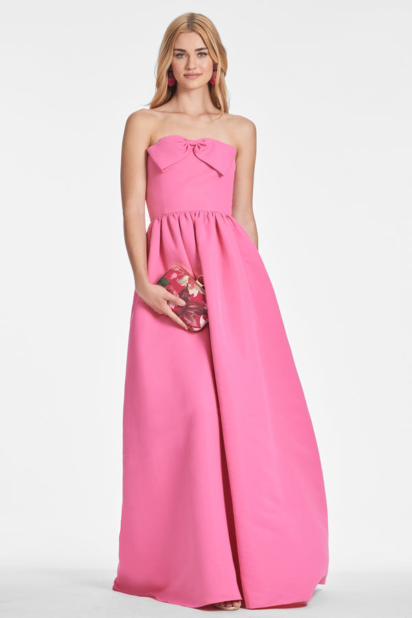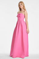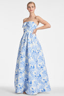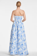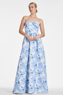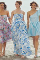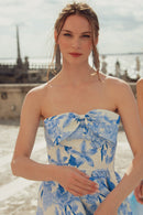 Meet the Isabeau Gown: a vision in blue floral! The strapless bodice is accentuated by an oversized bow that cascades down into a pleated A-line shape. For any warm weather gala, wedding, or event, you've found the chicest summer soiree look.